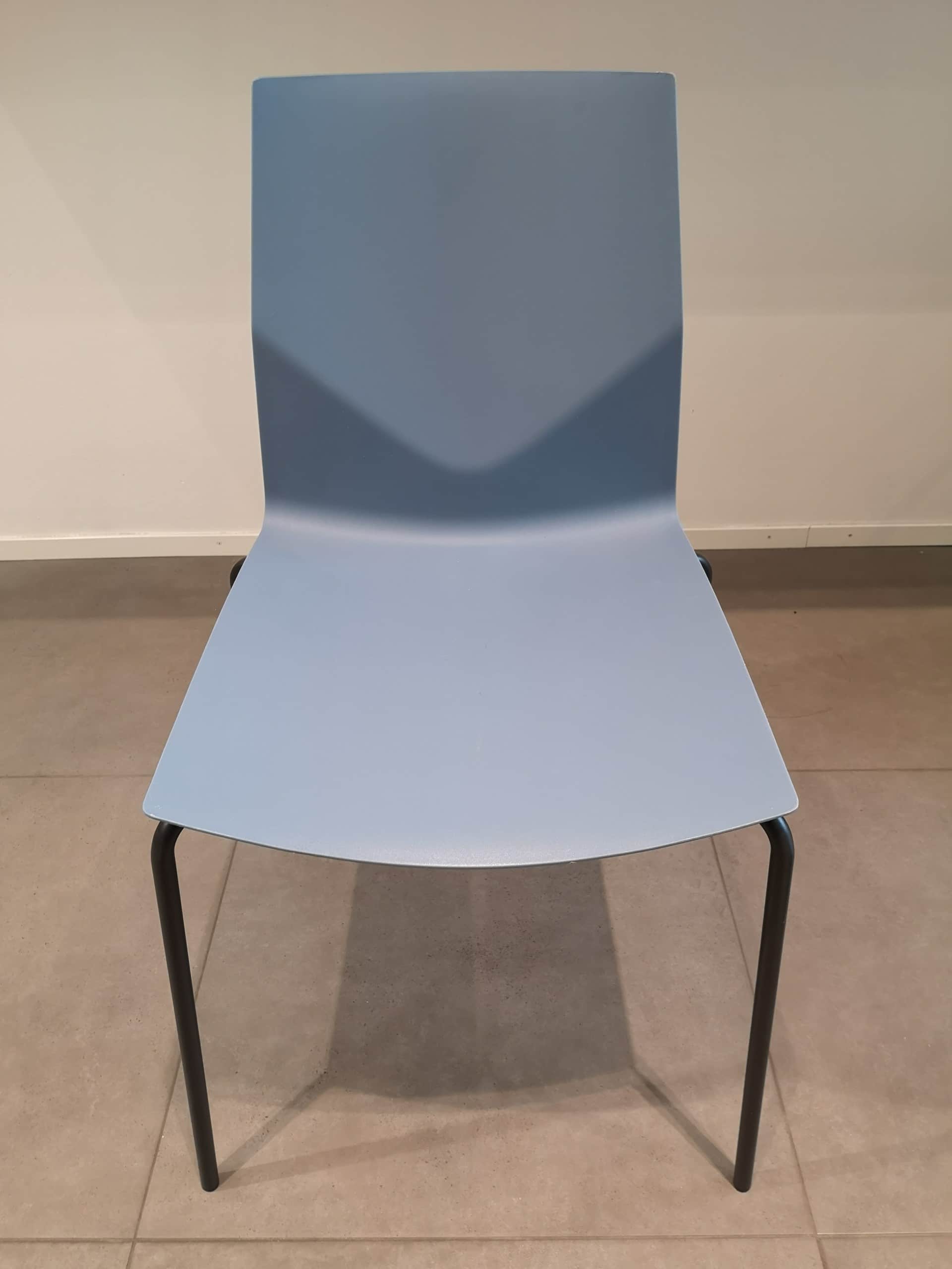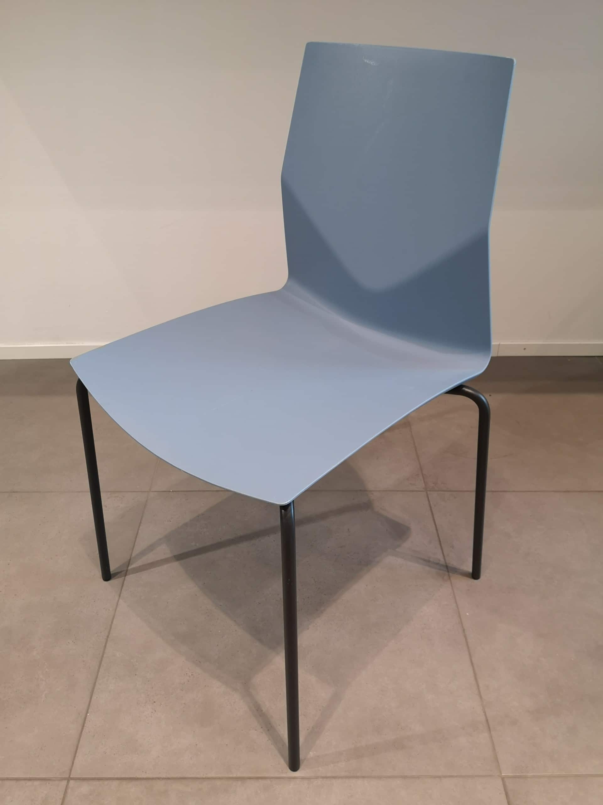 Sæde og ryg i plast (blå). 4-bensstel i metal (sort).