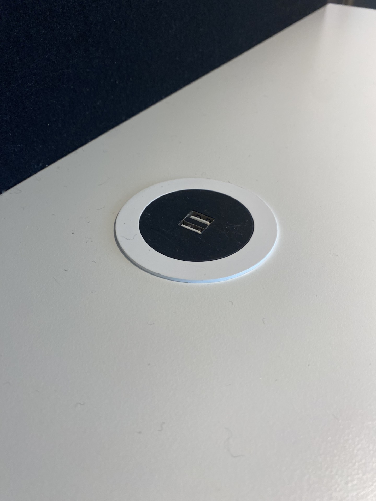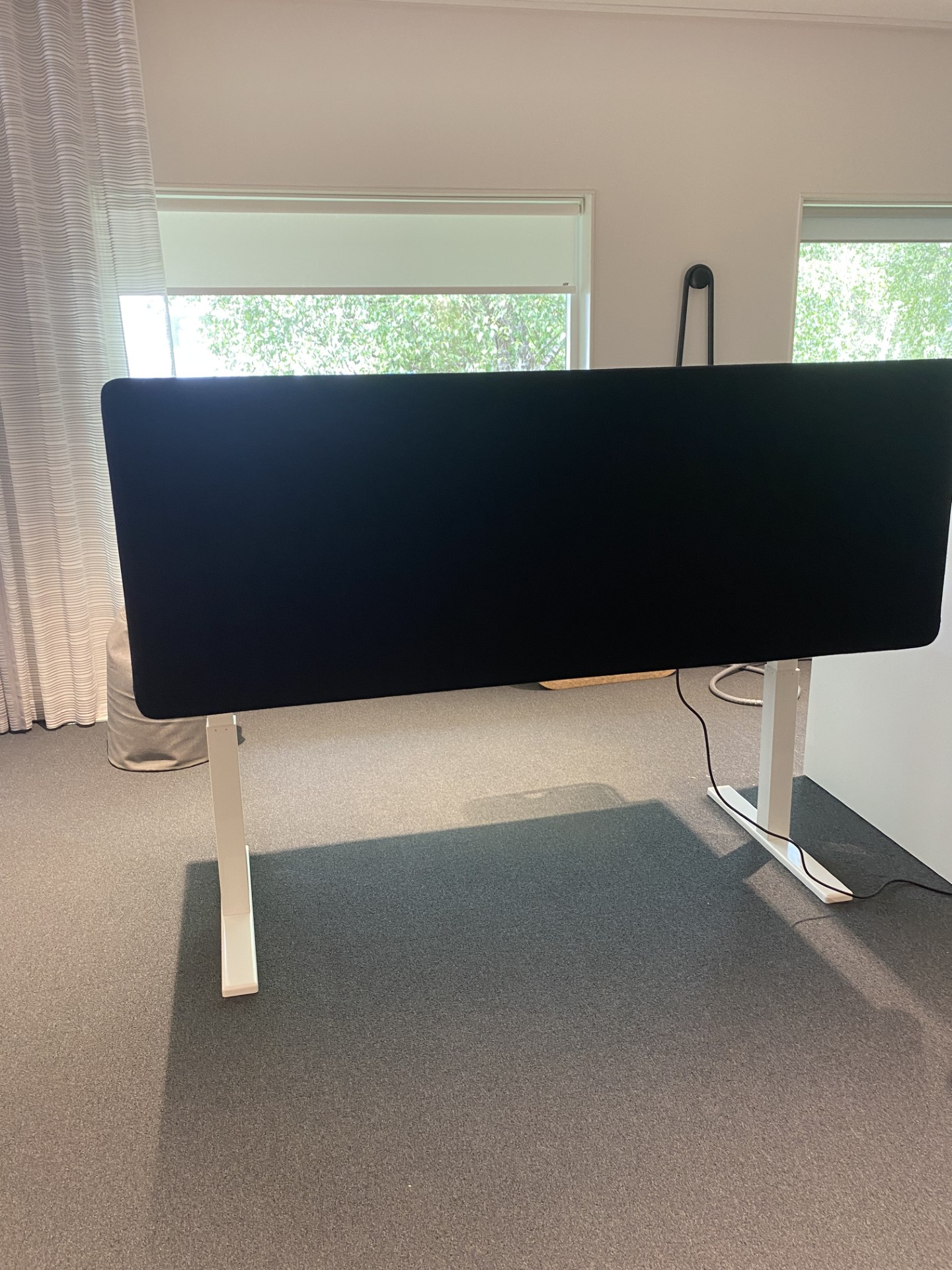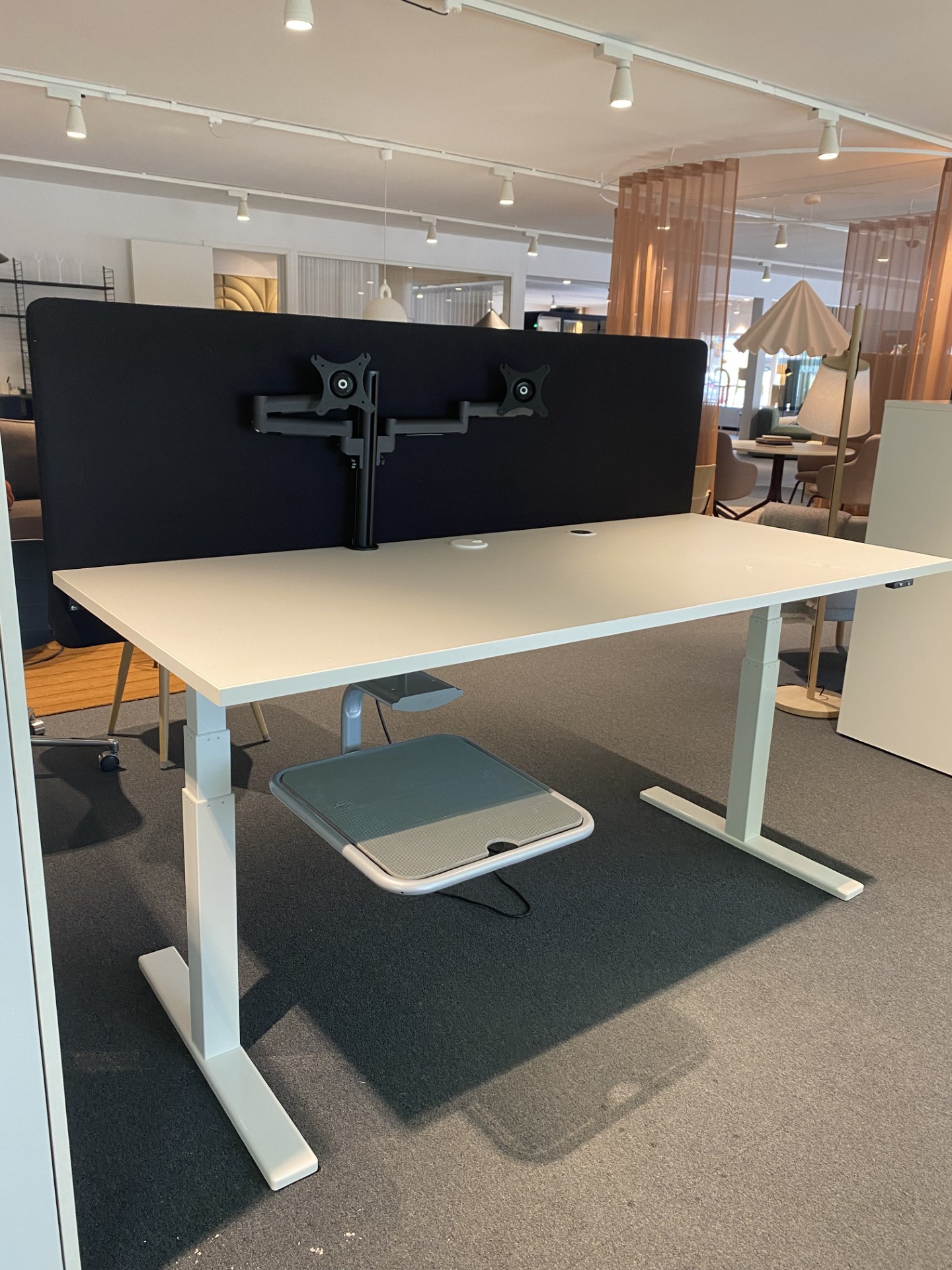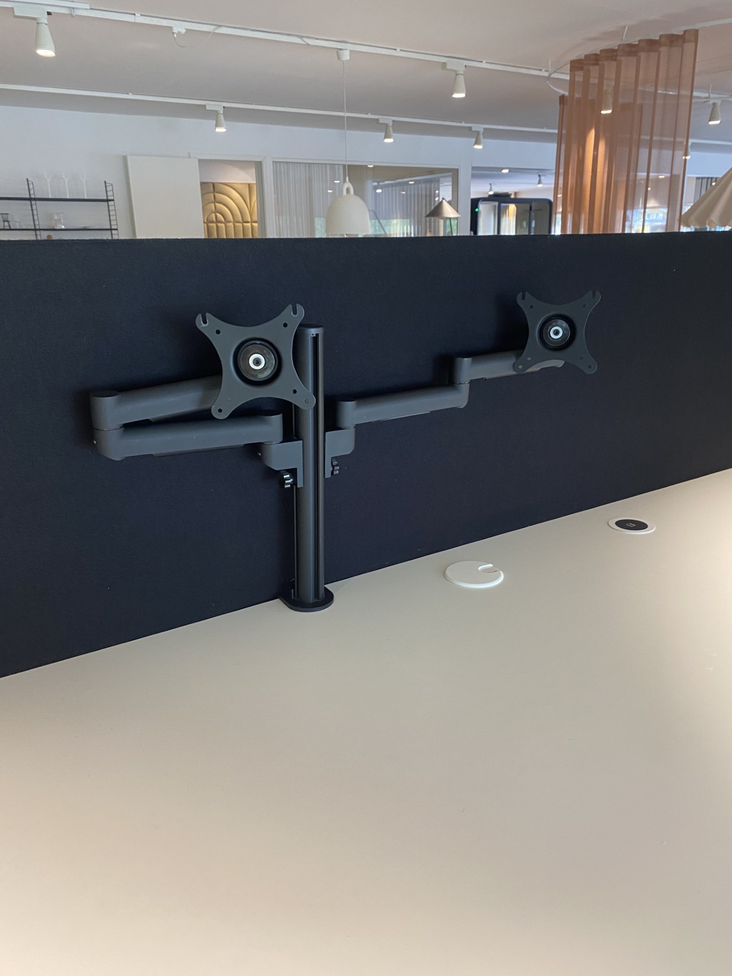 Bordsskärm, kabelränna, monitorarm, uttag.