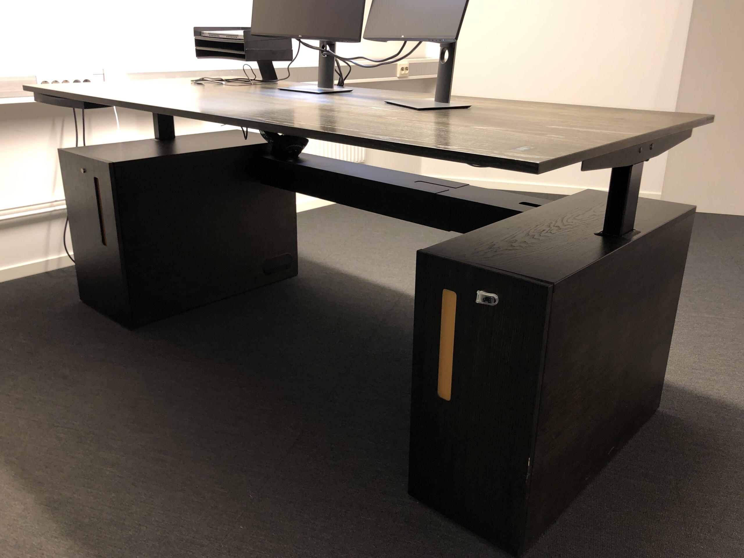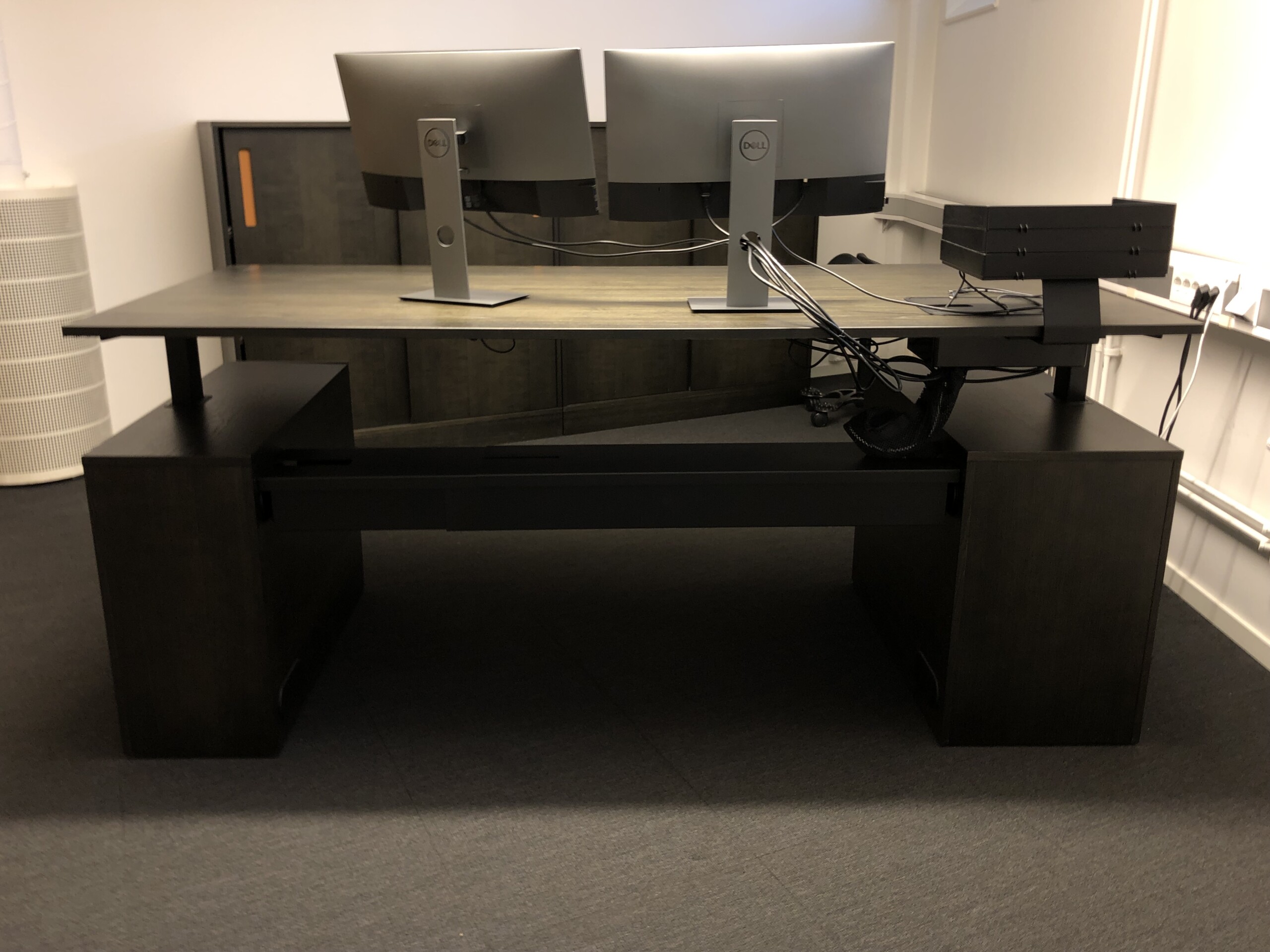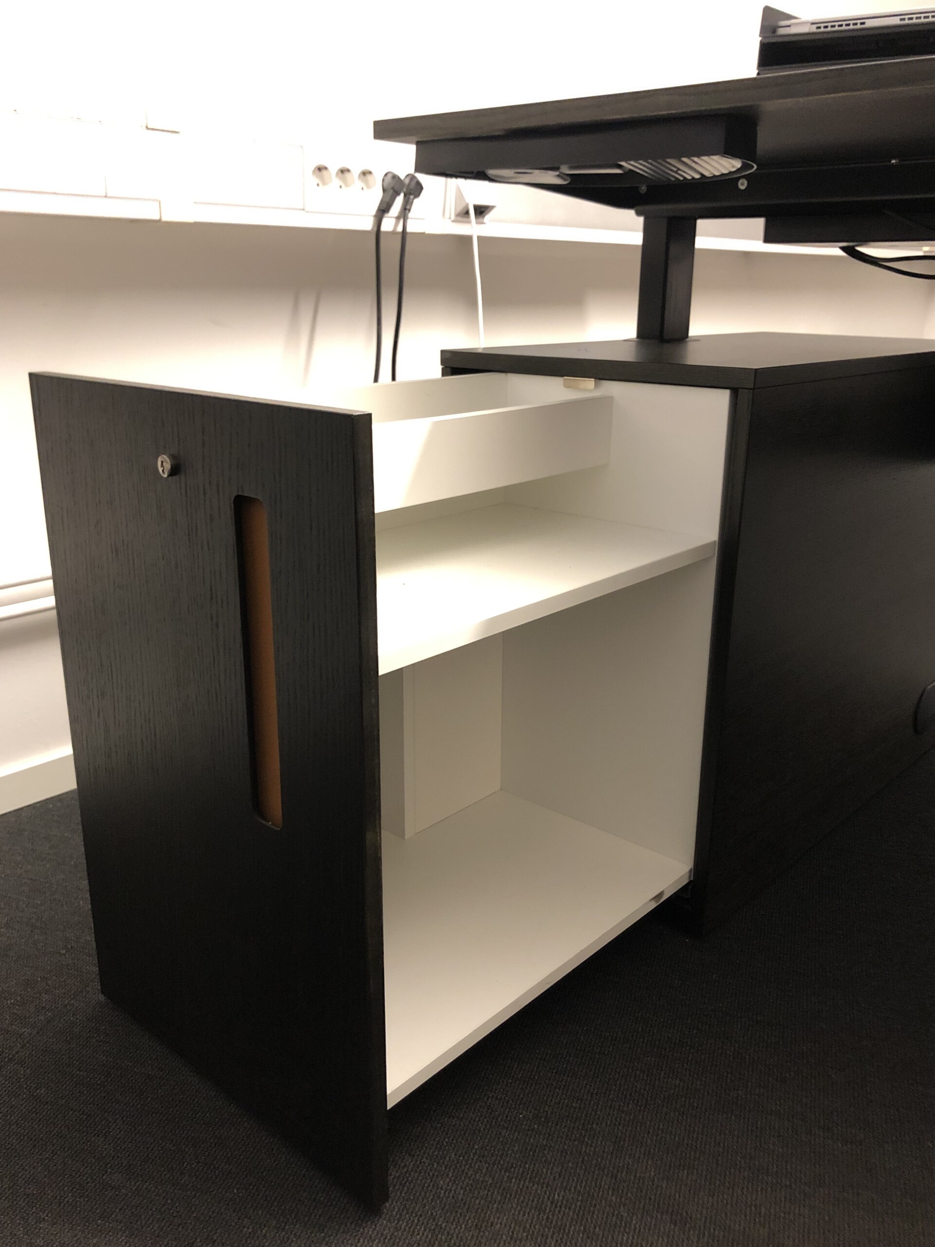 Bordplade og understel i træ (sort). Højdejusterbar.