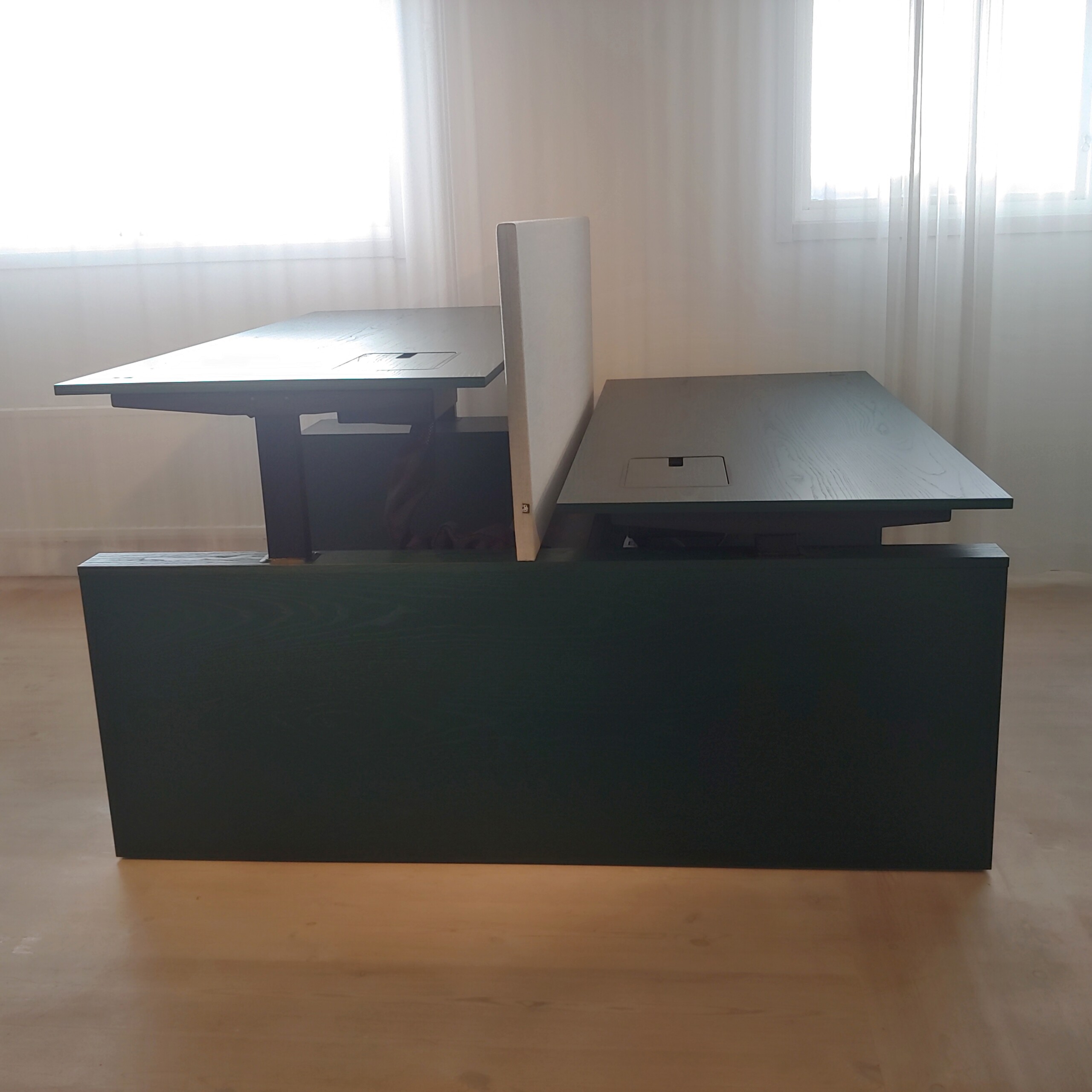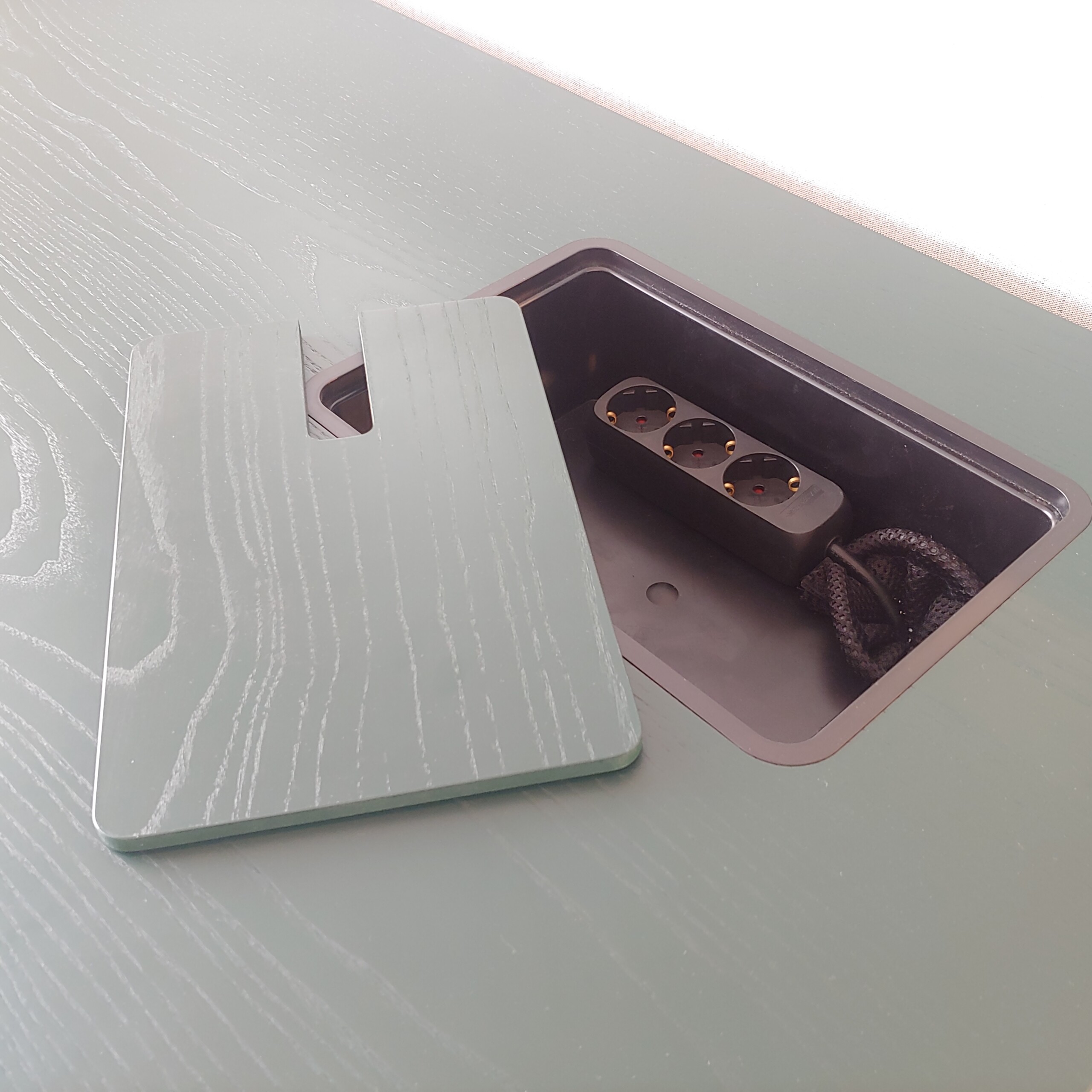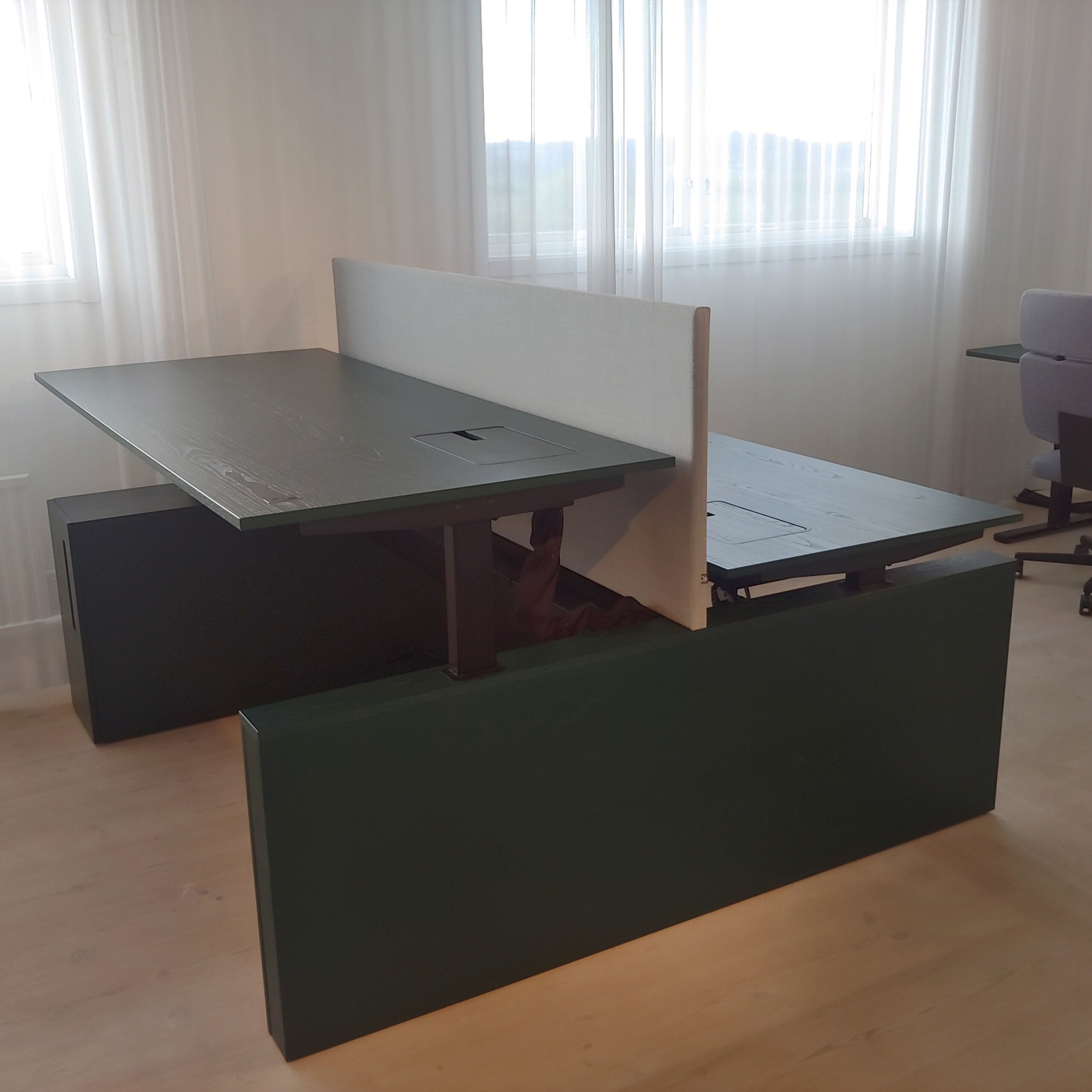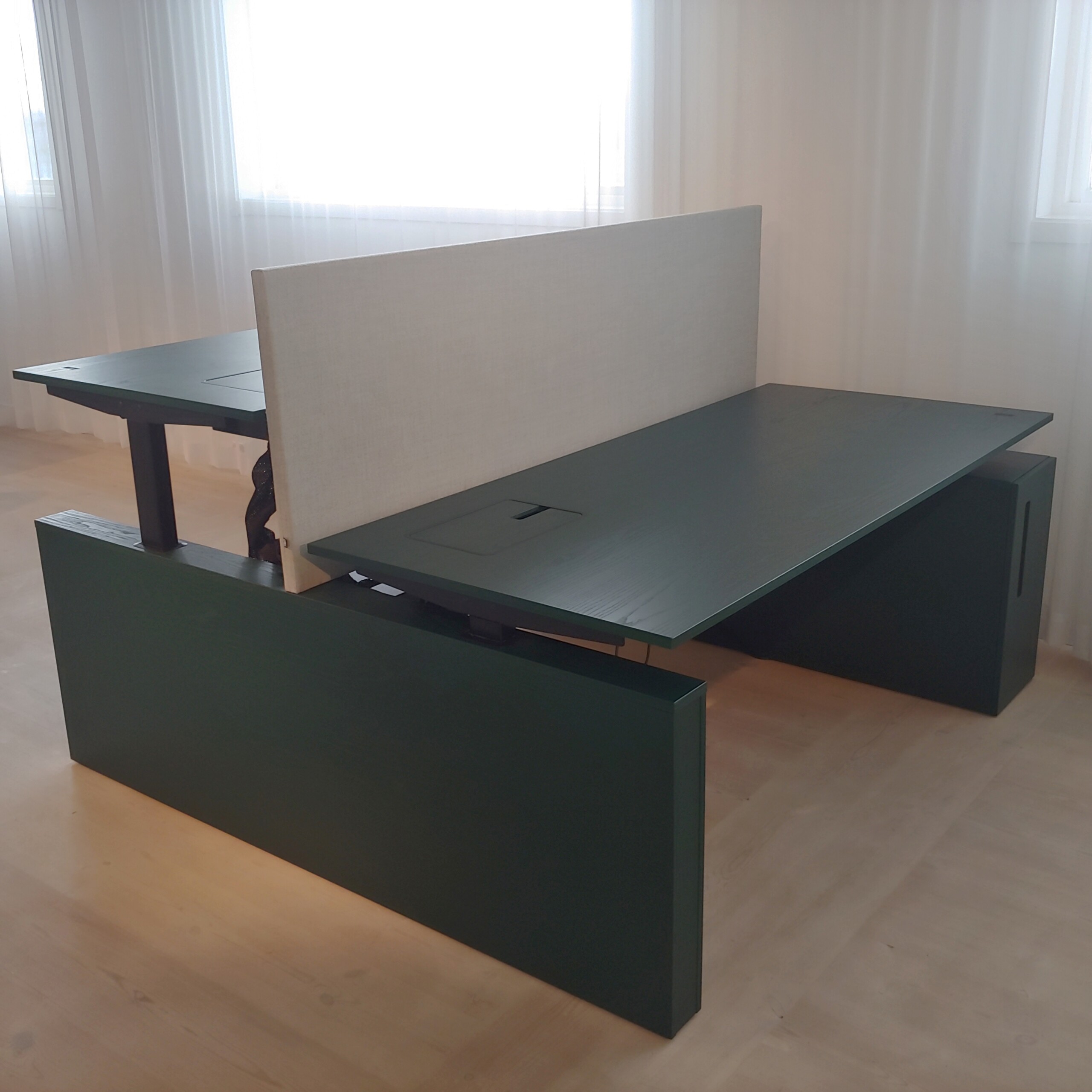 Bordplade og understel i træ (grøn). Højdejusterbar.