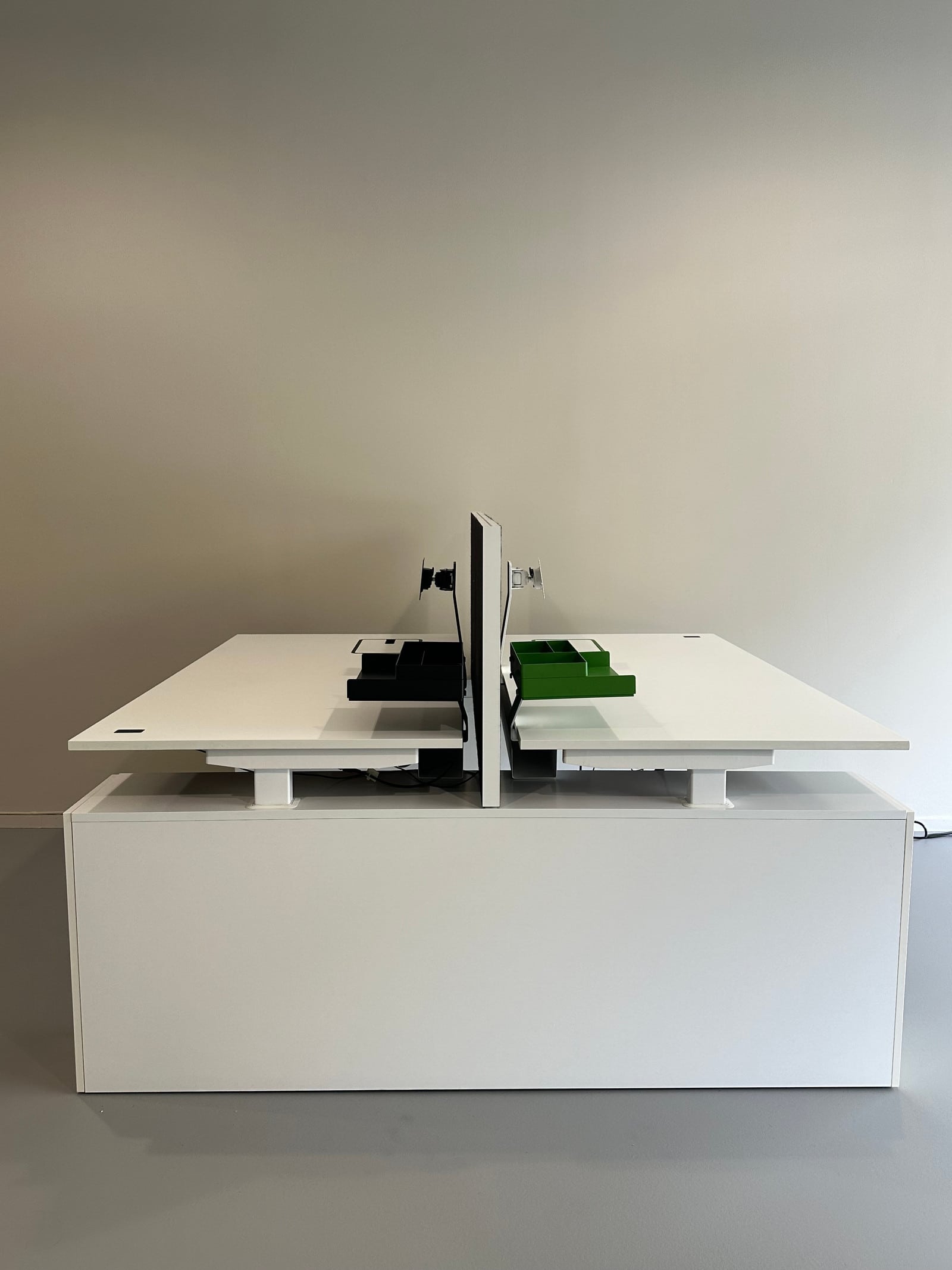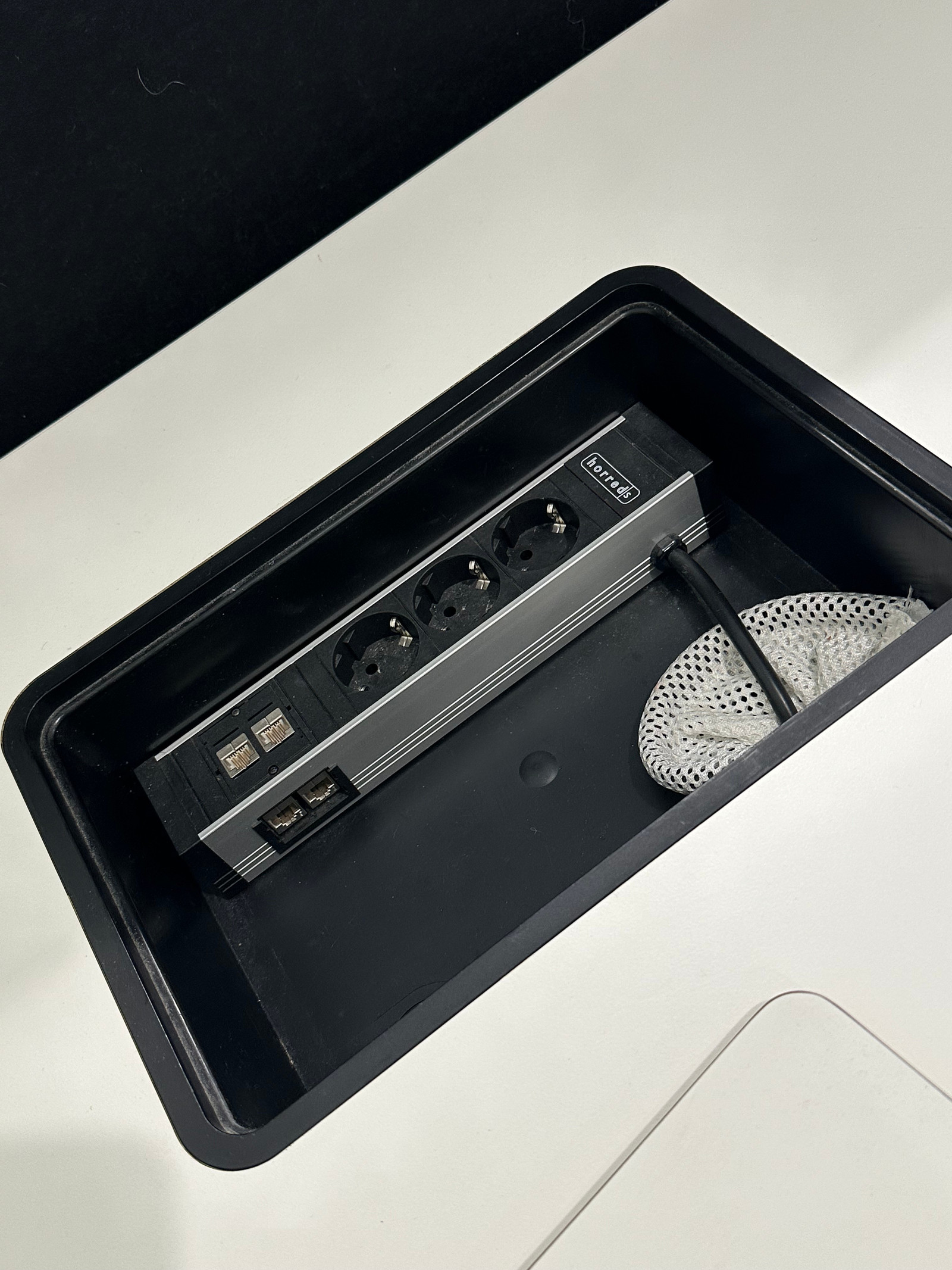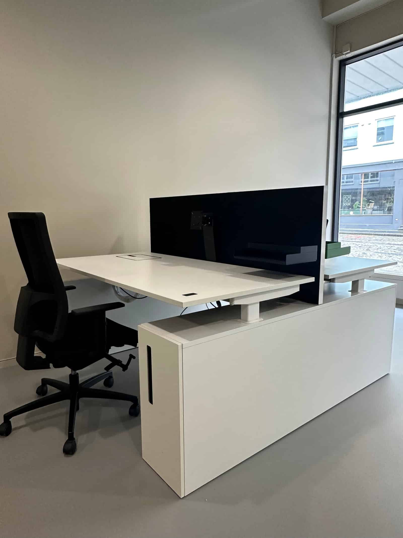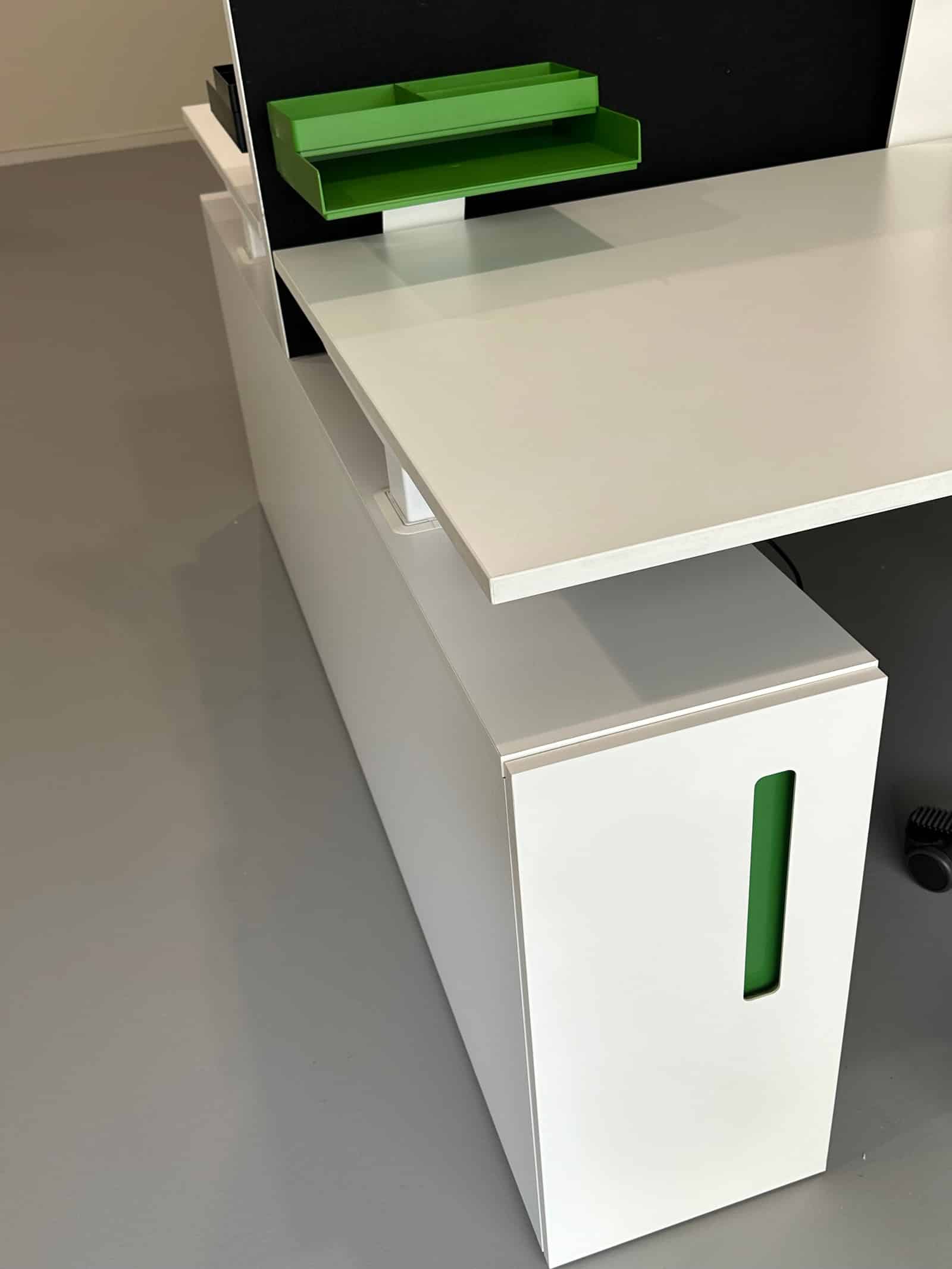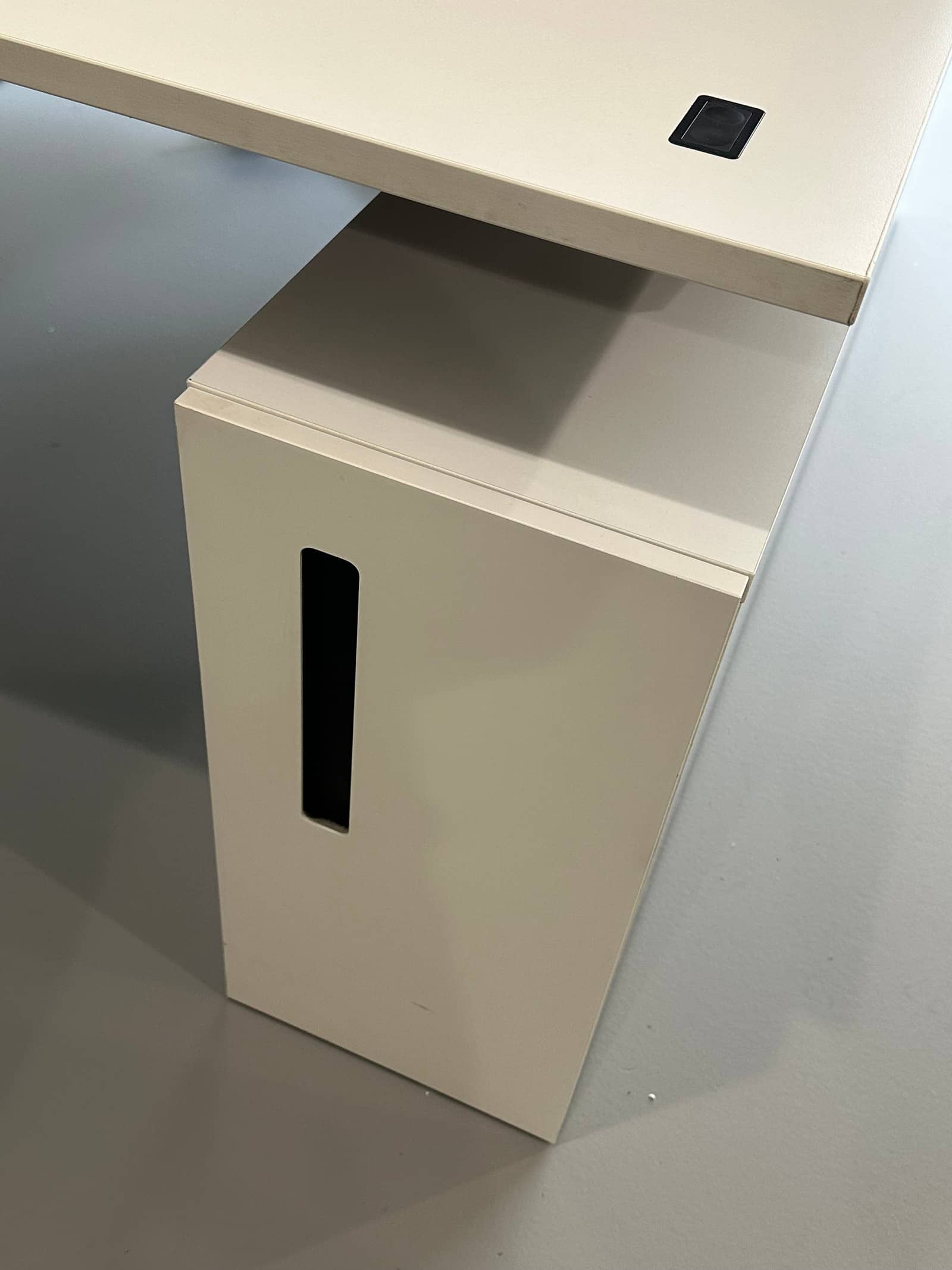 Bordsskärm, funktionslist, kabelränna, monitorarm, uttag.