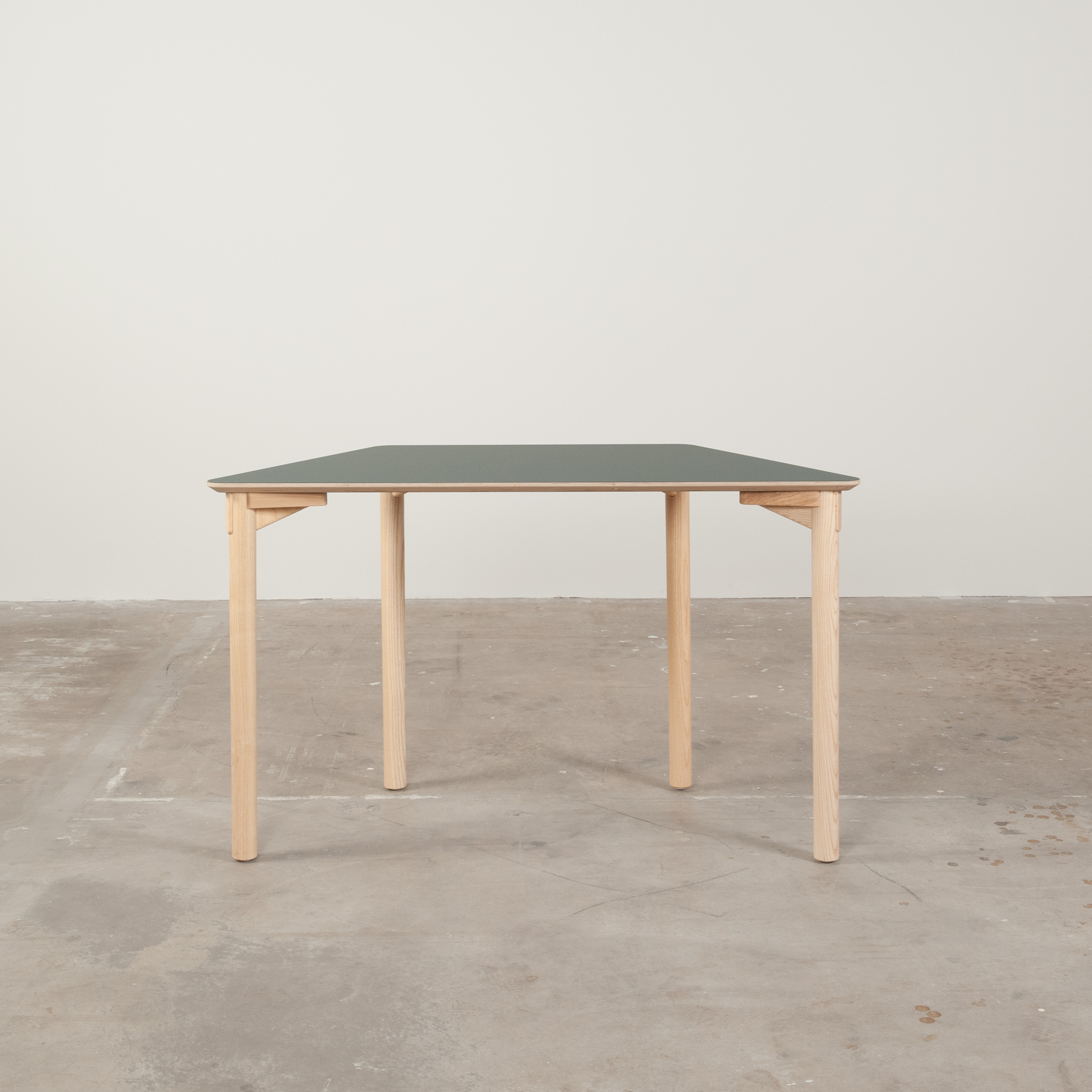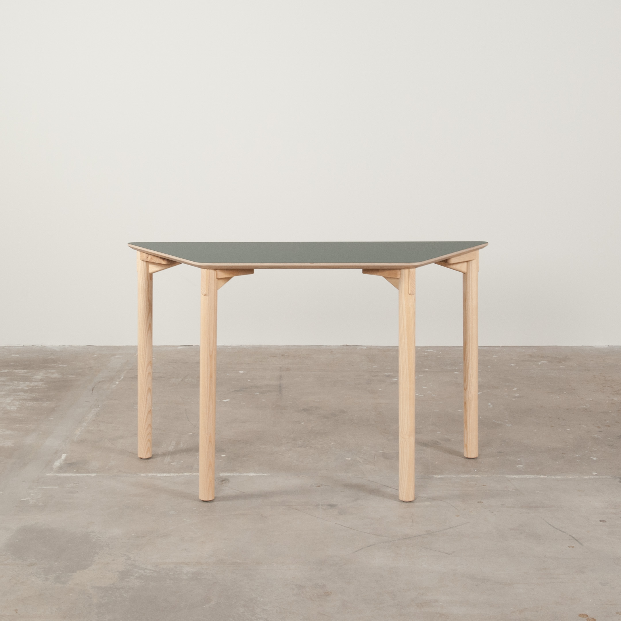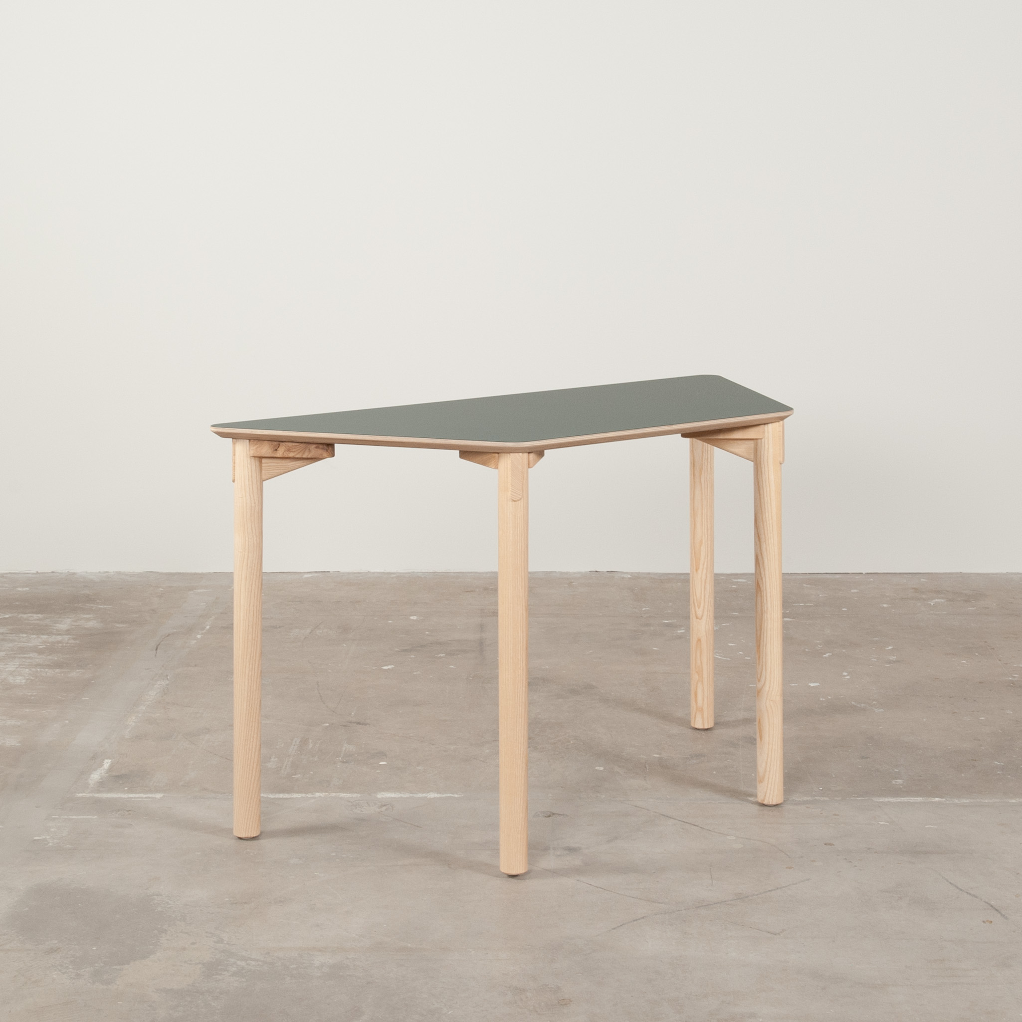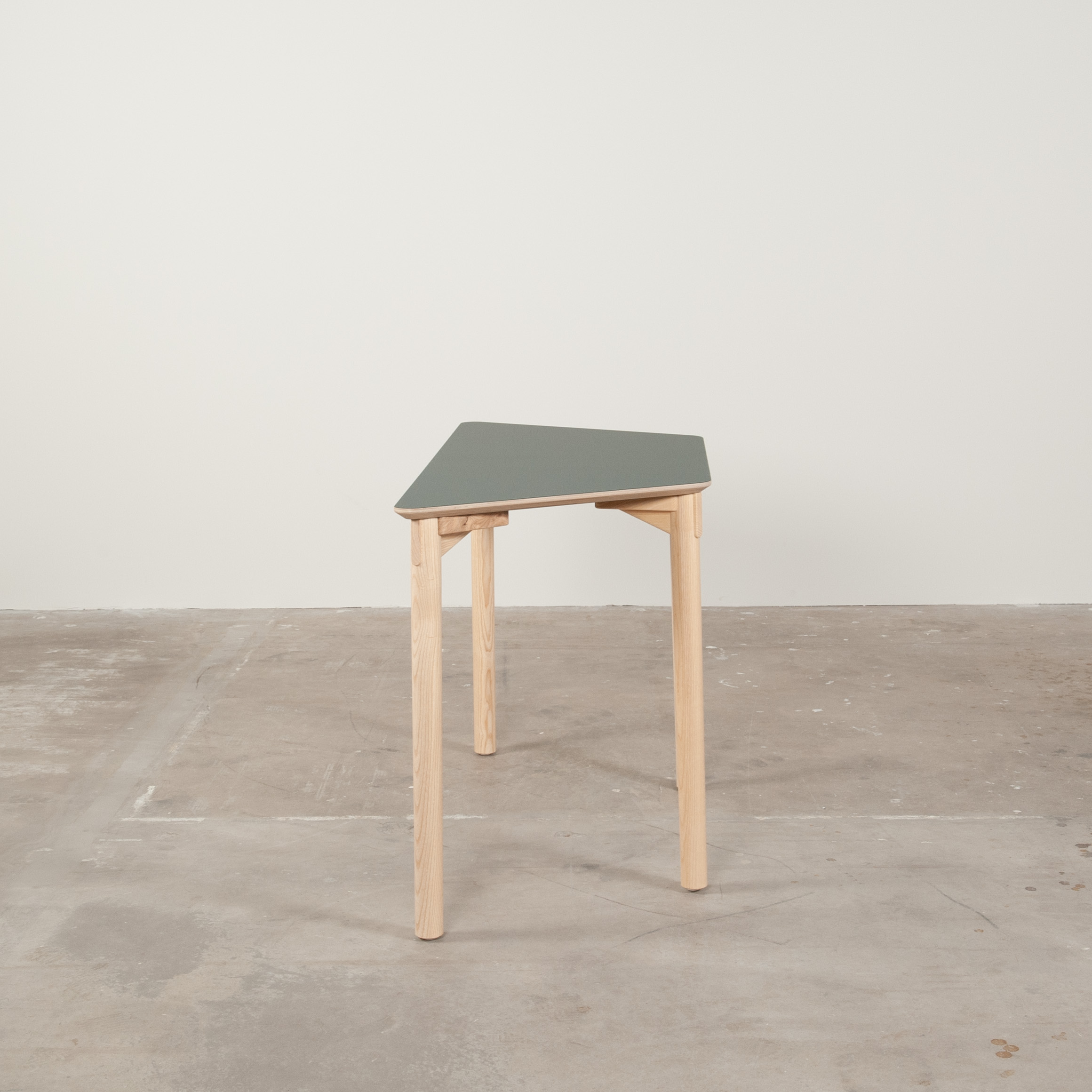 Bordplade i laminat (grøn). Understel i træ (ask).