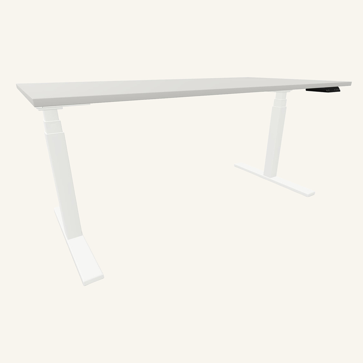 Bordplade i laminat (grå). Understel i metal (hvid). Højdejusterbar.