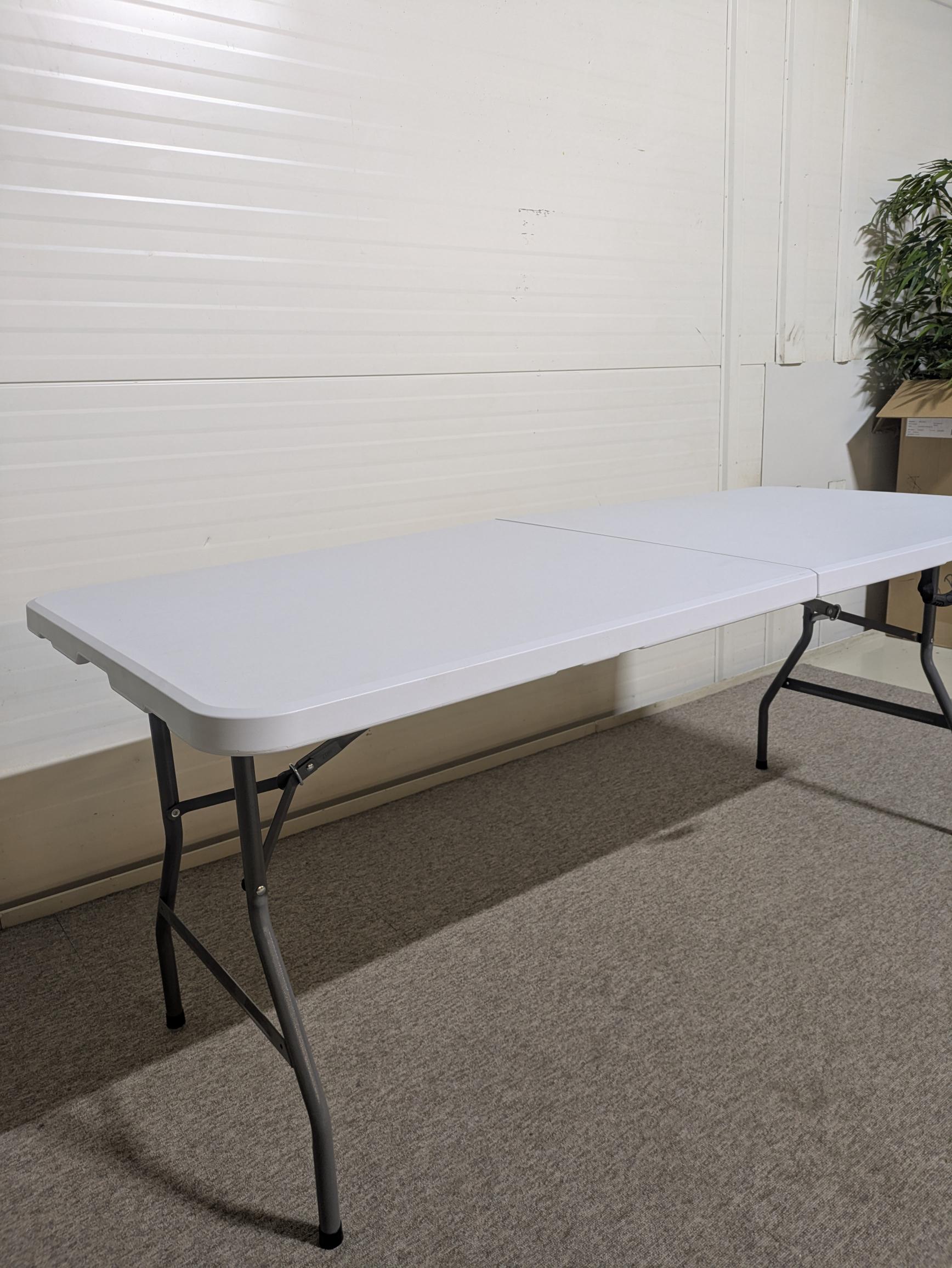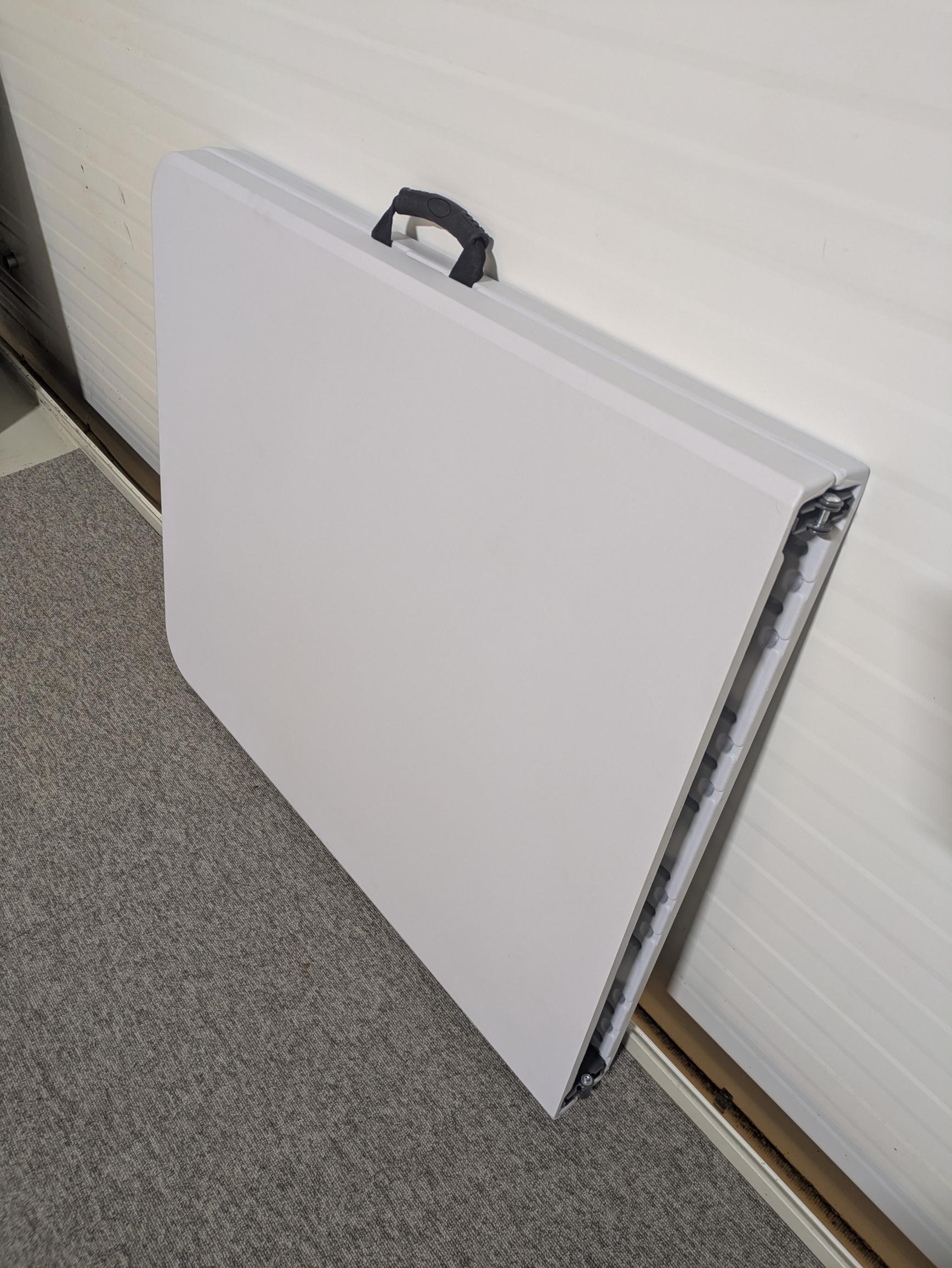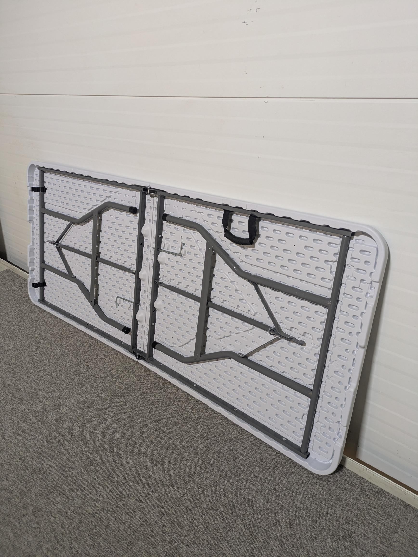 Bordplade i plast (hvid). Understel i metal (grå).