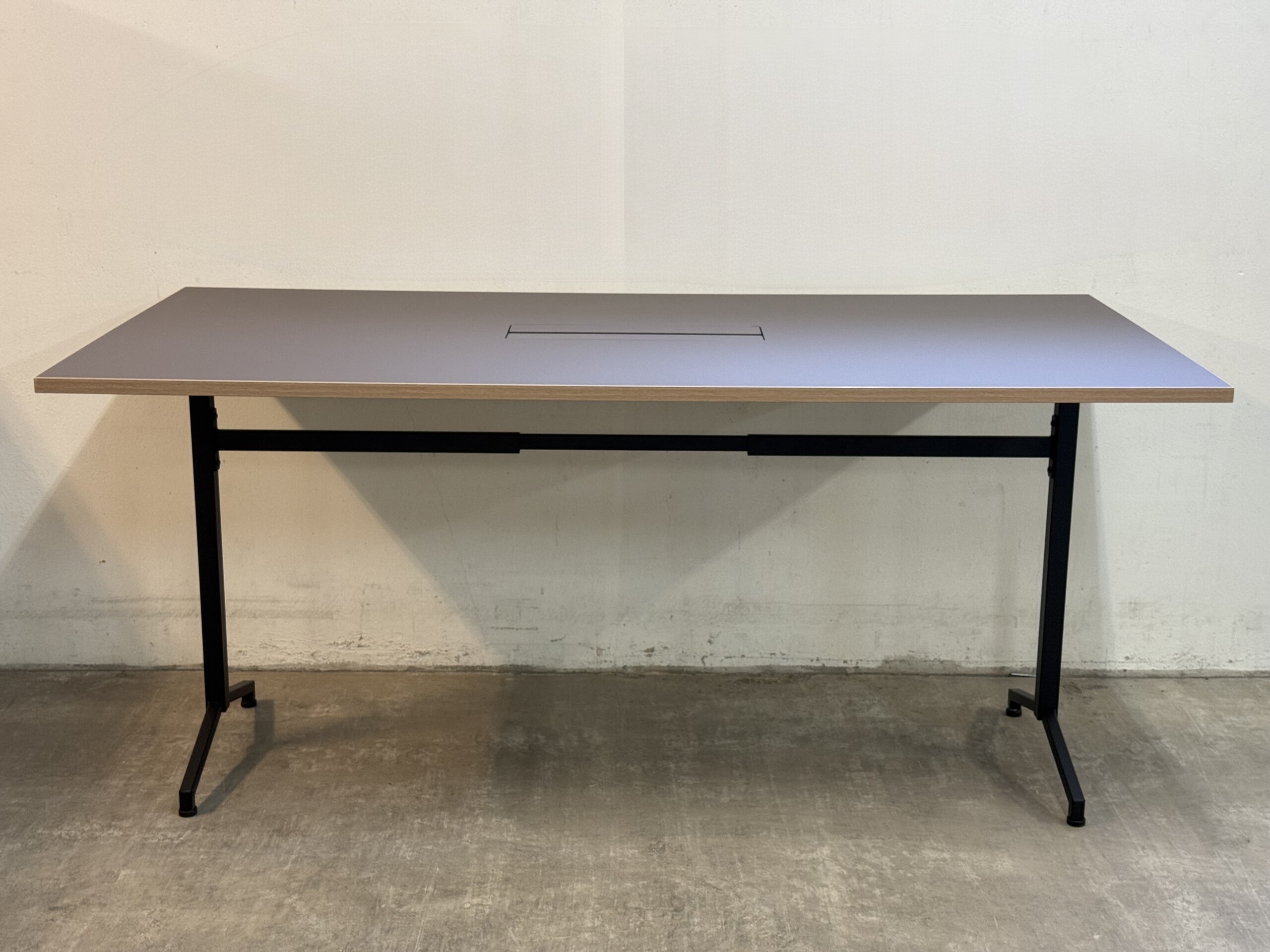 Bordplade i linoleum (brun). Understel i metal (sort).