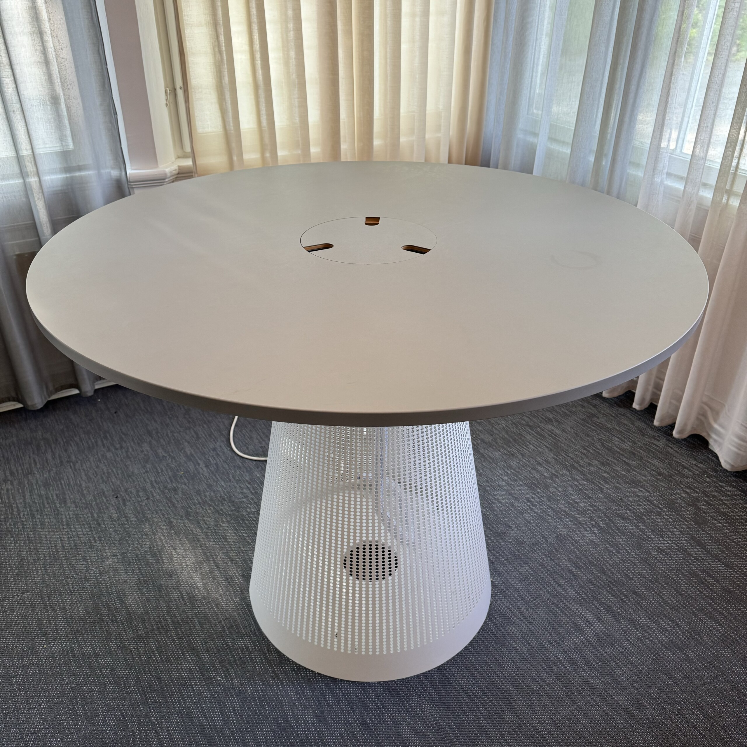 Bordplade i linoleum (grå). Understel i metal (hvid).