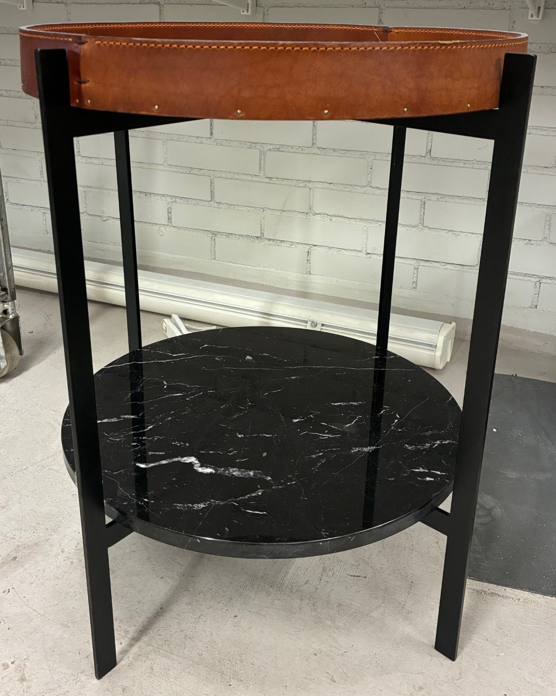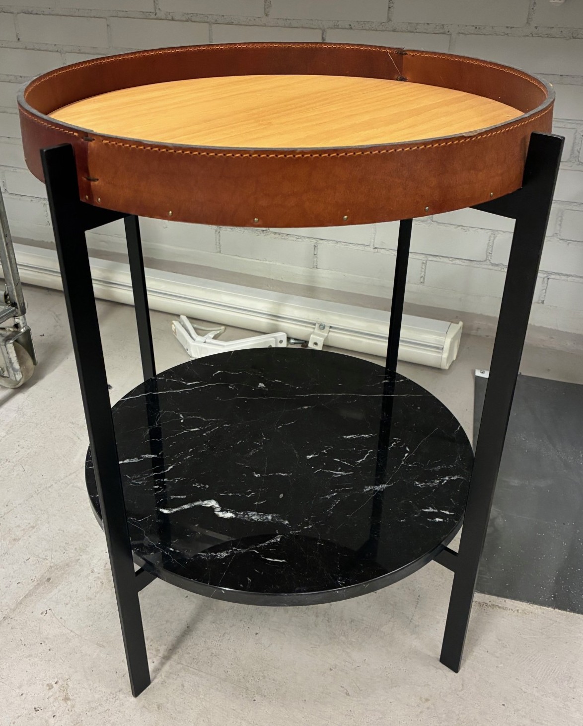 Bordplade i træ (eg). Understel i metal (sort).