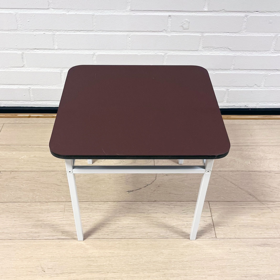 Bordplade i linoleum (rød). Understel i metal (hvid).