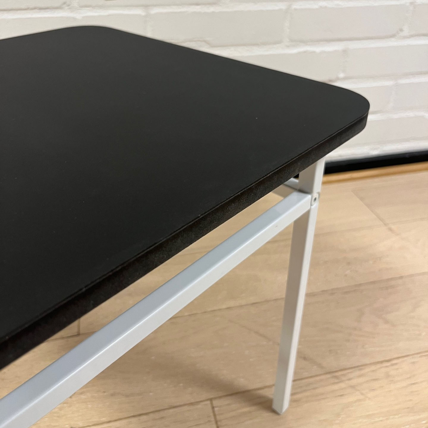 Bordplade i linoleum (sort). Understel i metal (hvid).