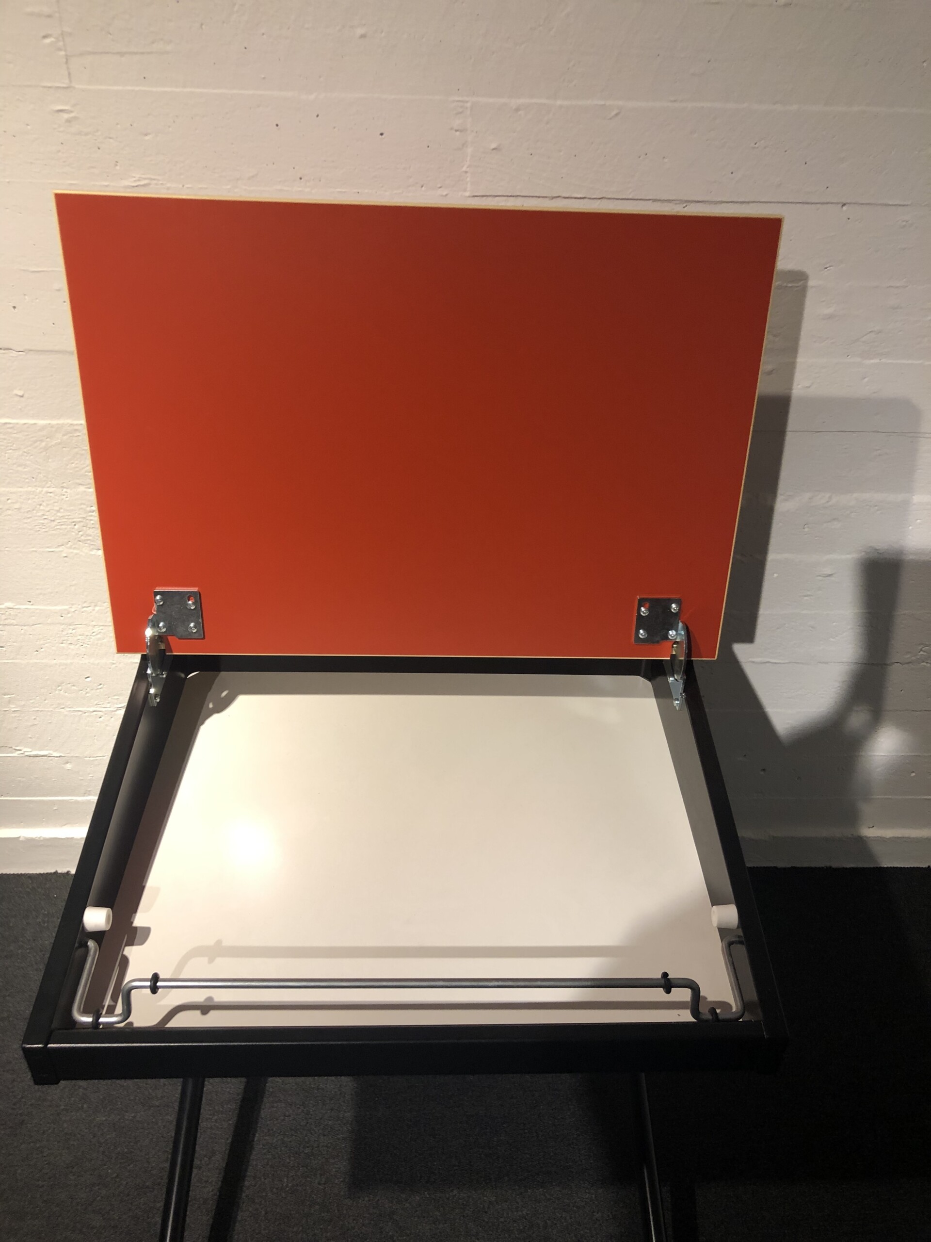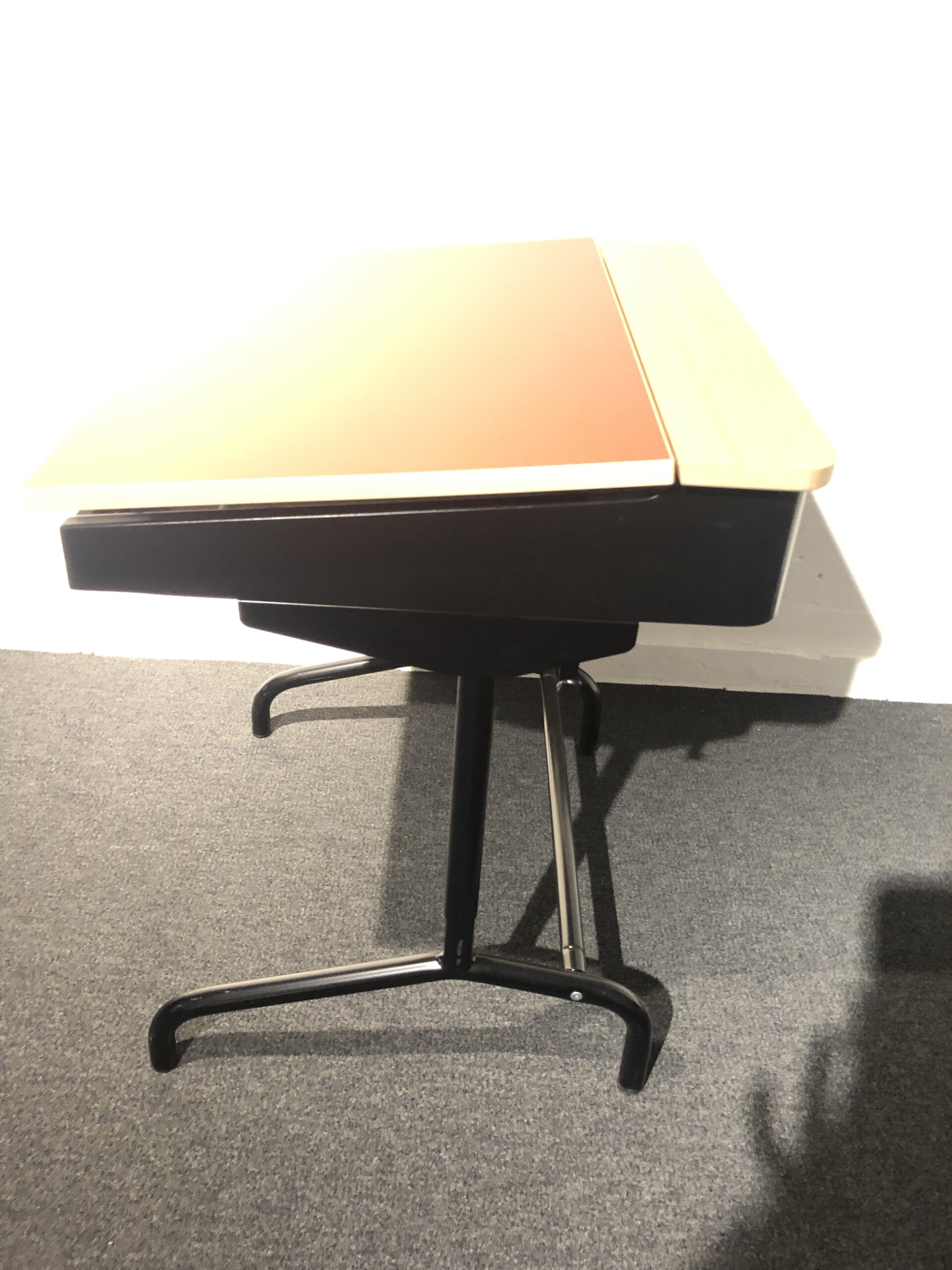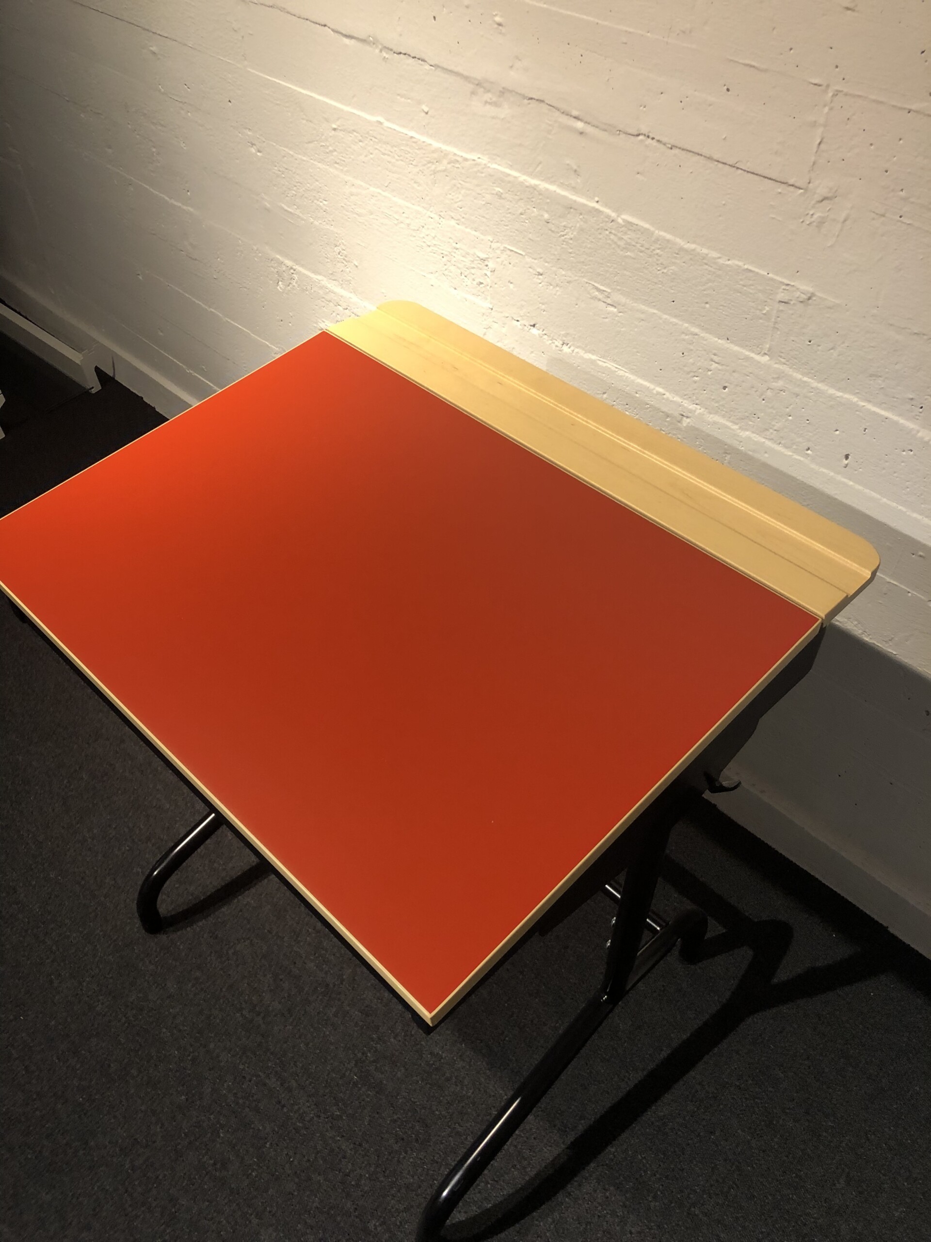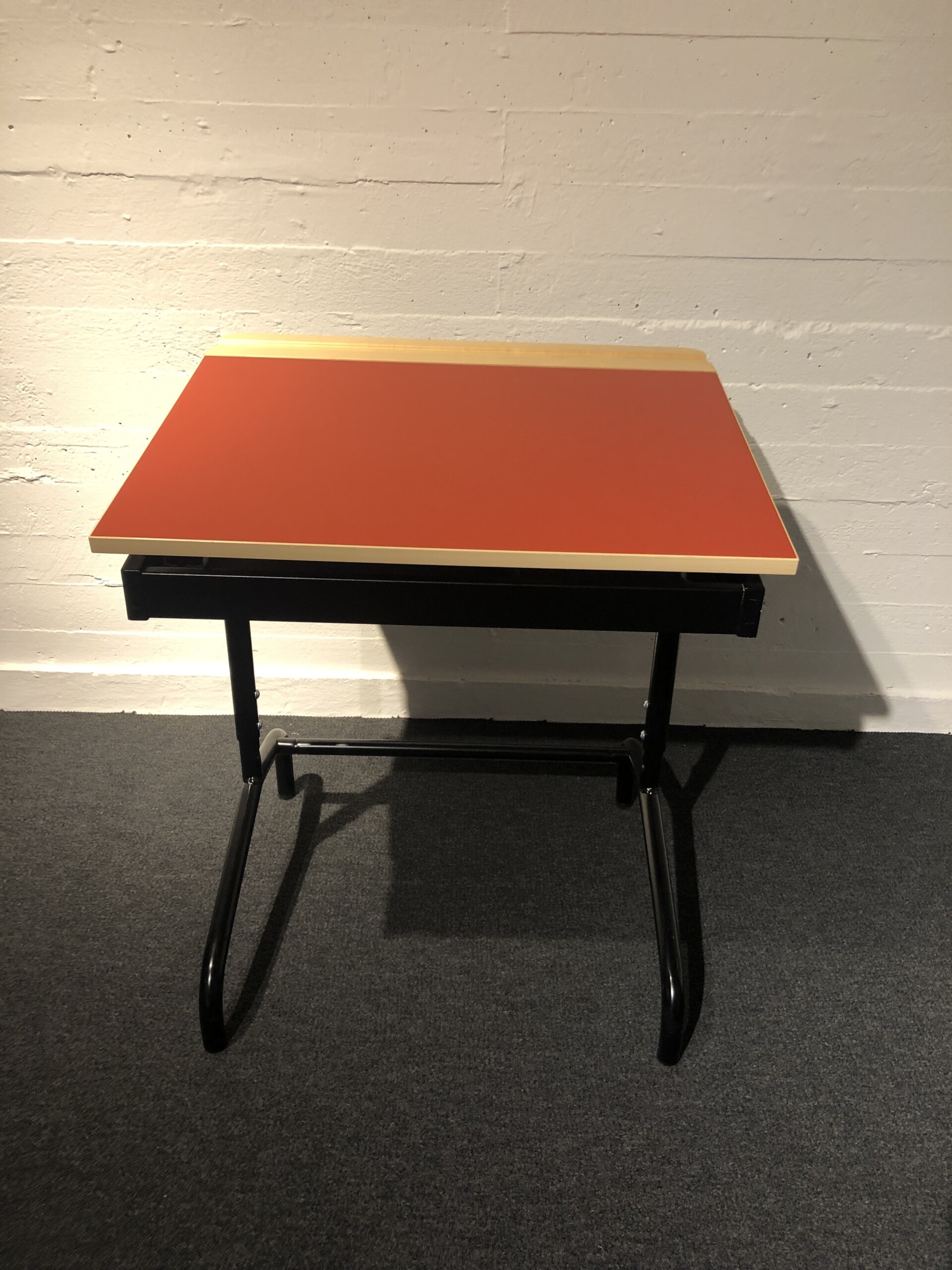 Bordplade i laminat (rød). Understel i metal (sort). Højdejusterbar.