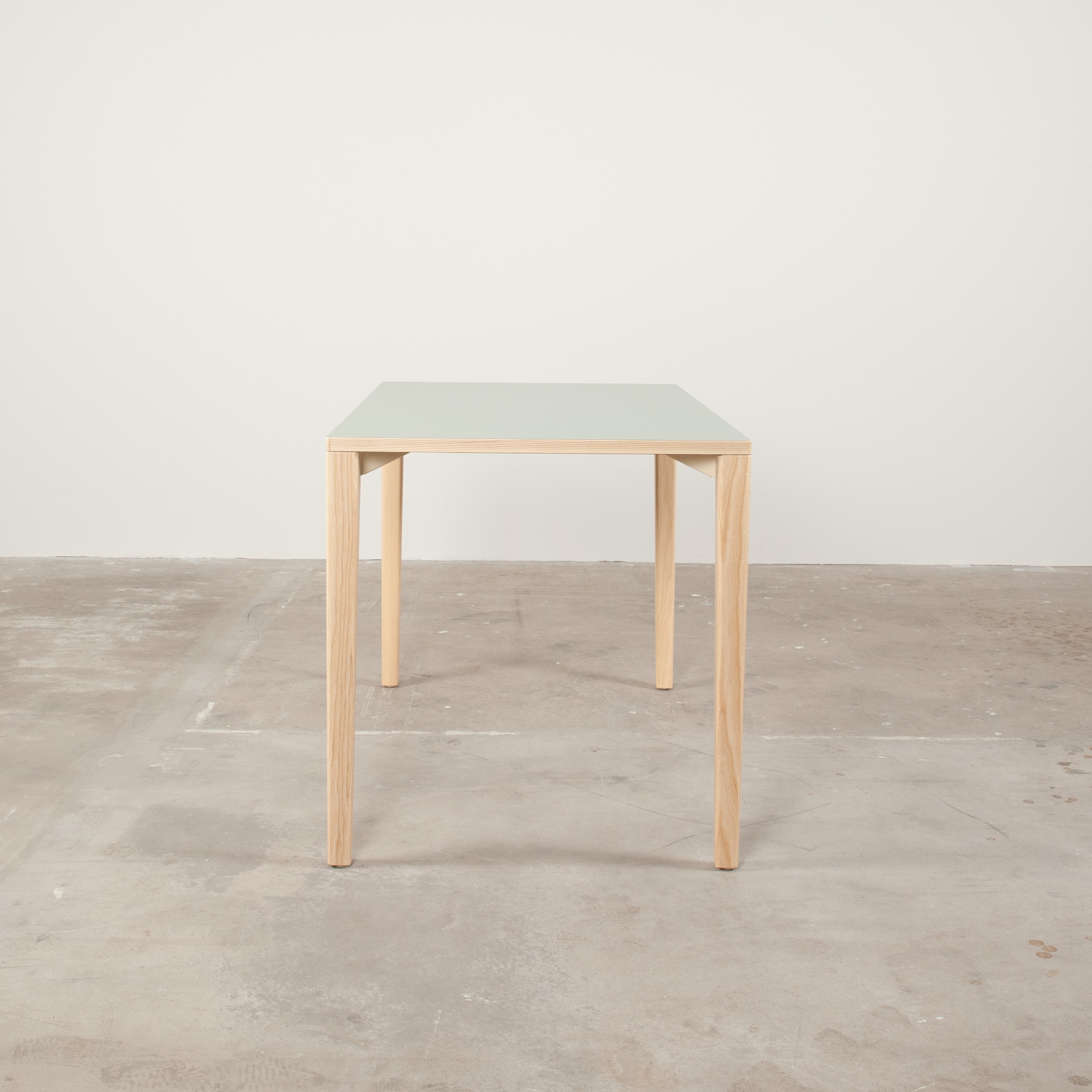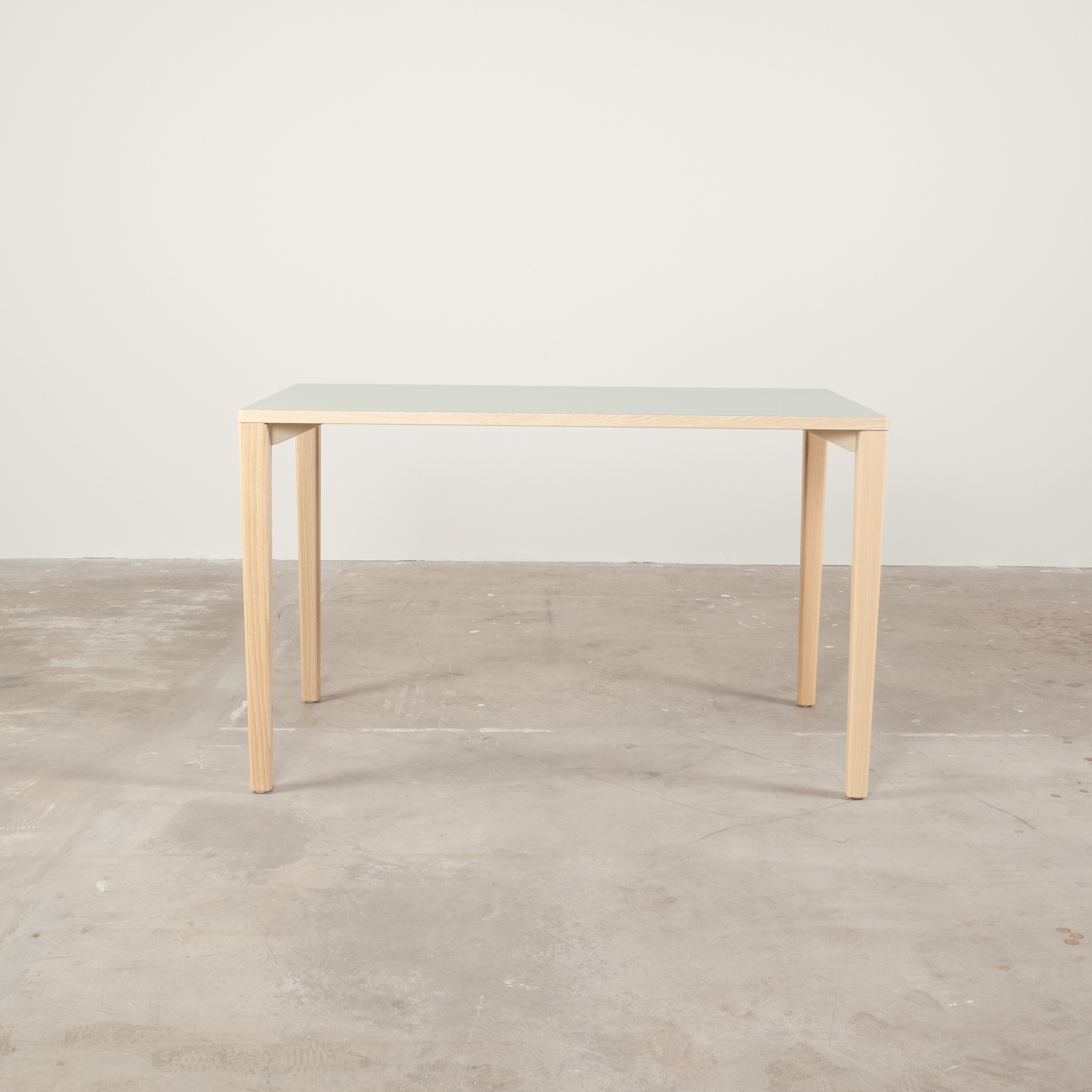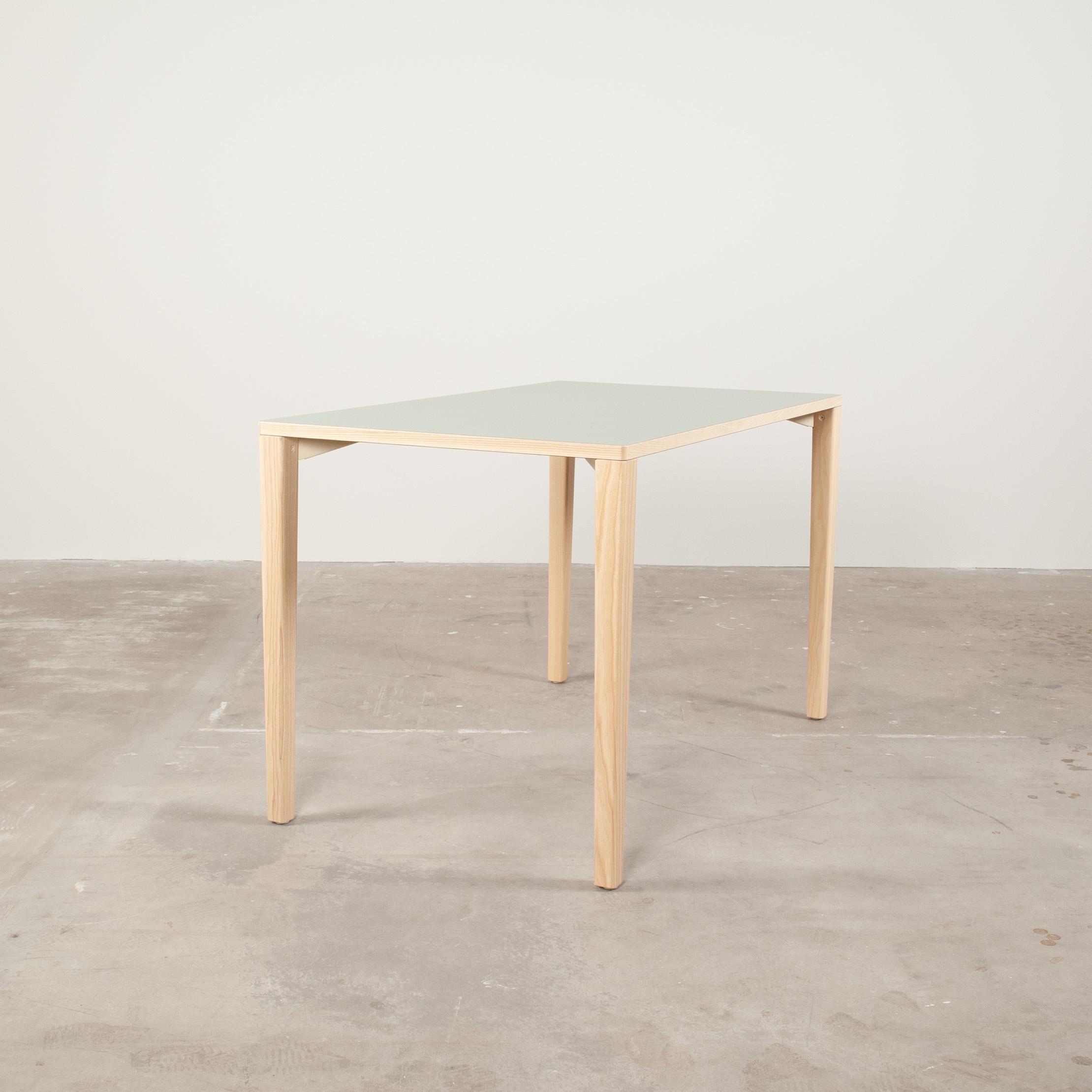 Bordplade i laminat (grøn). Understel i træ (ask).