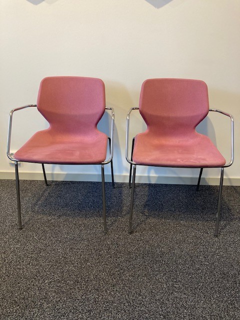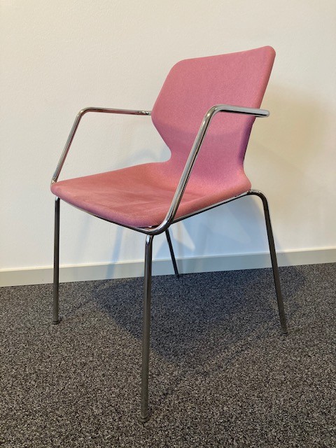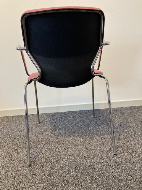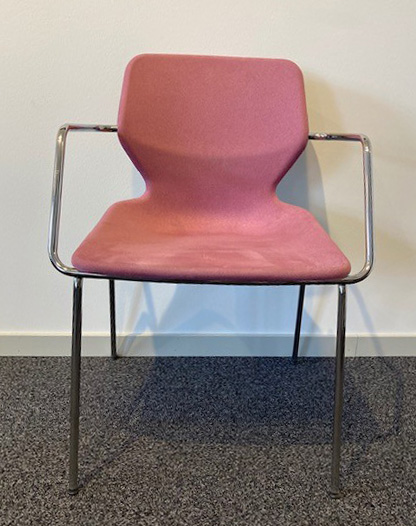 Sæde og ryg i stof (lyserød). 4-bensstel i metal (krom).