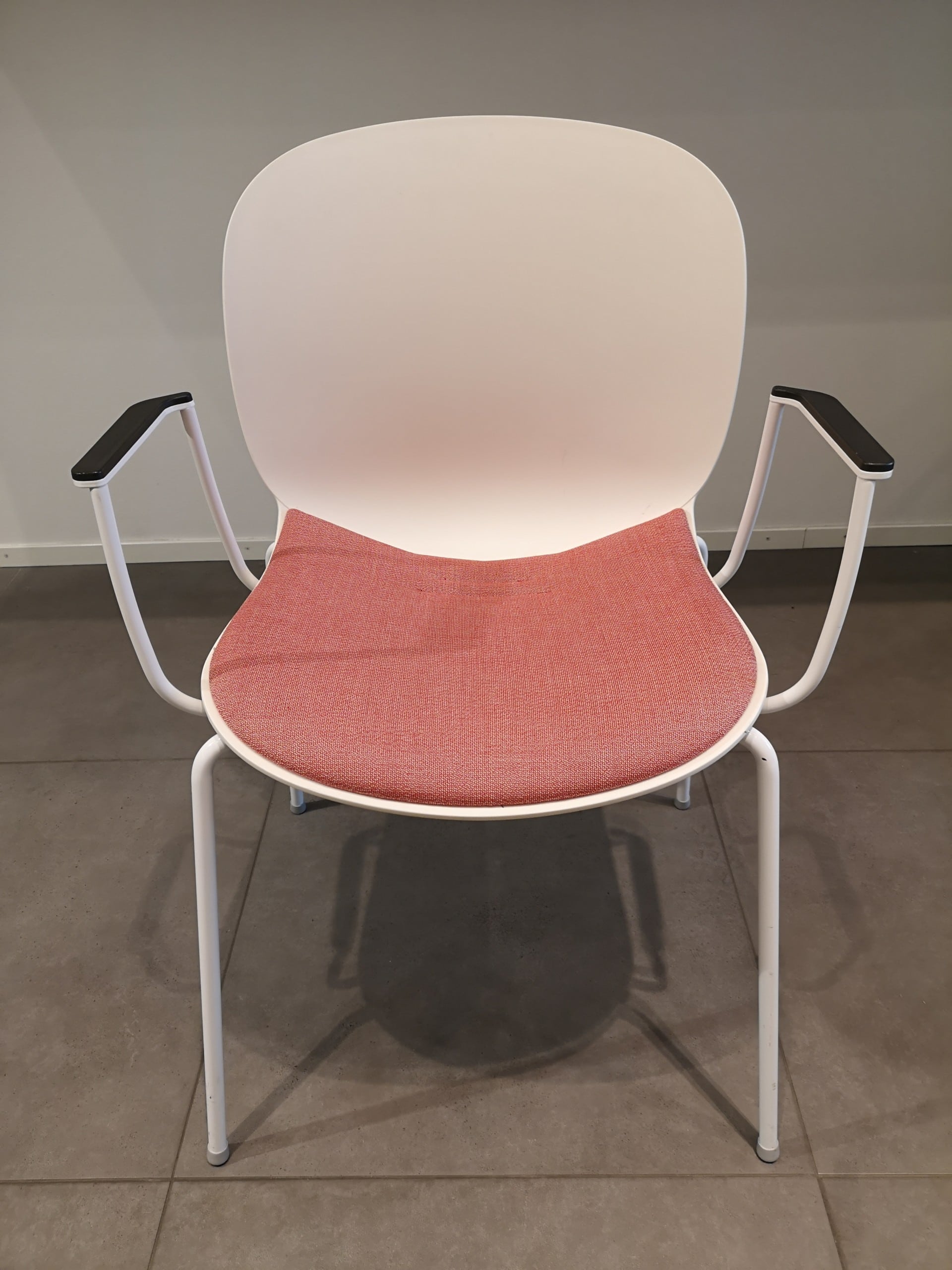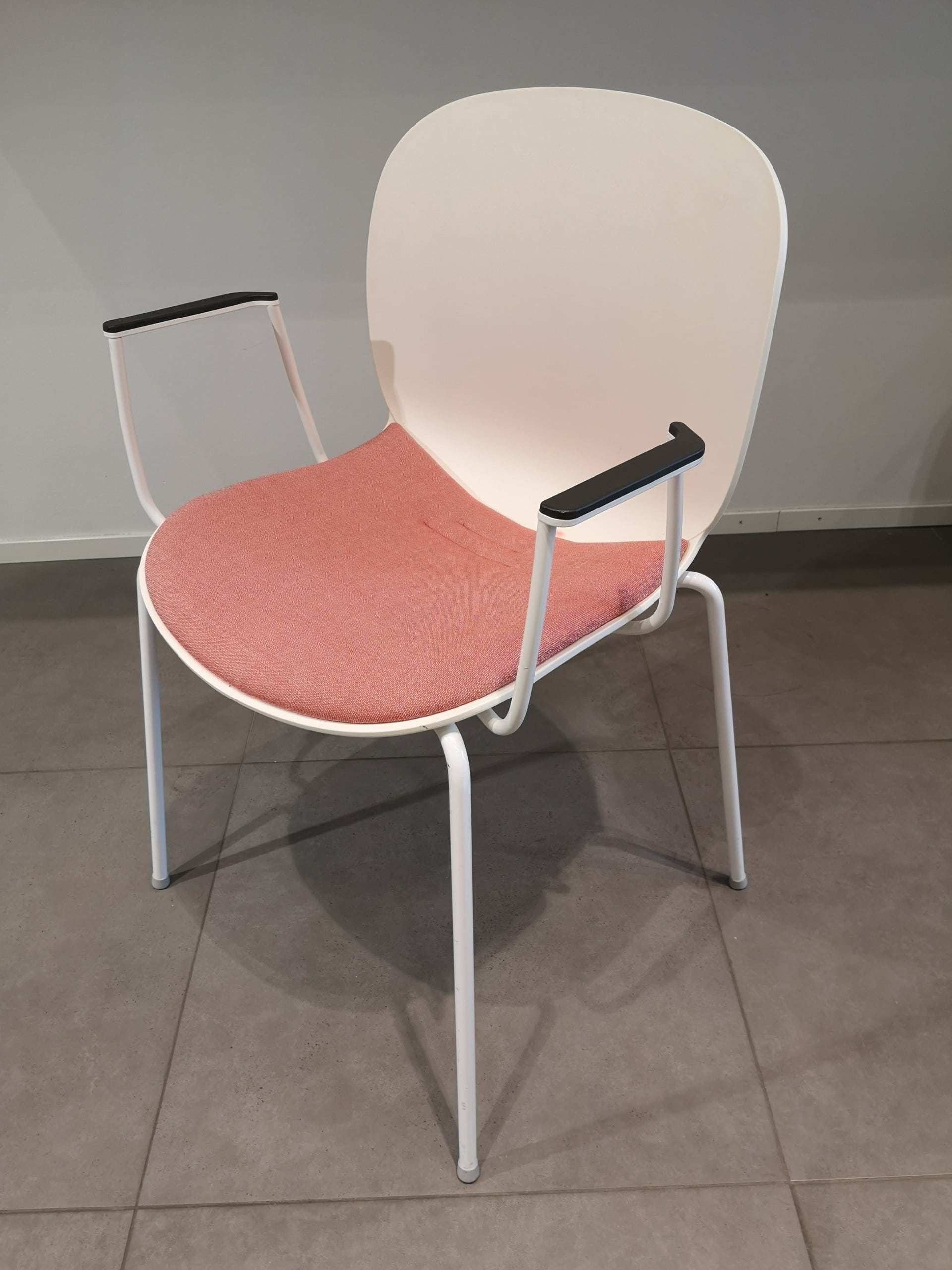 Sæde i stof (lyserød). Ryg i plast (hvid). 4-bensstel i metal (hvid).