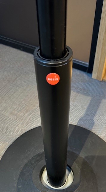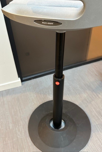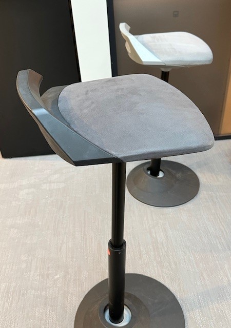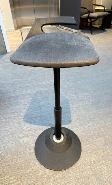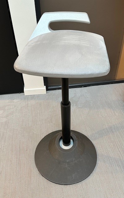Sæde i stof (grå). Søjlefod i metal (sort).