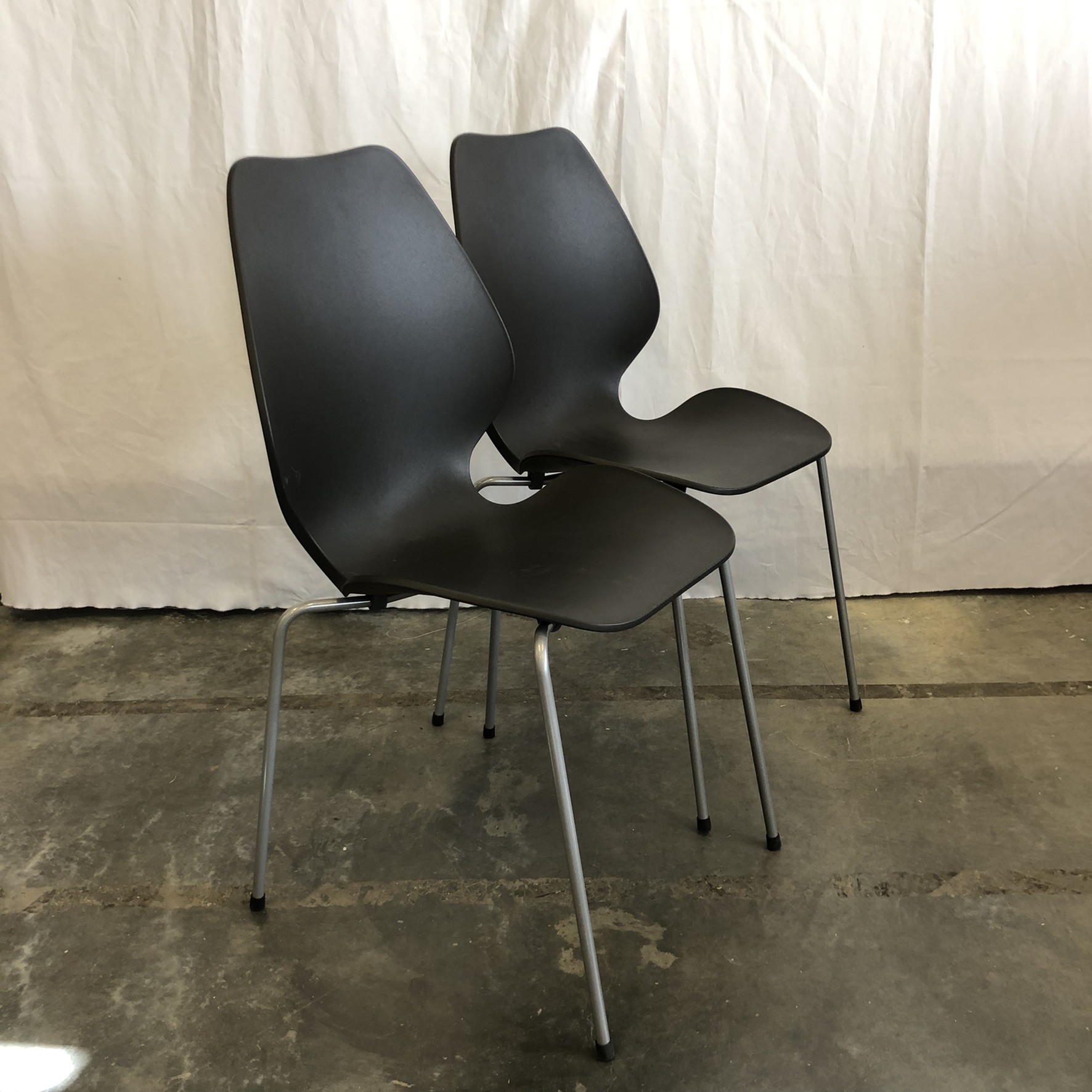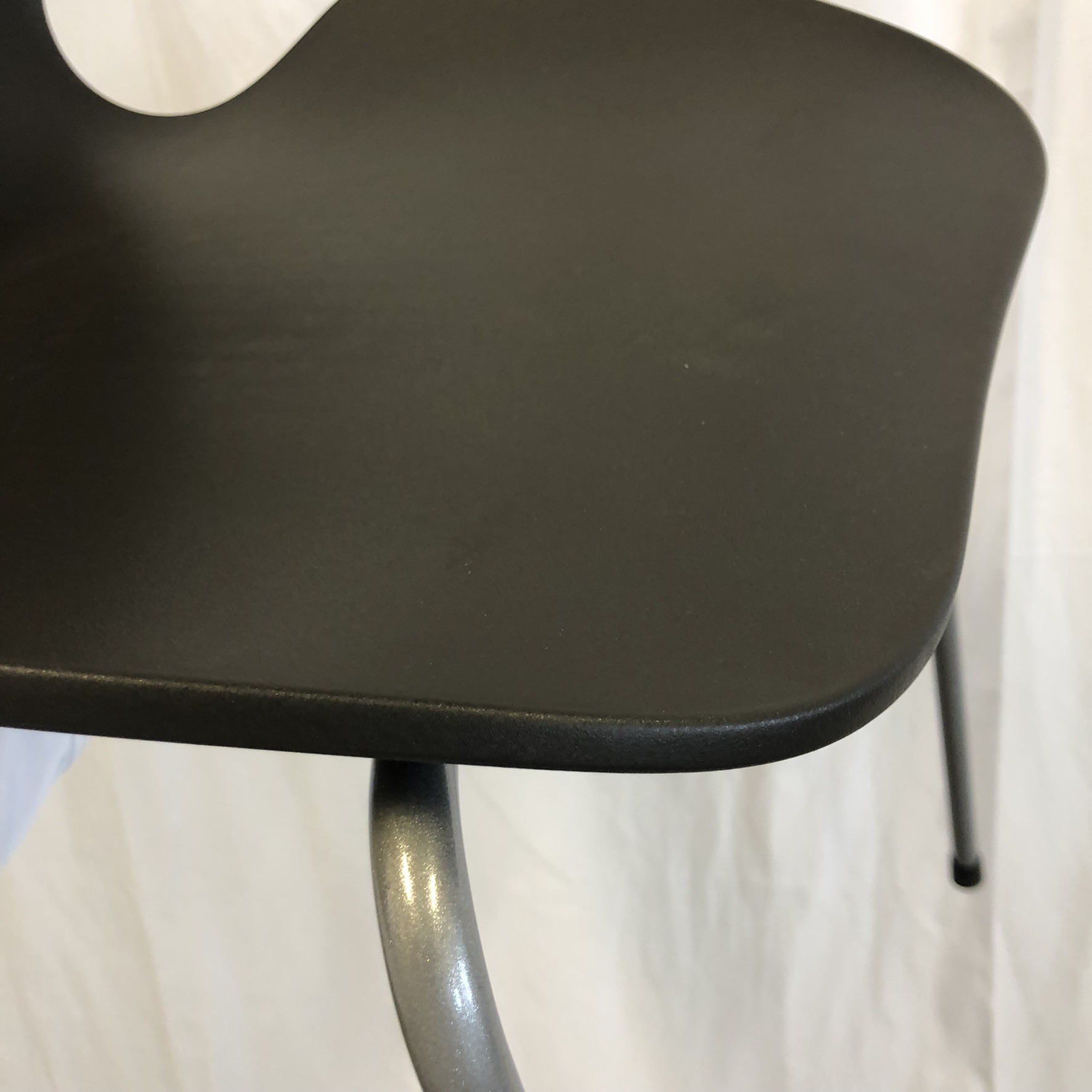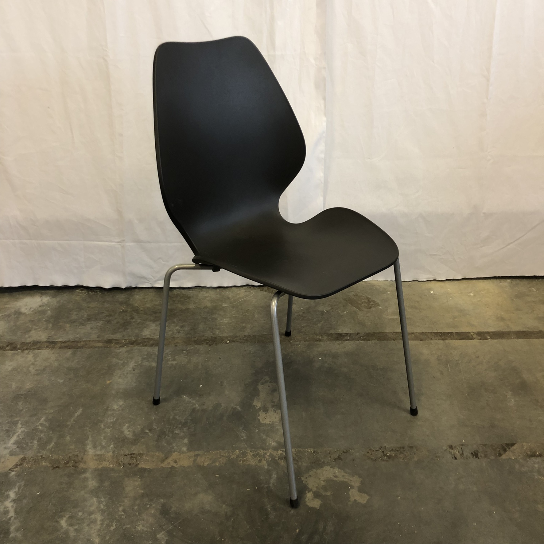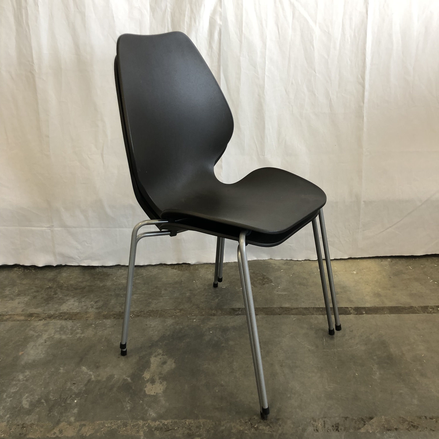 Sæde og ryg i plast (sort). 4-bensstel i metal (grå).
