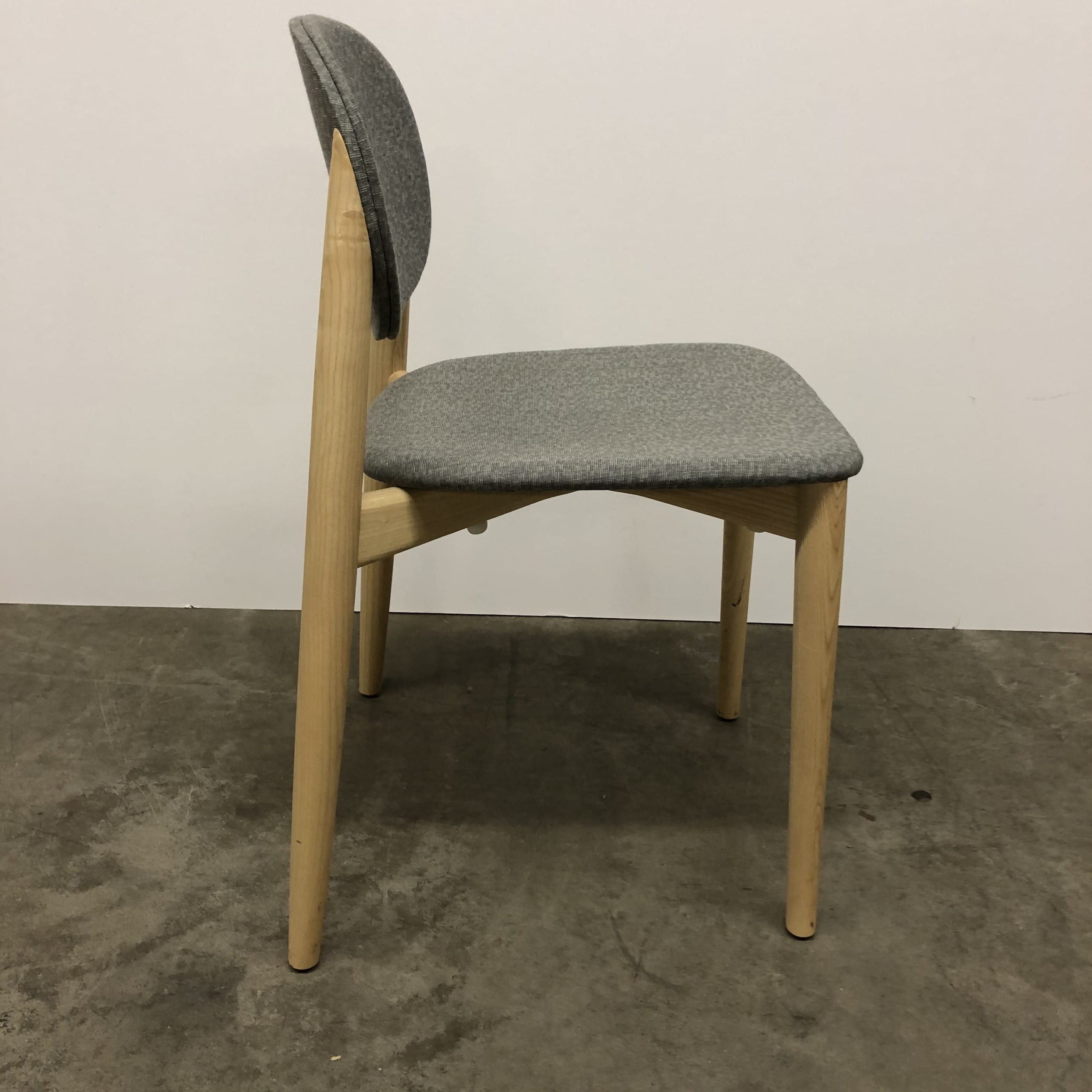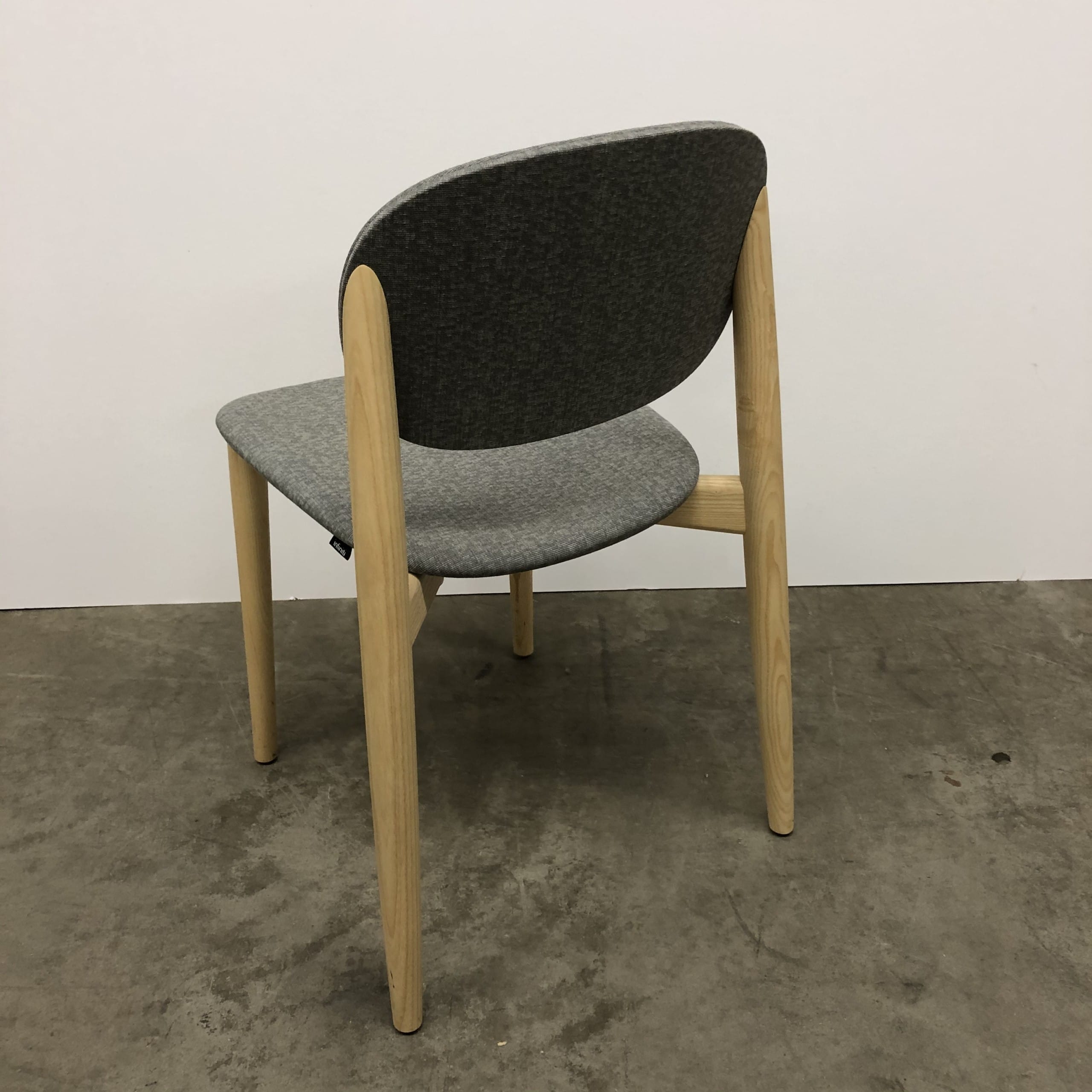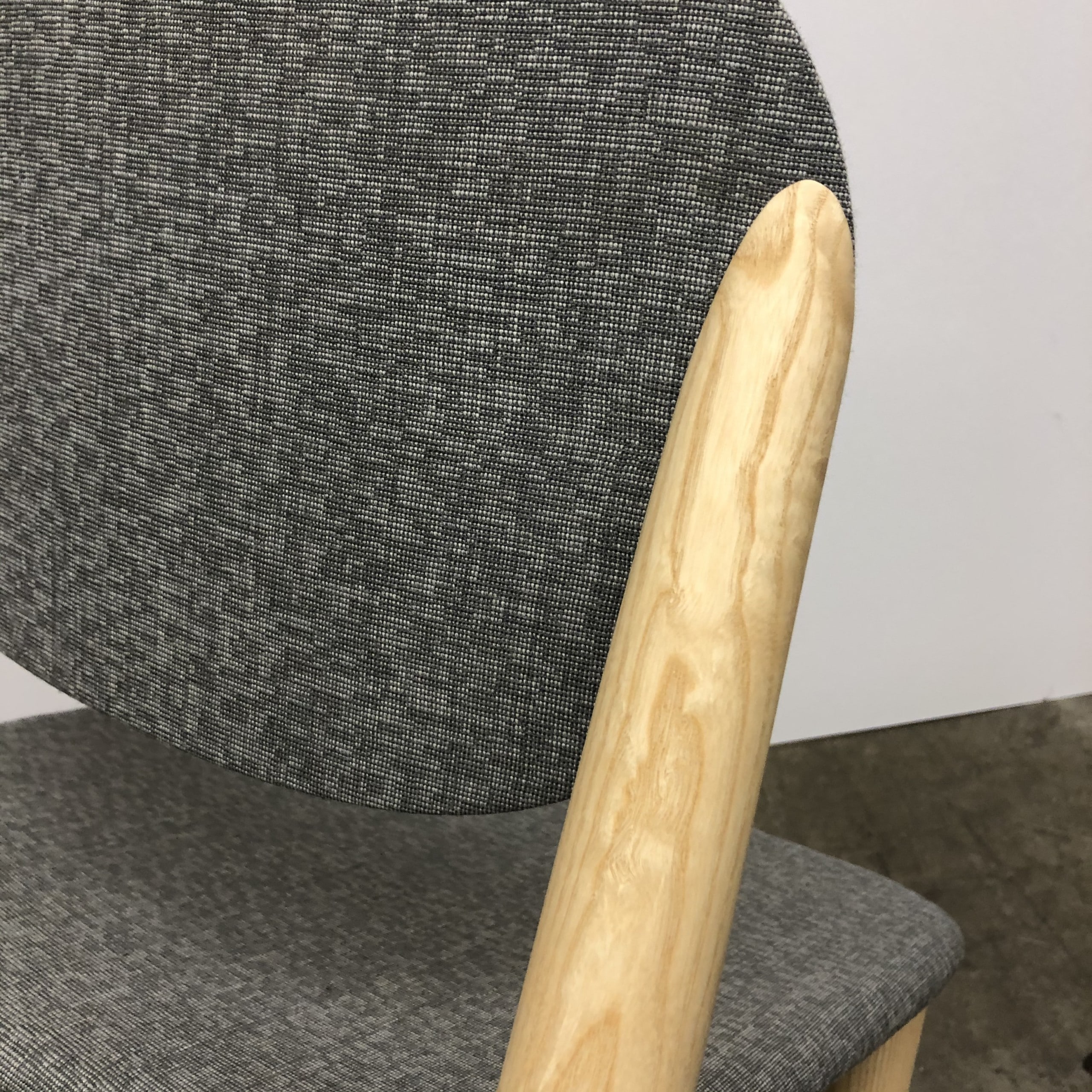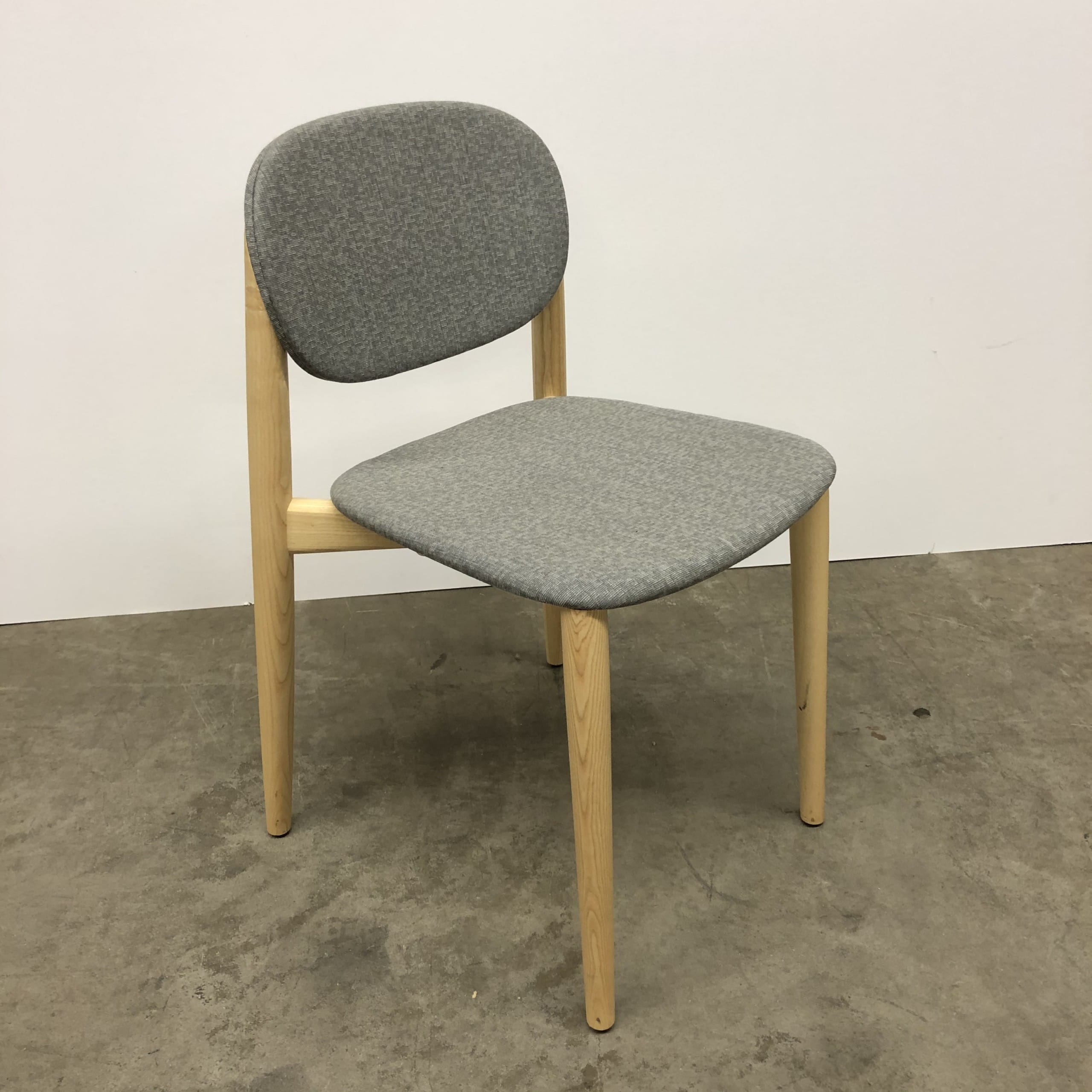 Sæde og ryg i stof (grå). 4-bensstel i træ (ask).