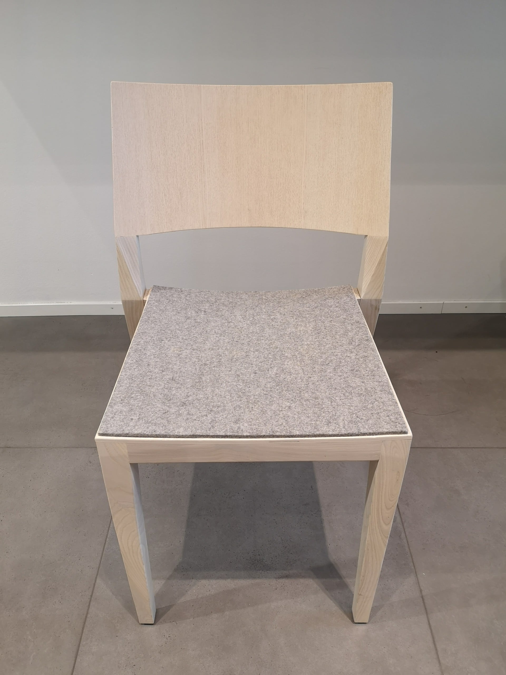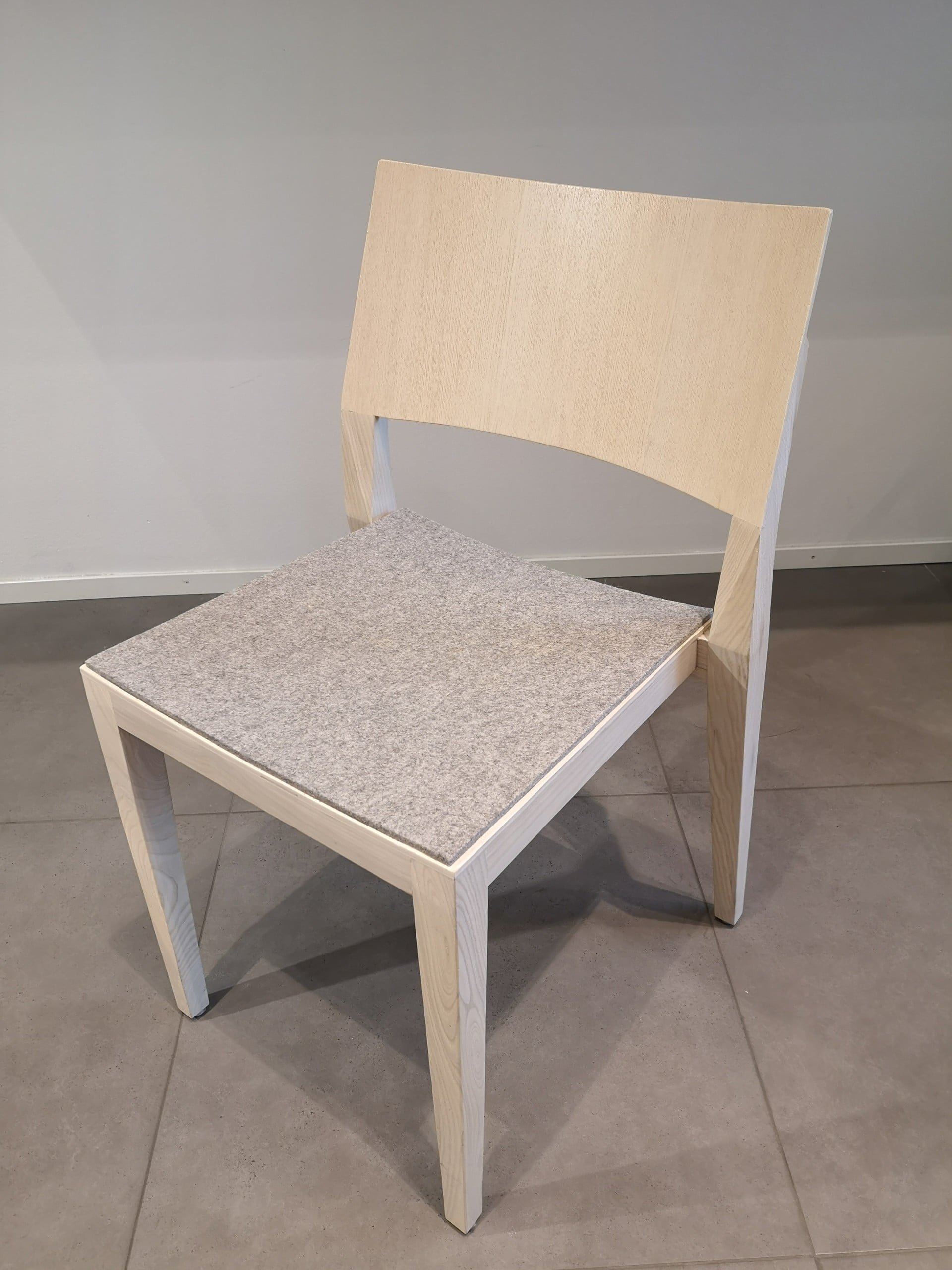 Sæde i stof. Ryg i træ (ask). 4-bensstel i træ (ask).