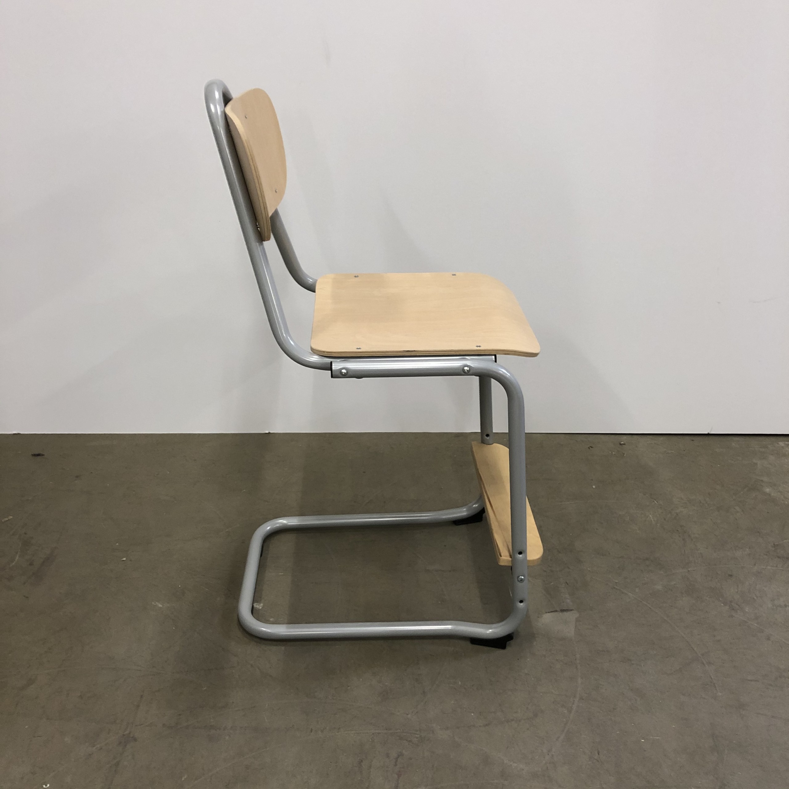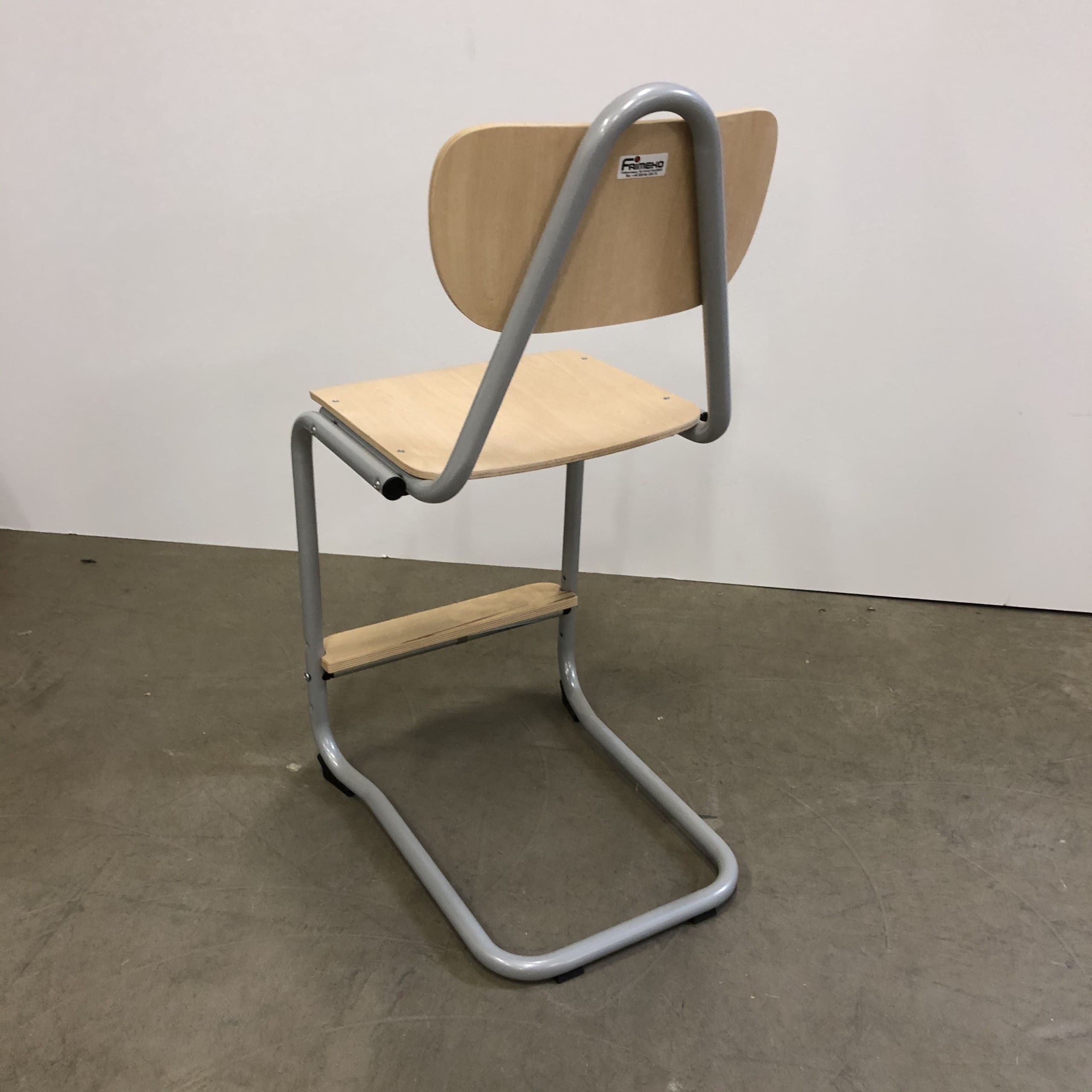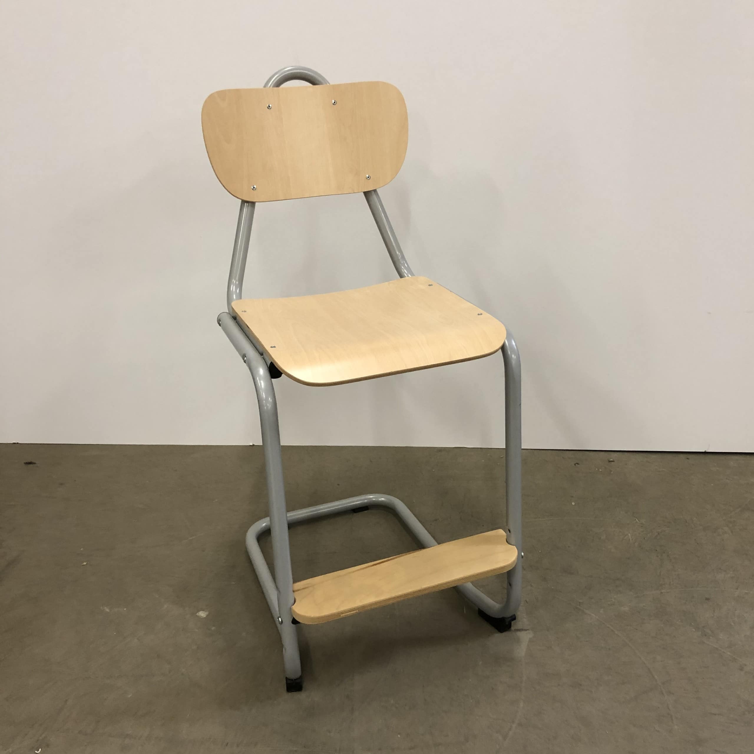 Sæde og ryg i træ (birk). Medestel i metal (sølv).