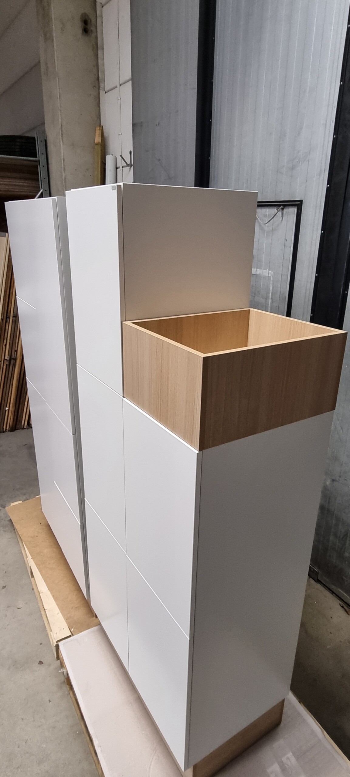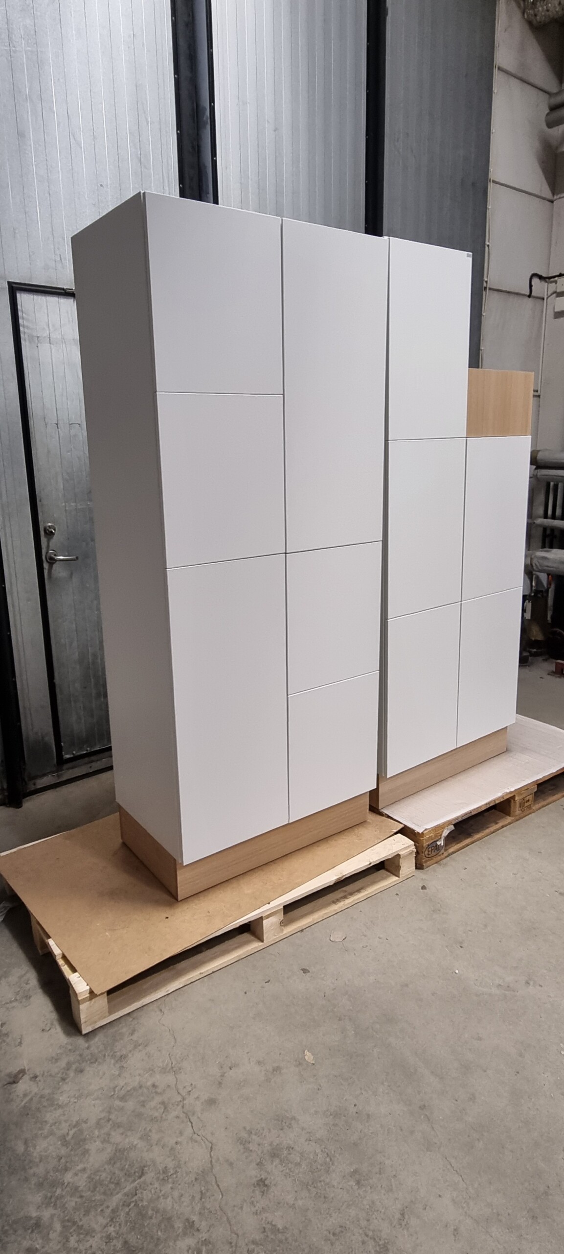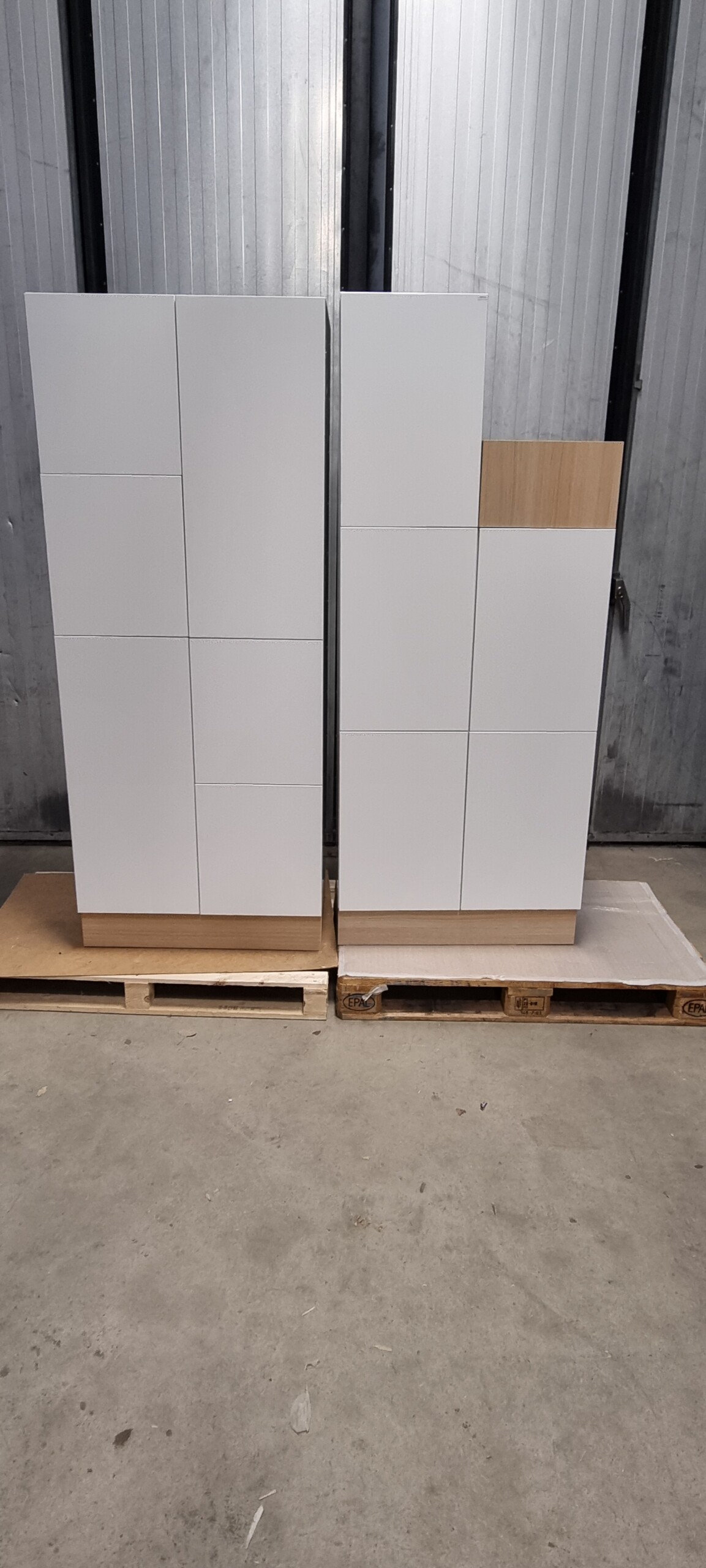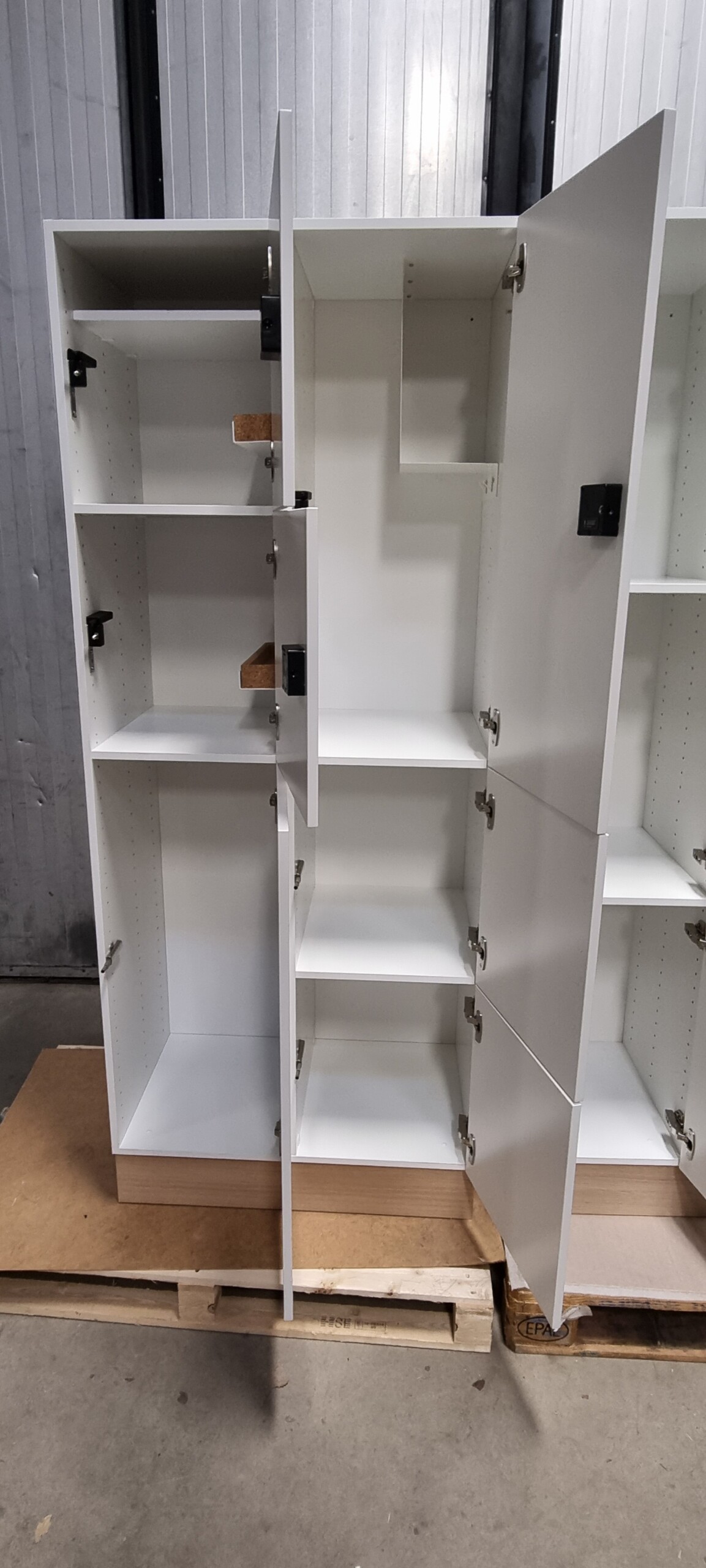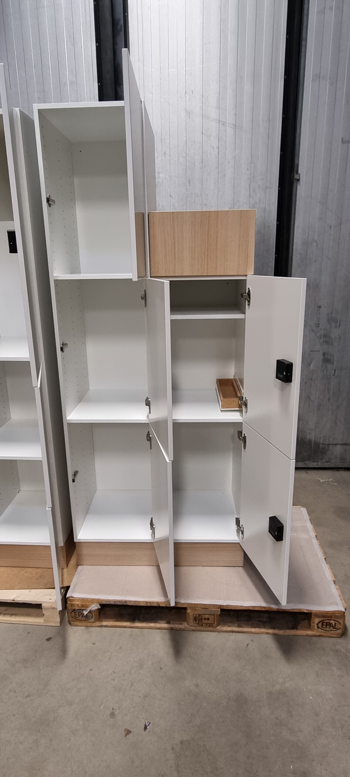 Sold as a unit. 5 doors with RFID locks and 6 with Push to open. Also includes 2 movable shelves, 3 cork boxes with shelves and 1 sheet steel insert.