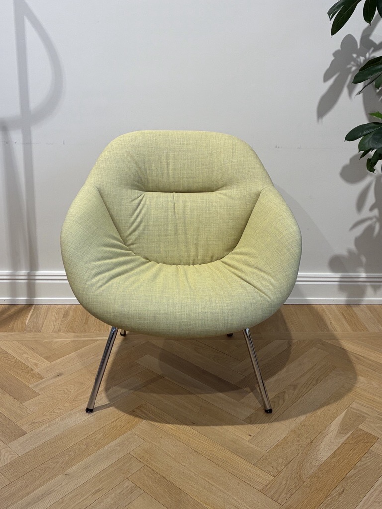 Sæde og ryg i stof (gul). 4-bensstel i metal (krom).
