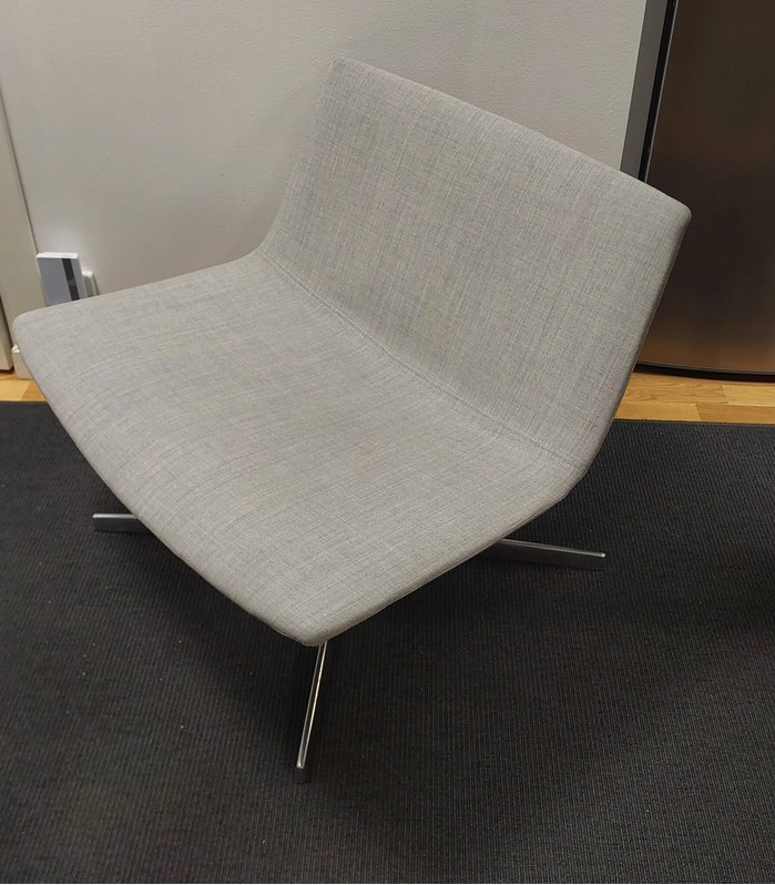Sæde og ryg i stof (grå). Fodkryds i metal (krom).