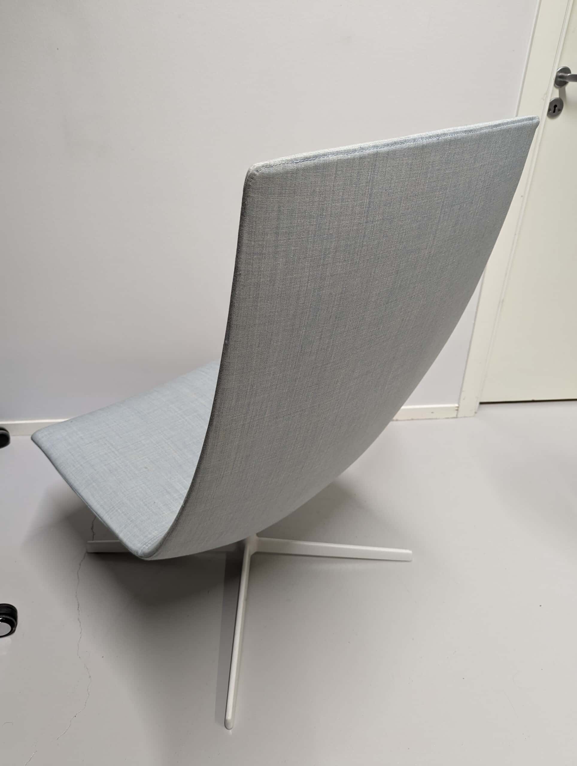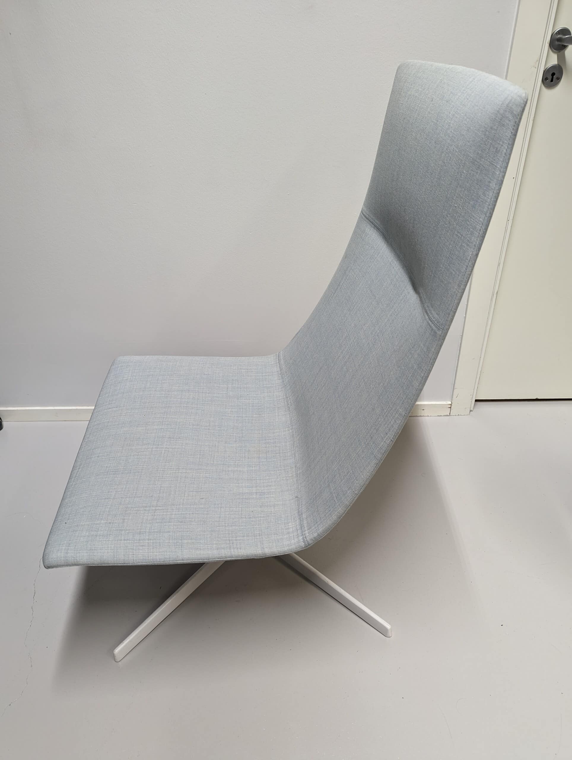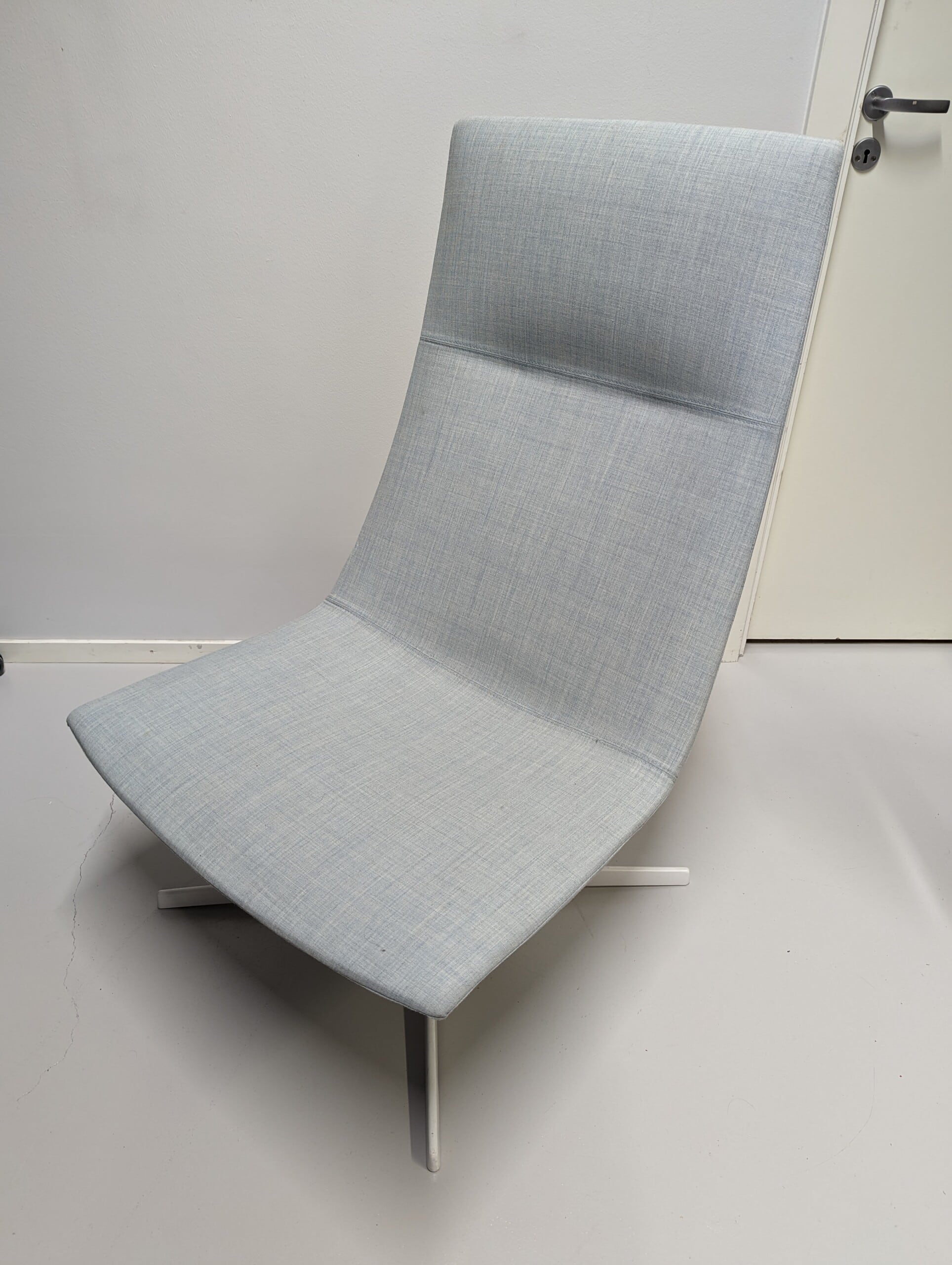 Sæde og ryg i stof (blå). Fodkryds i metal (hvid).