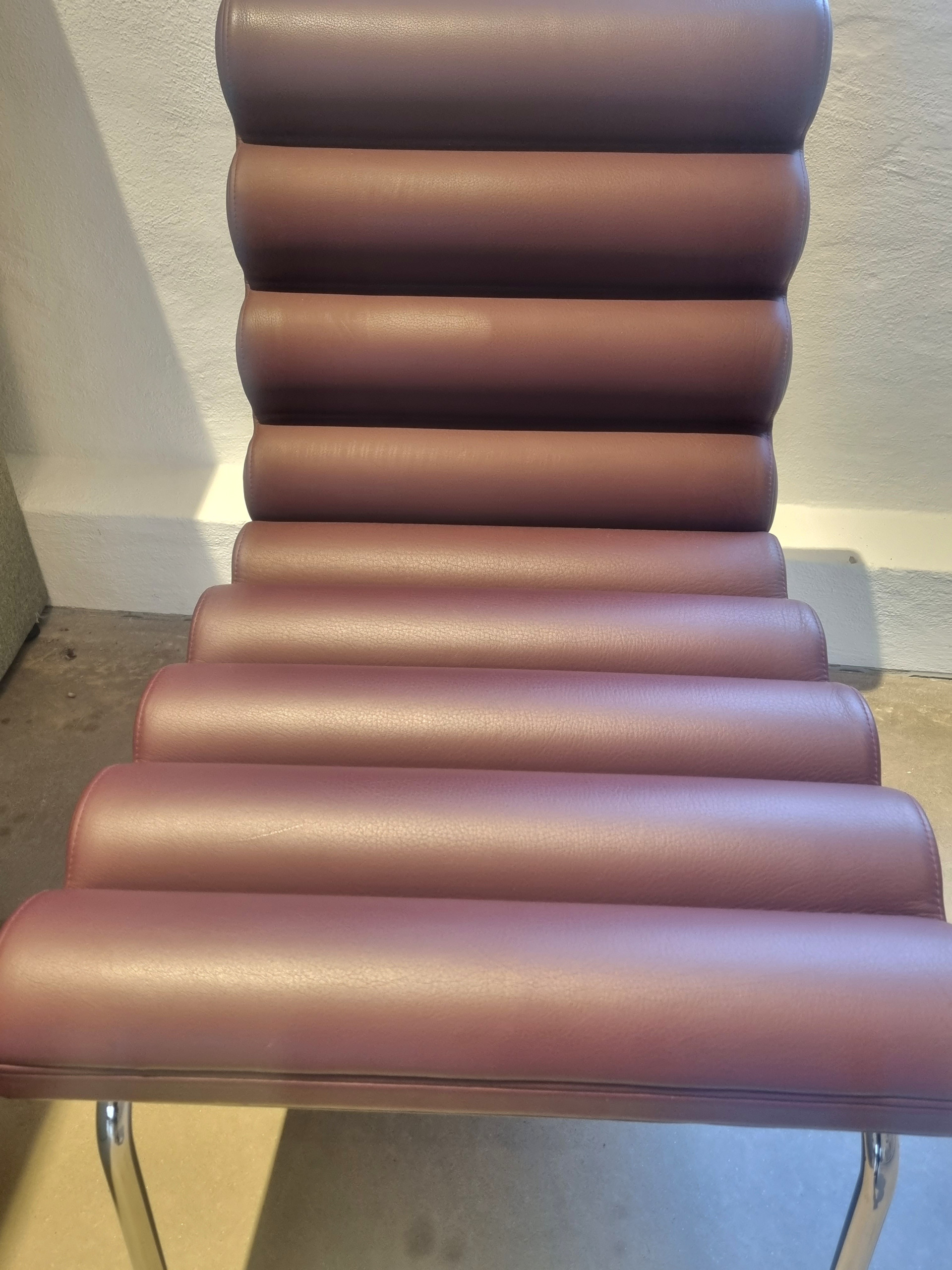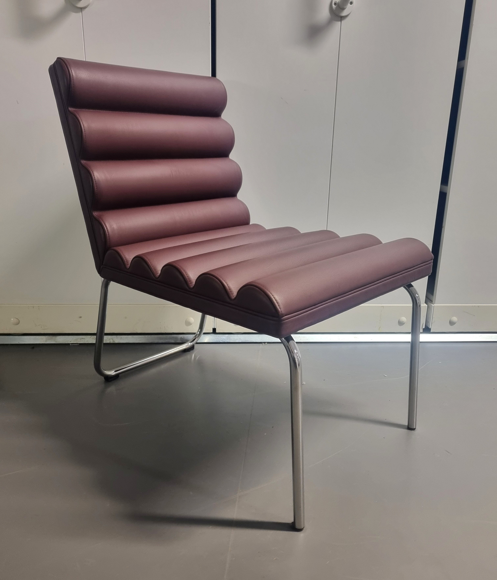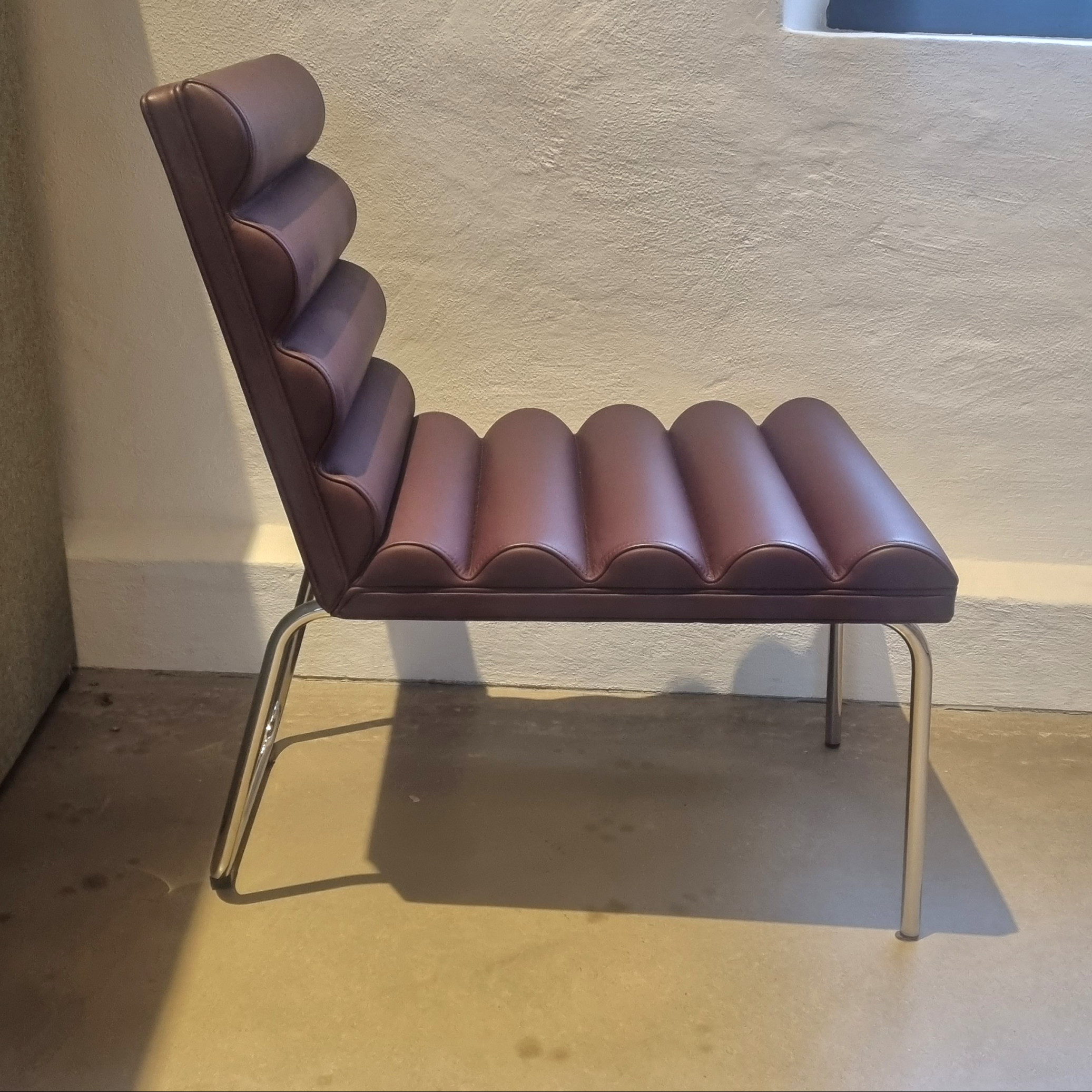 Sæde og ryg i læder (brun). Medestel i metal (krom).