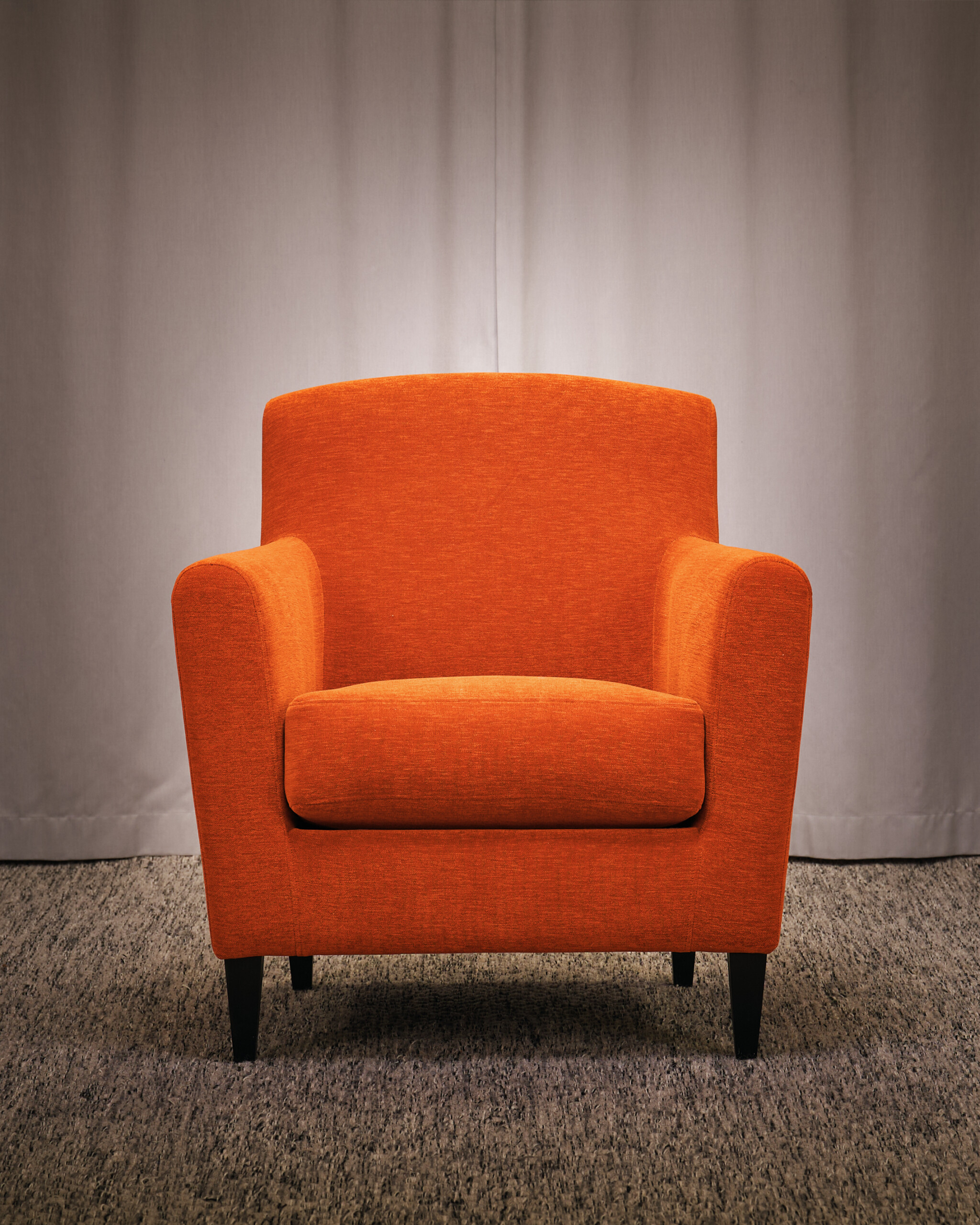 Sæde og ryg i stof (orange). 4-bensstel i træ (sort).