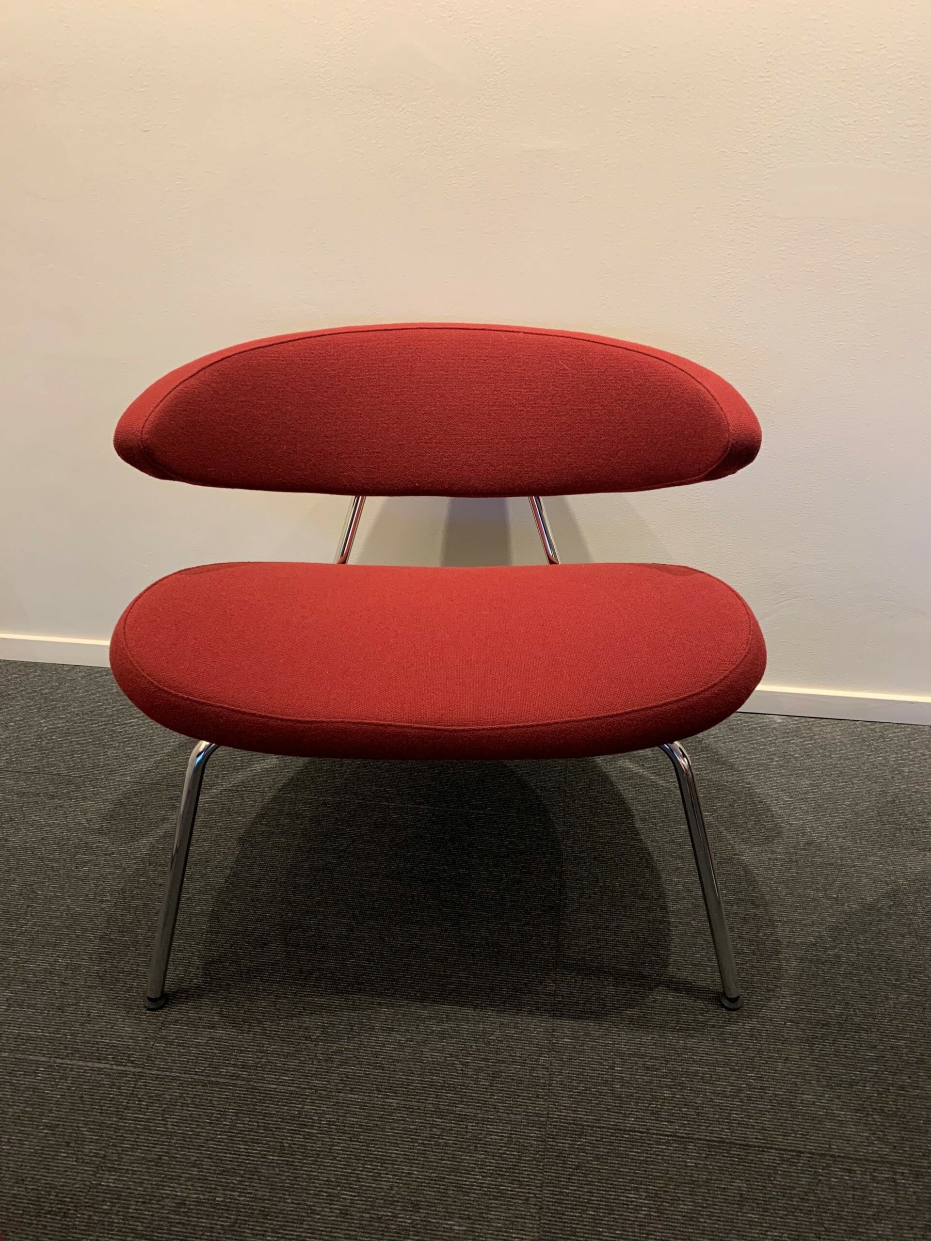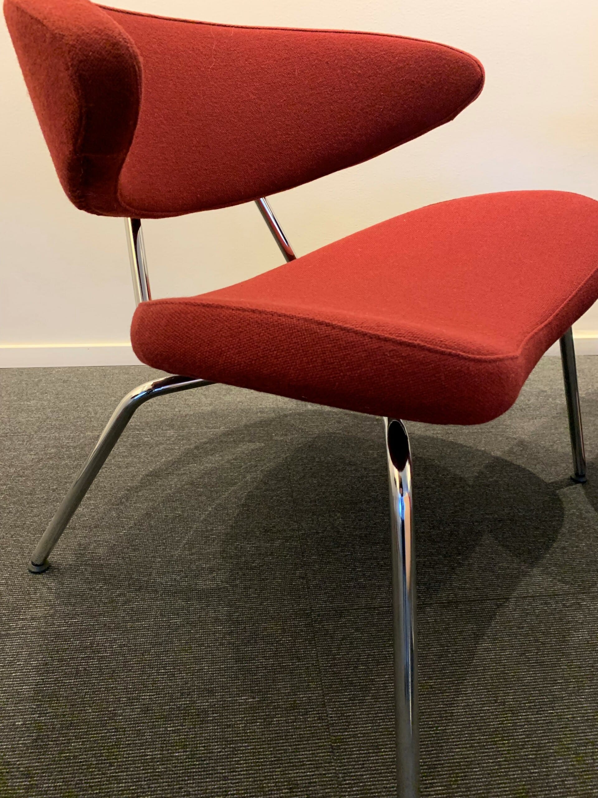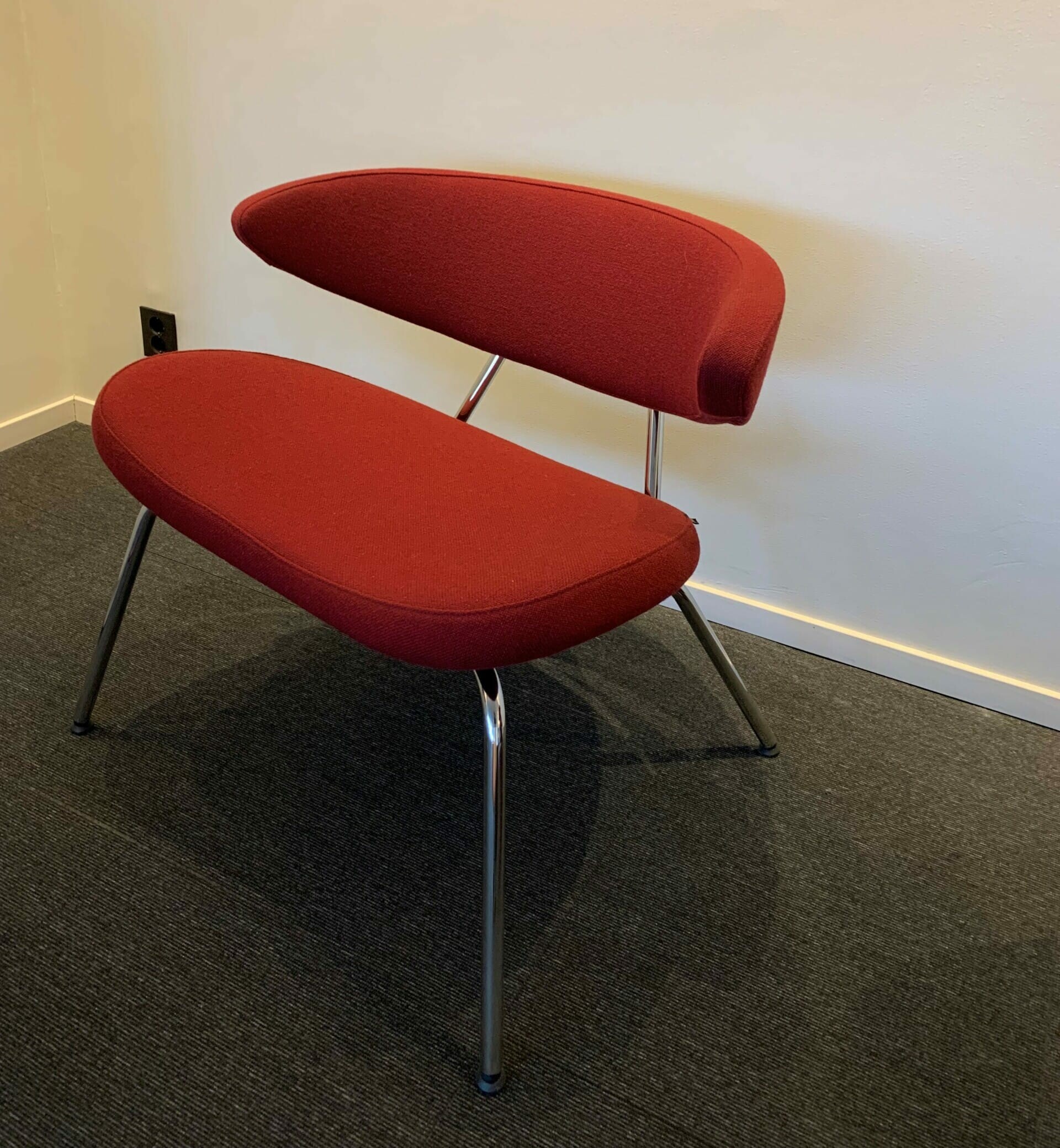 Sæde og ryg i stof (rød). 4-bensstel i metal (krom).
