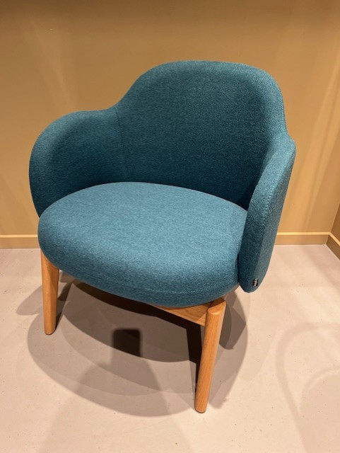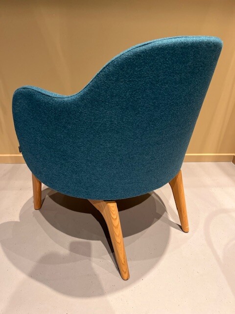 Sæde og ryg i stof (turkis). 4-bensstel i træ (eg).