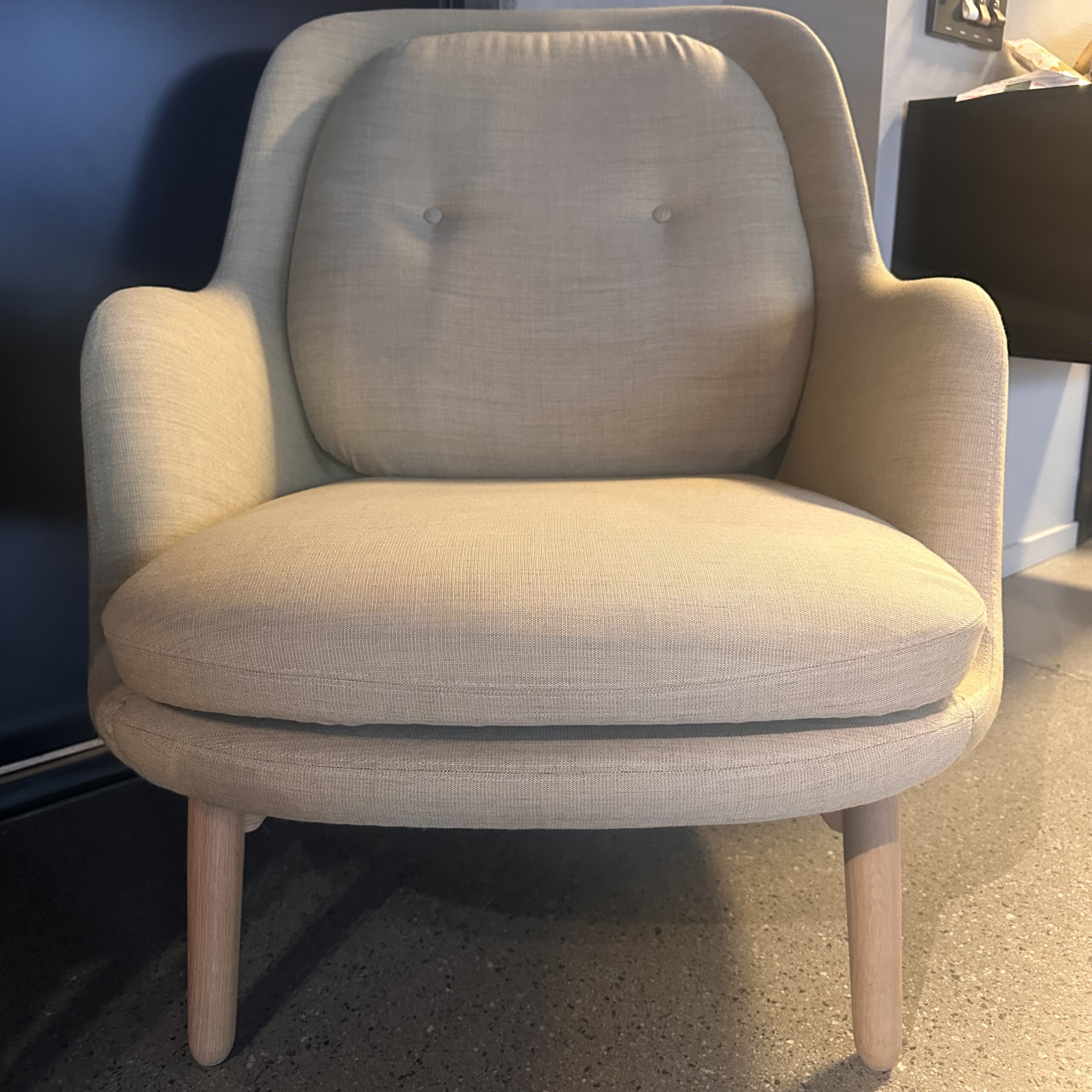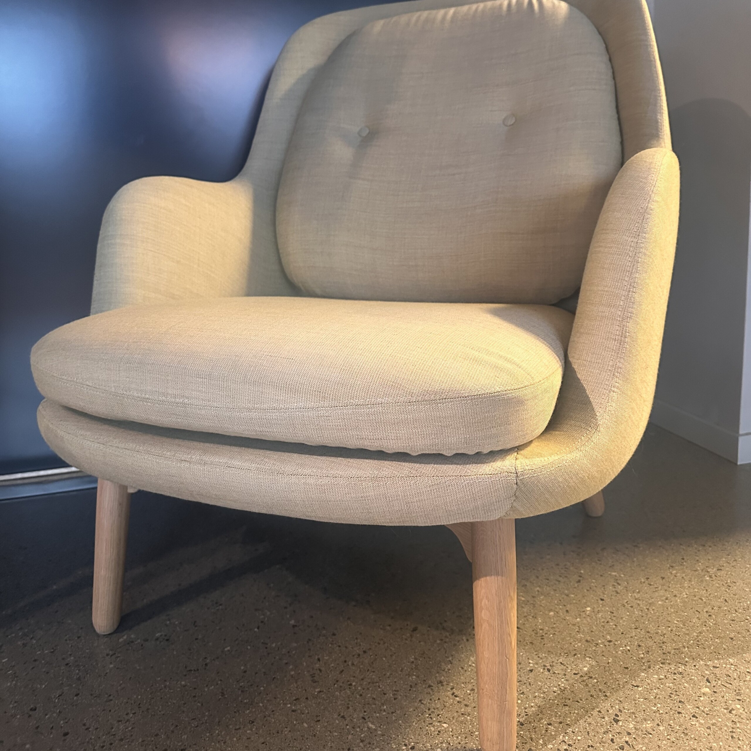 Sæde og ryg i stof (beige). 4-bensstel i træ (eg).