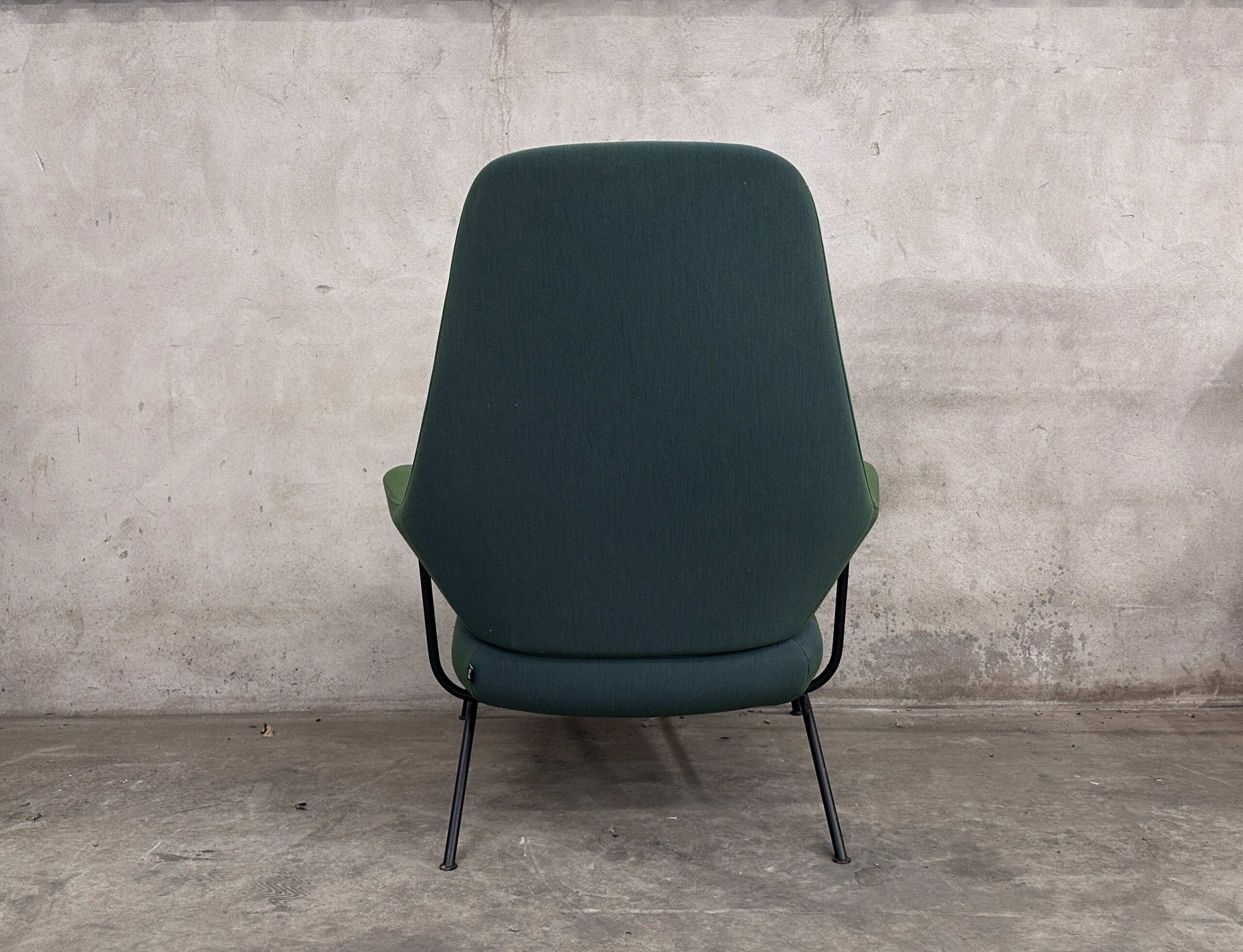 Sæde og ryg i stof (grøn). 4-bensstel i metal (sort).