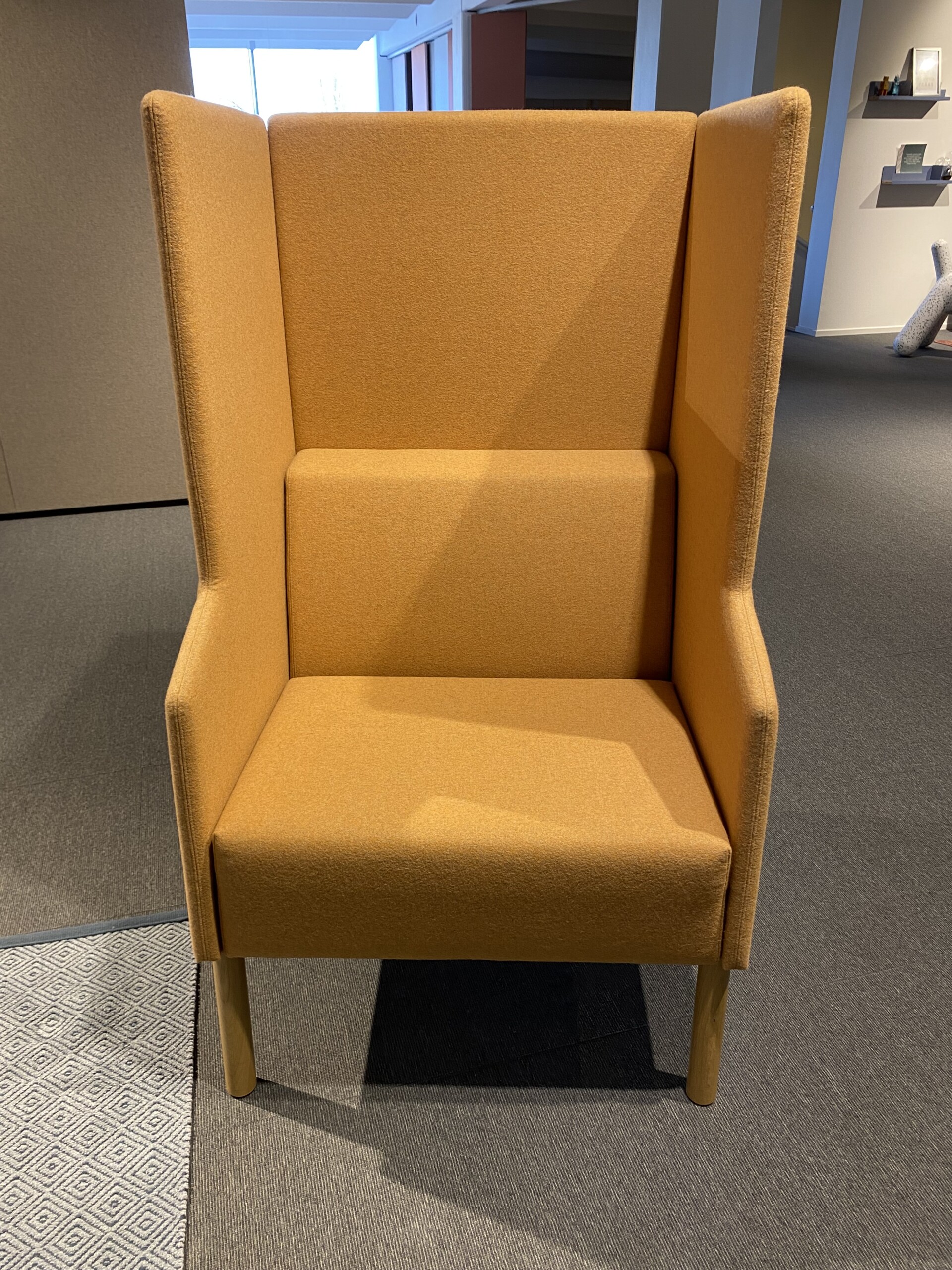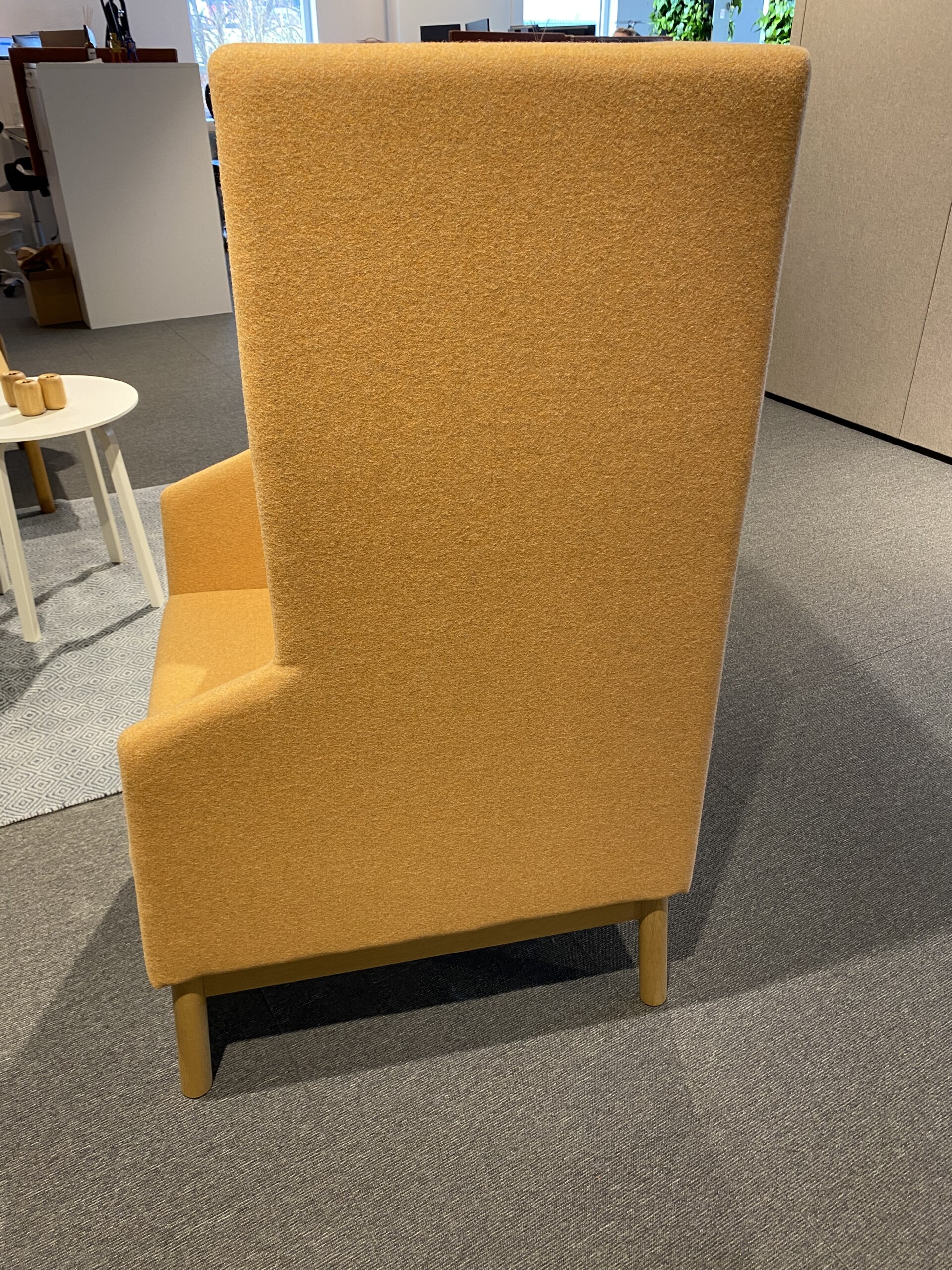 Sæde og ryg i stof (gul). 4-bensstel i træ (eg).