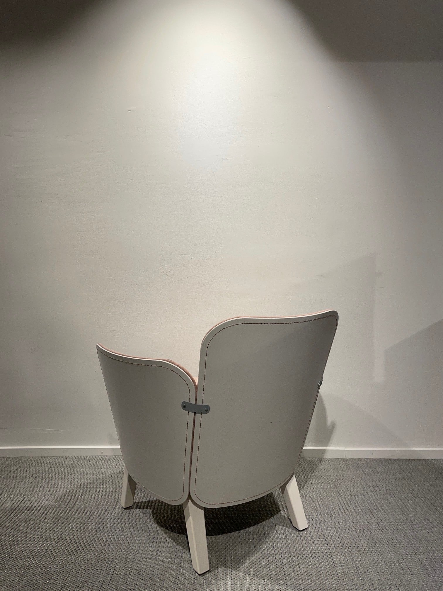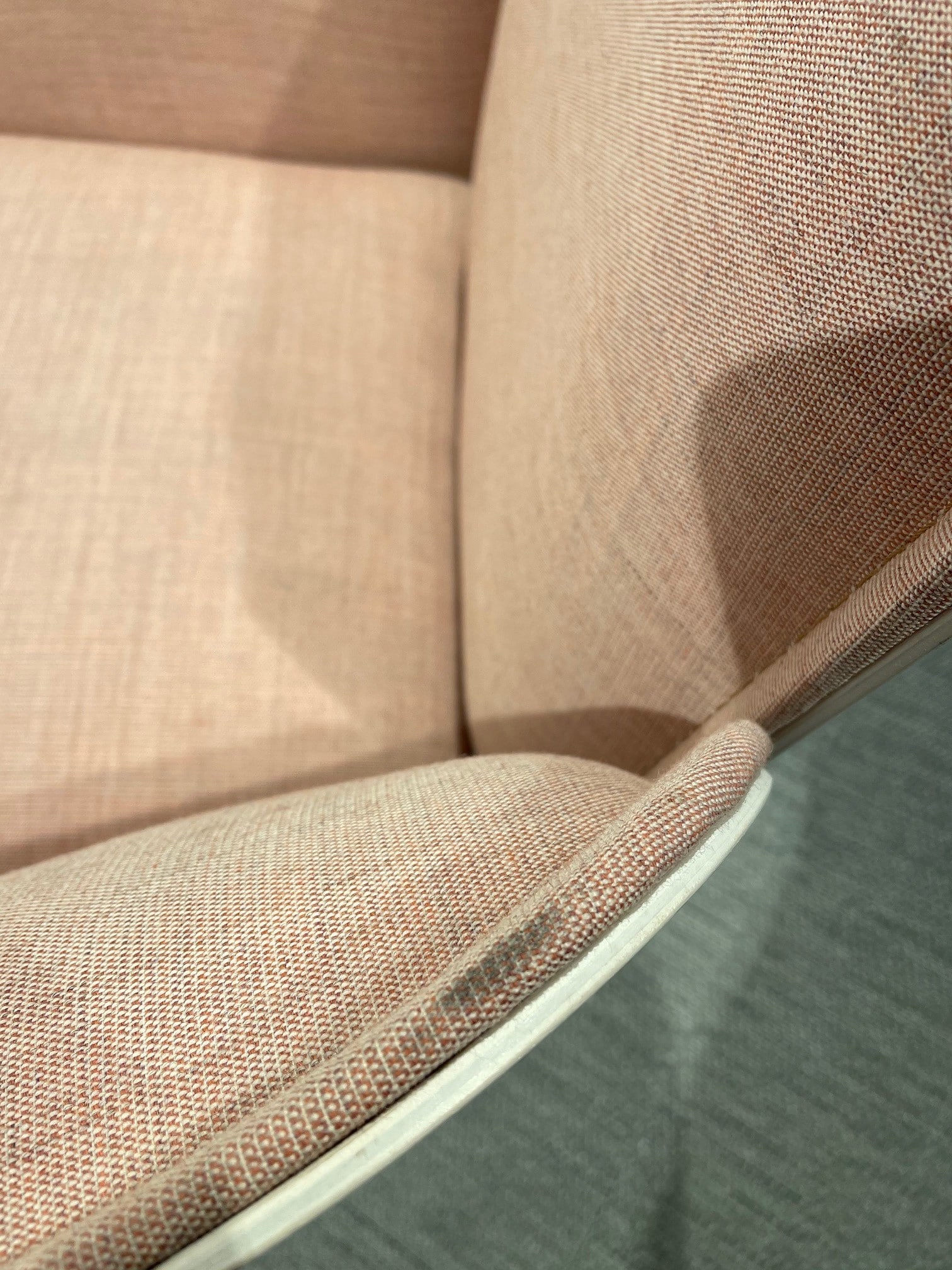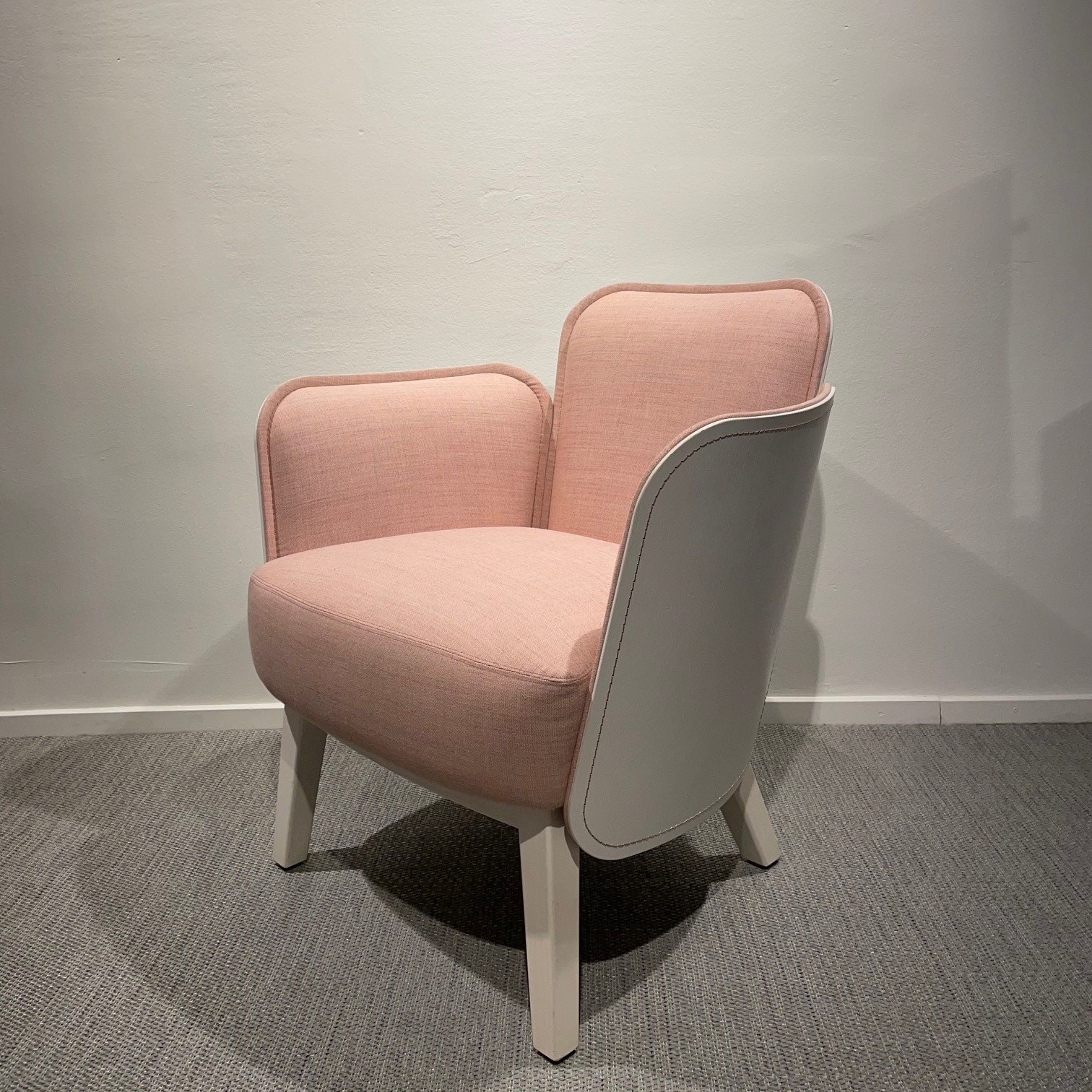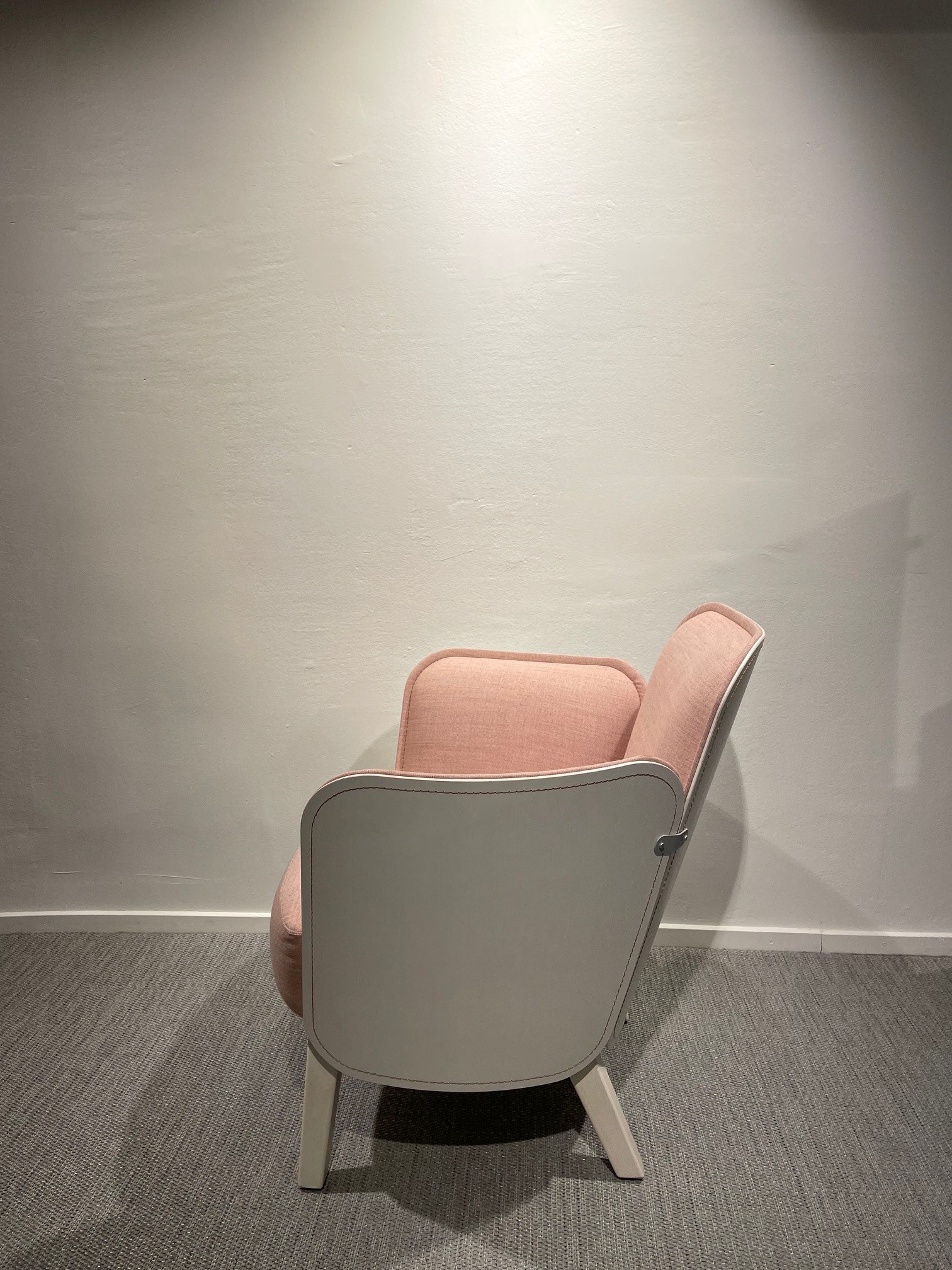 Sæde og ryg i stof (lyserød). 4-bensstel i træ (hvid).