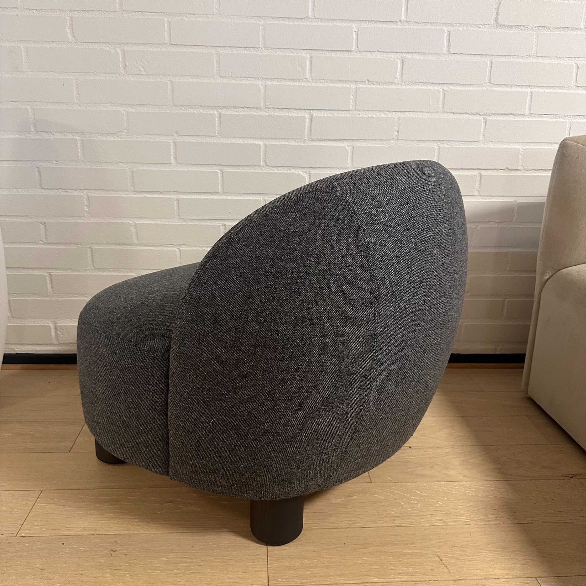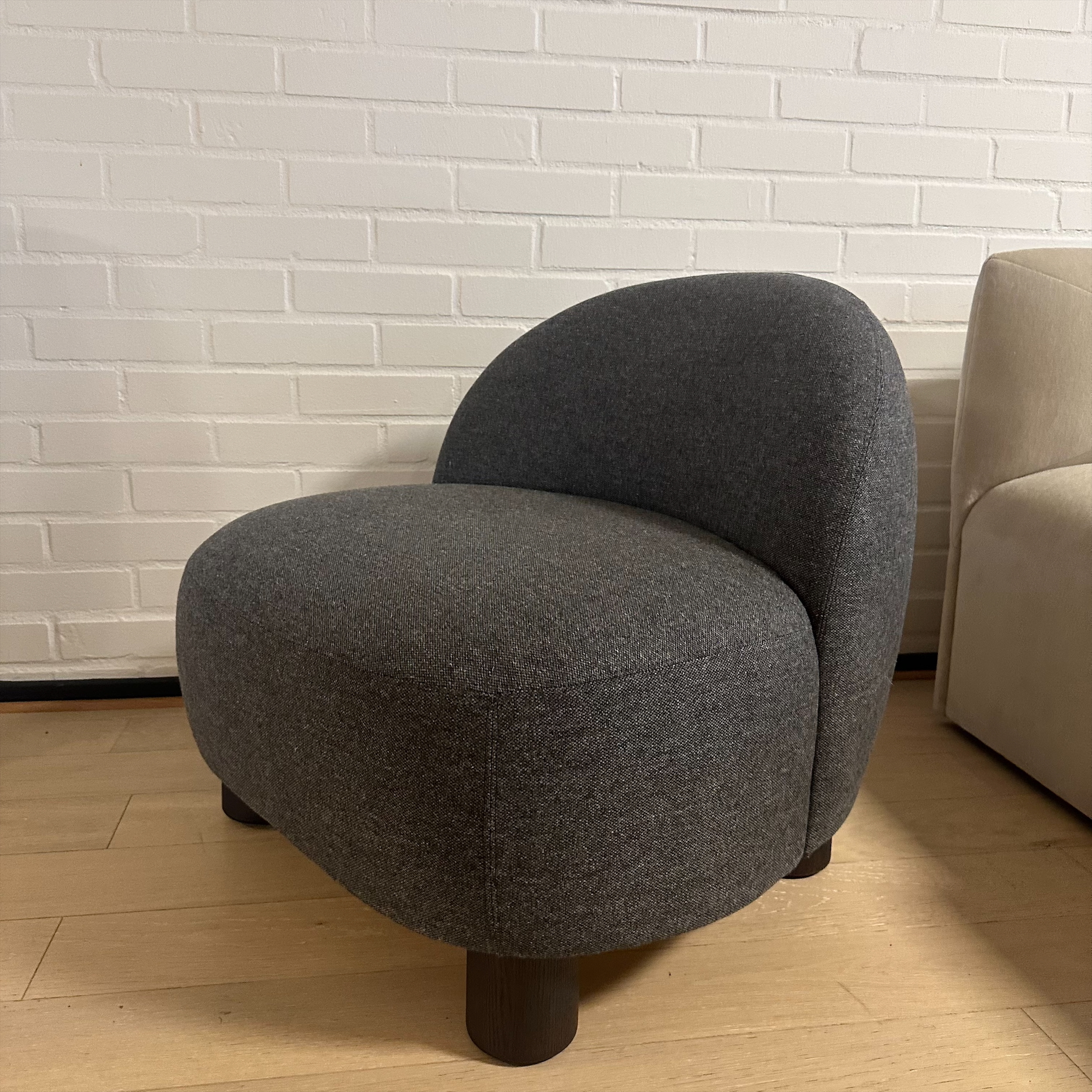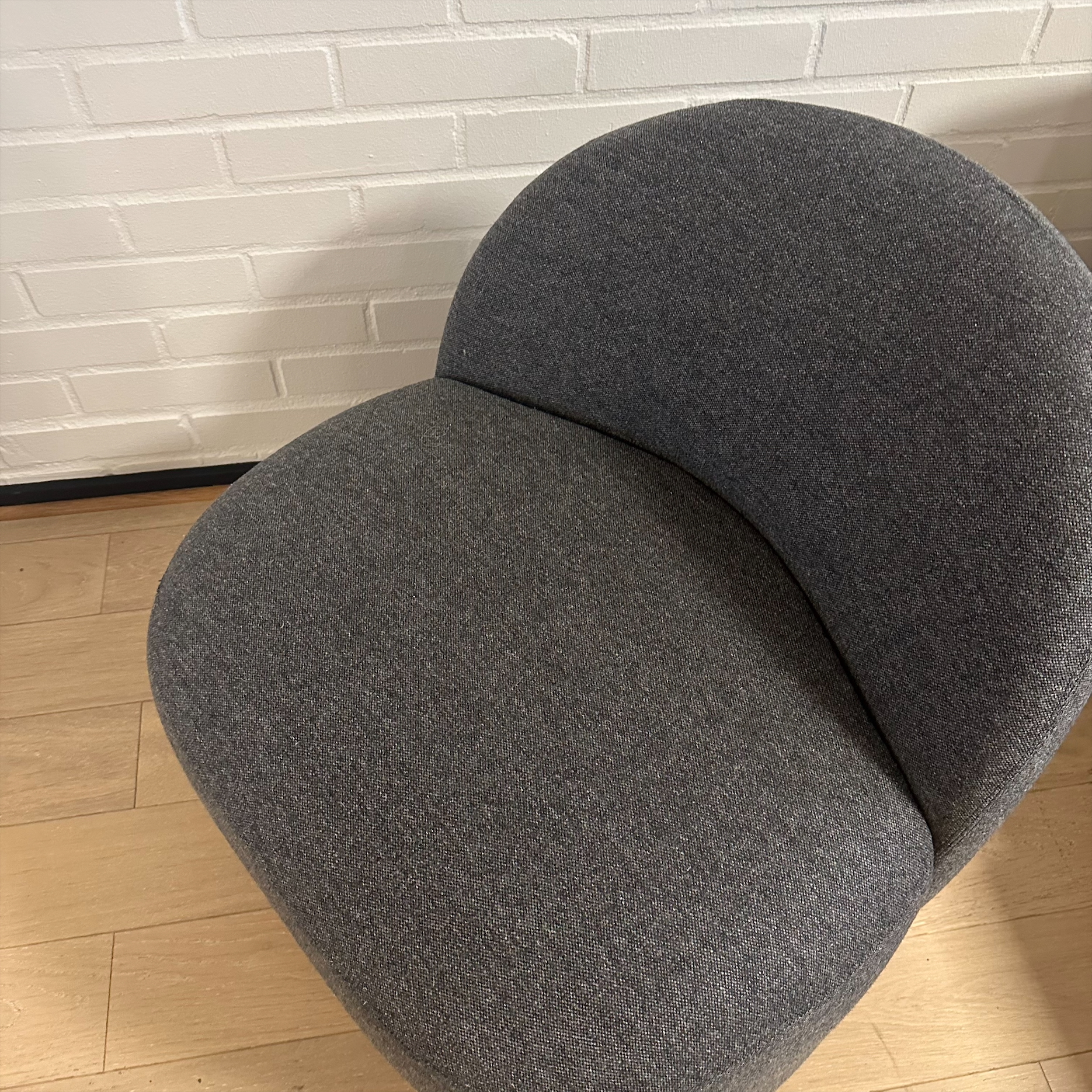 Sæde og ryg i stof (grå). 4-bensstel i træ (eg).