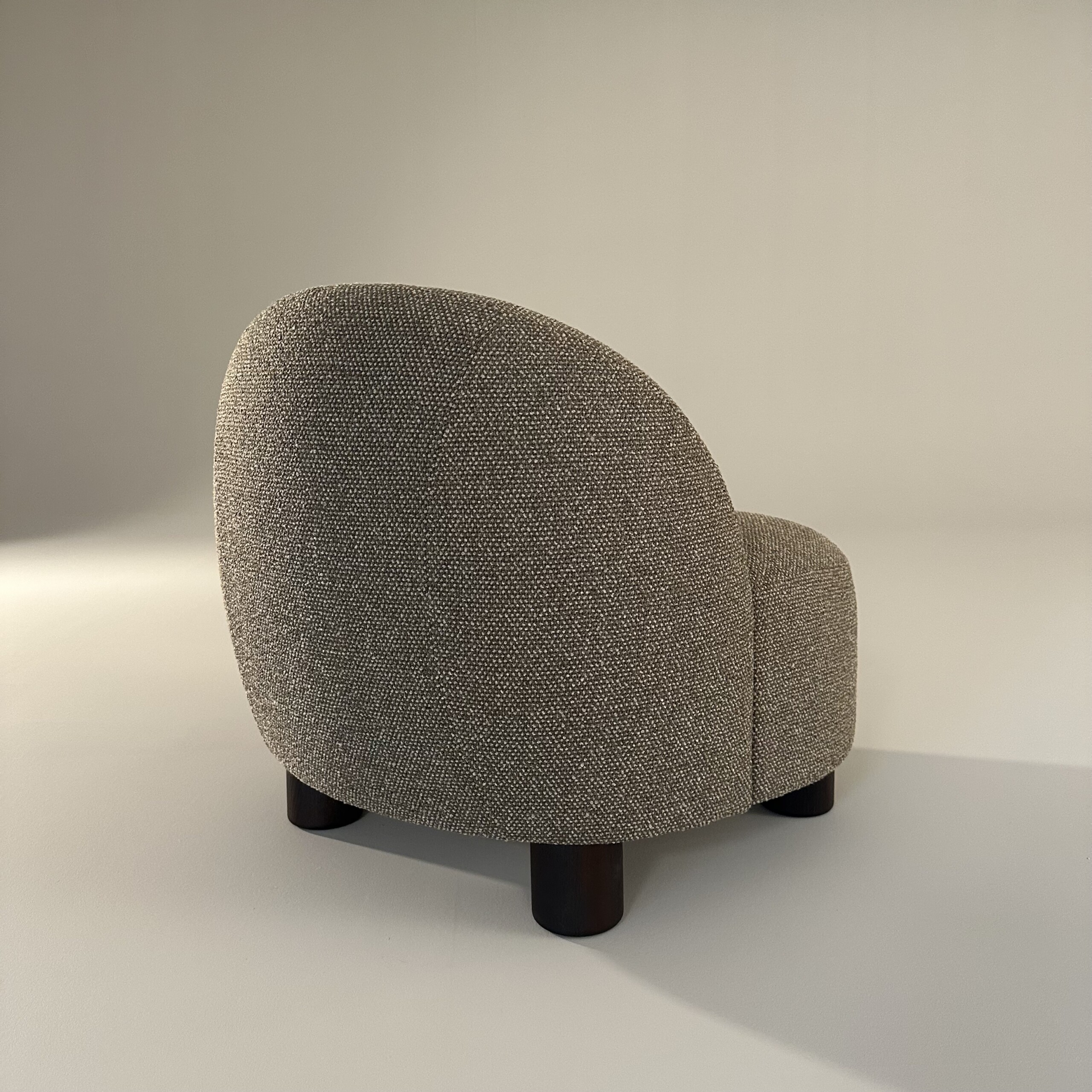 Sæde og ryg i stof (brun). 4-bensstel i træ (eg).
