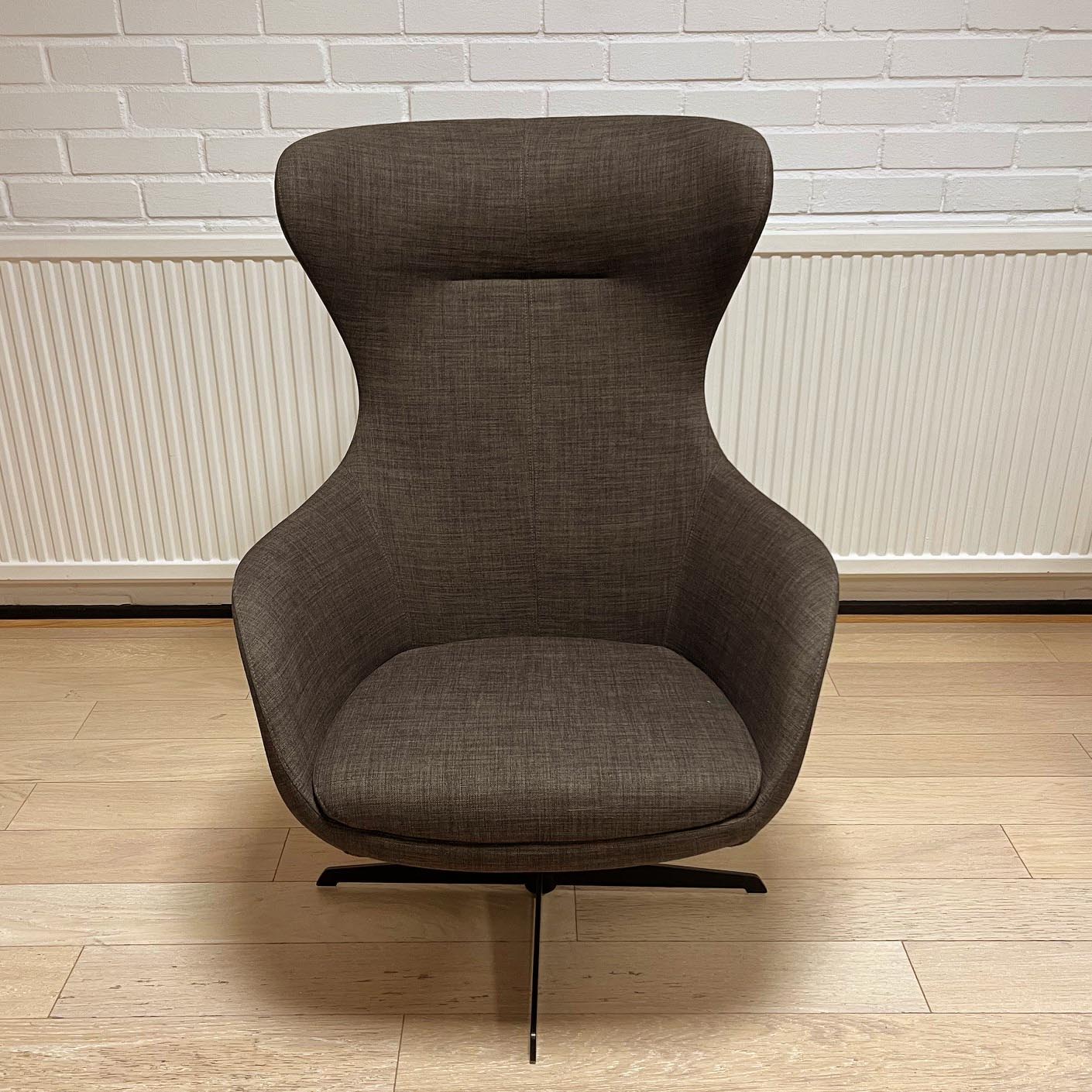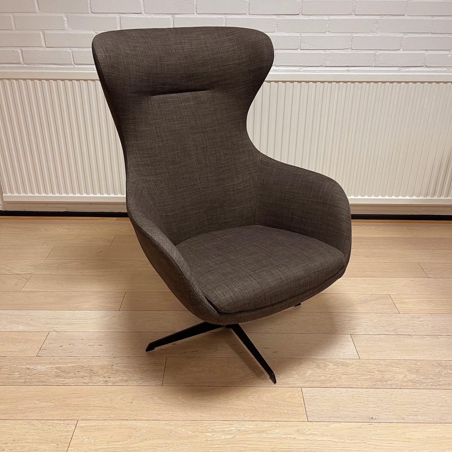 Sæde og ryg i stof (grå). Fodkryds i metal (sort).