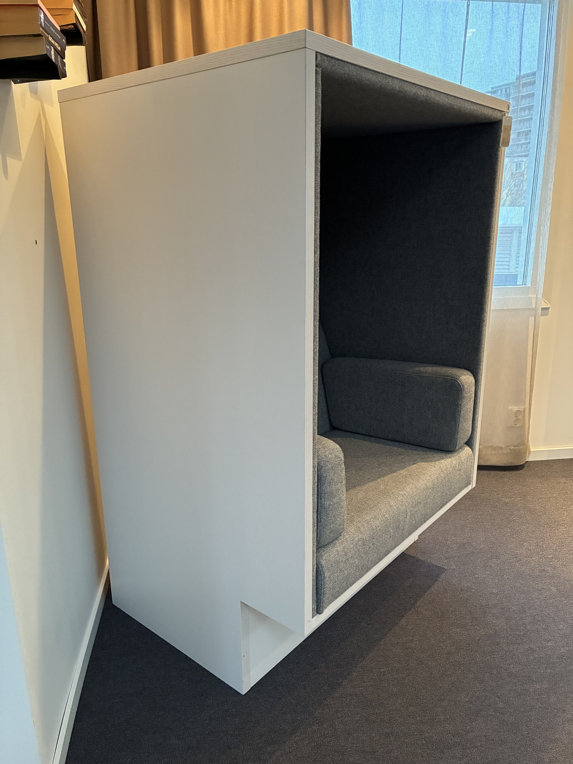 Sæde og ryg i stof (grå). Sokkel i træ (hvid).