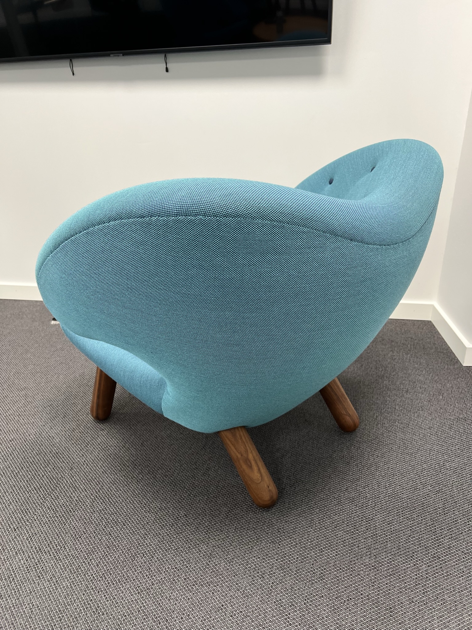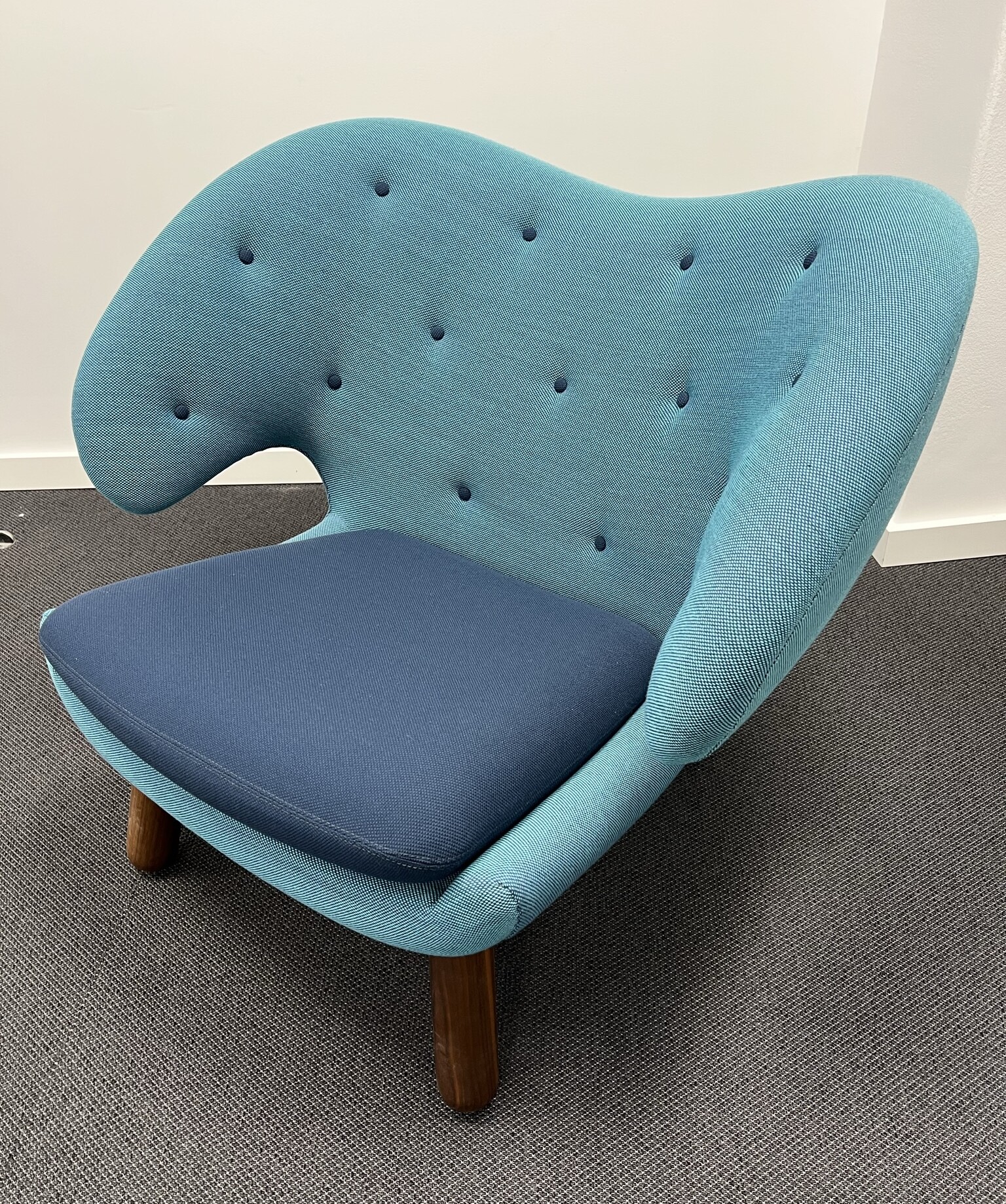 Sæde i stof (blå). Ryg i stof (turkis). 4-bensstel i træ (valnød).
