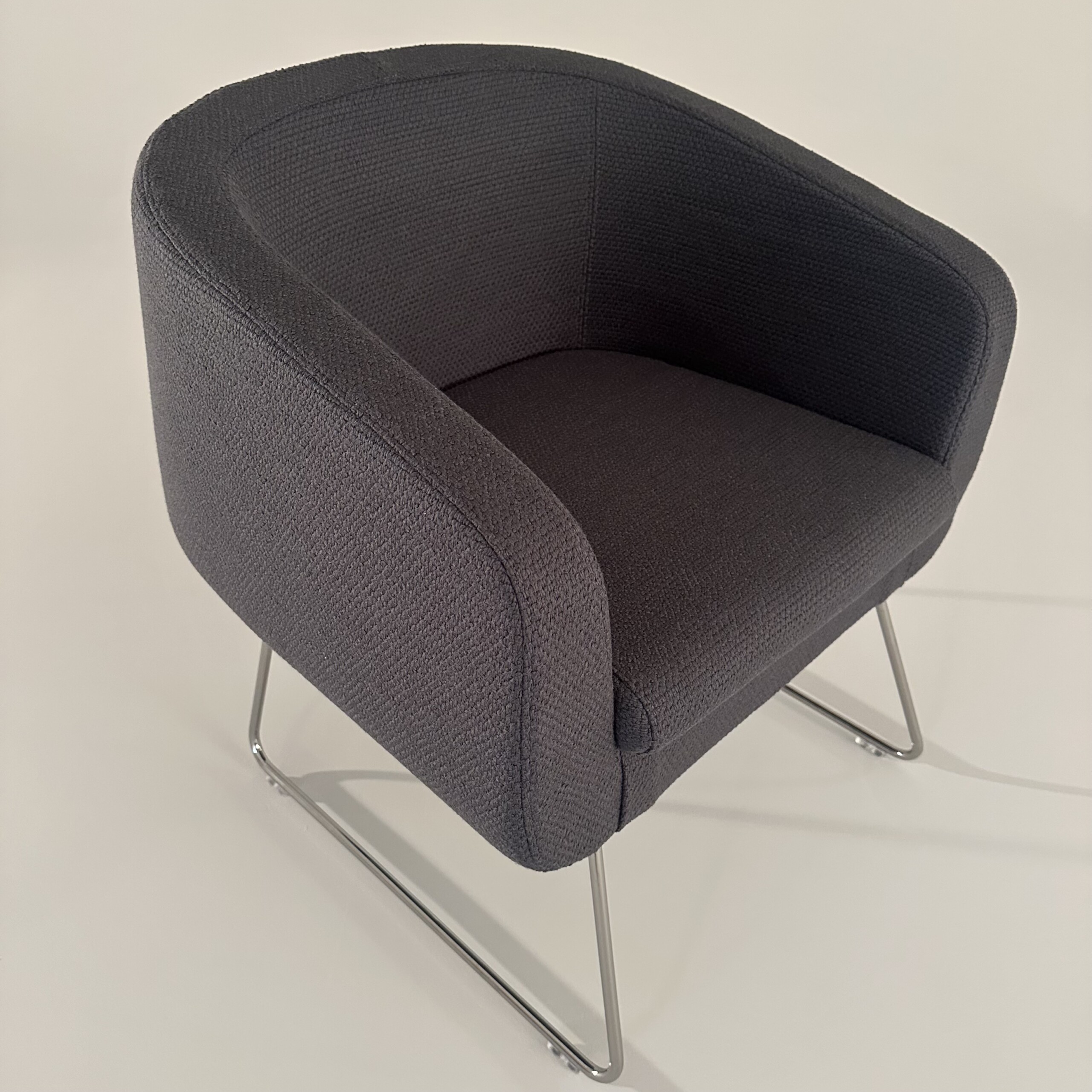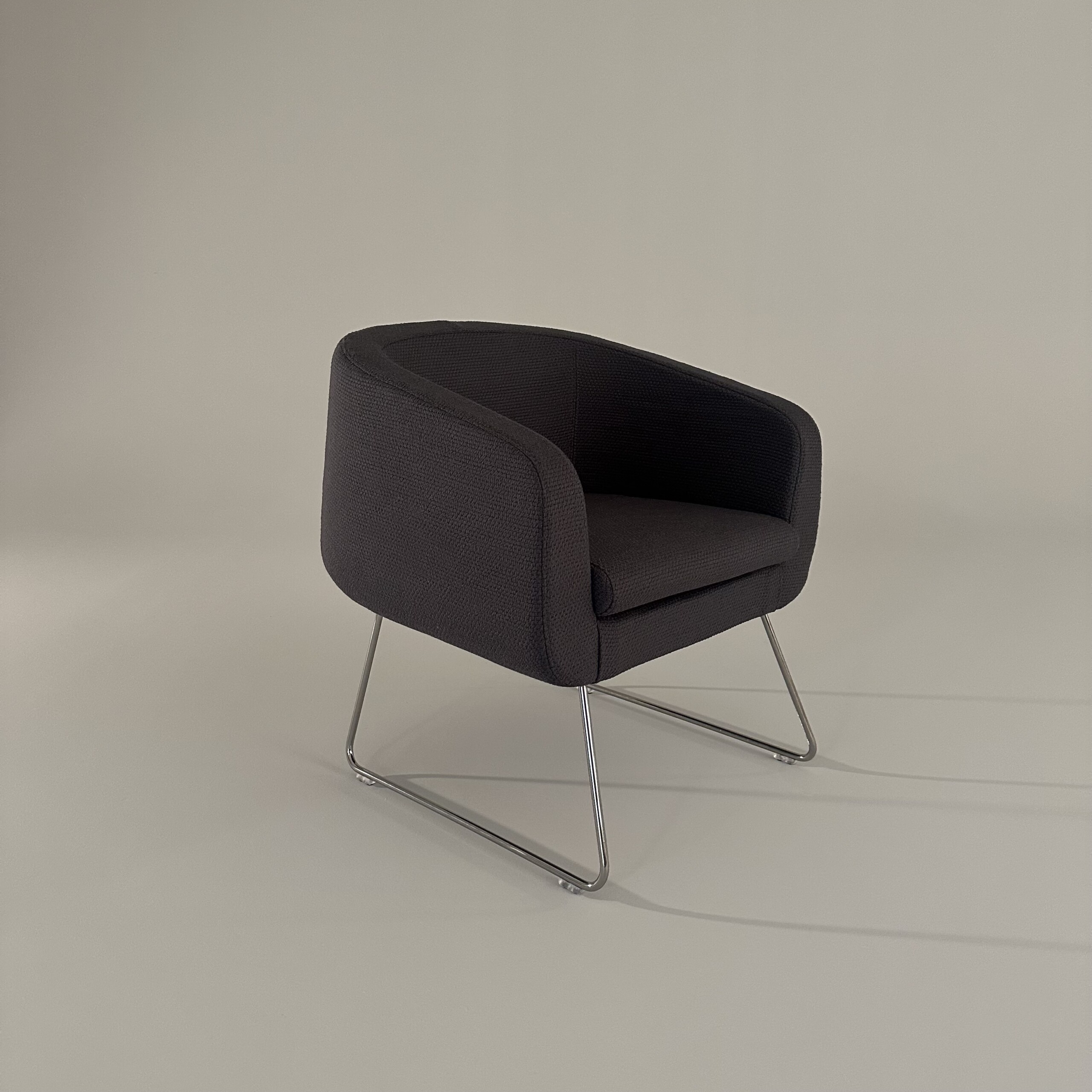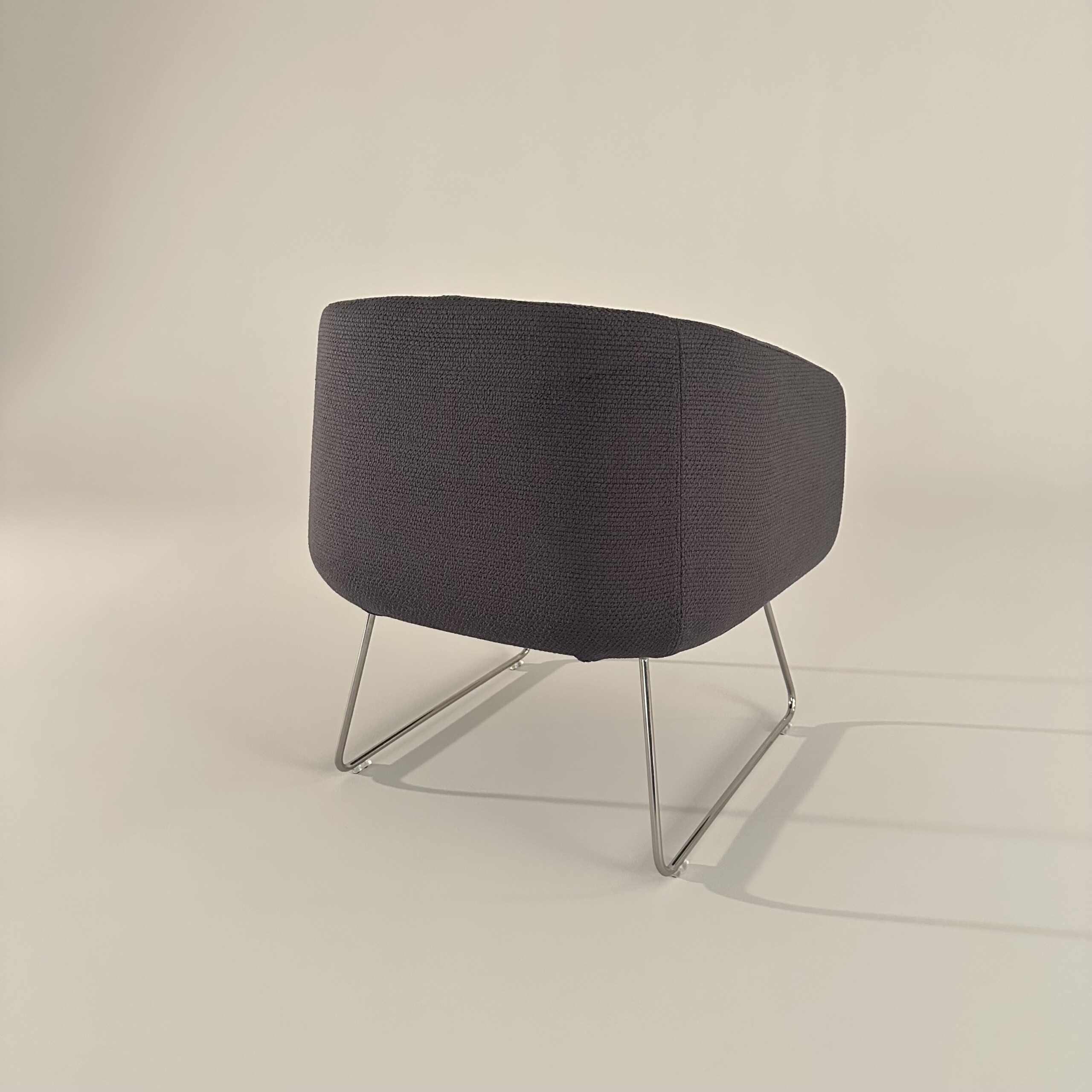 Sæde og ryg i stof (grå). Medestel i metal (krom).
