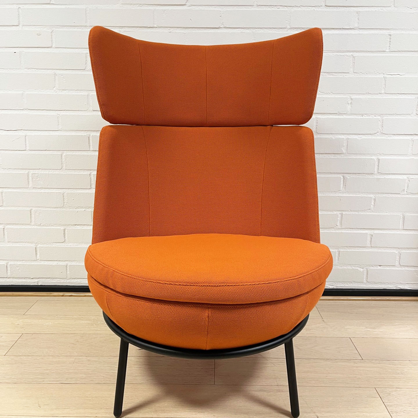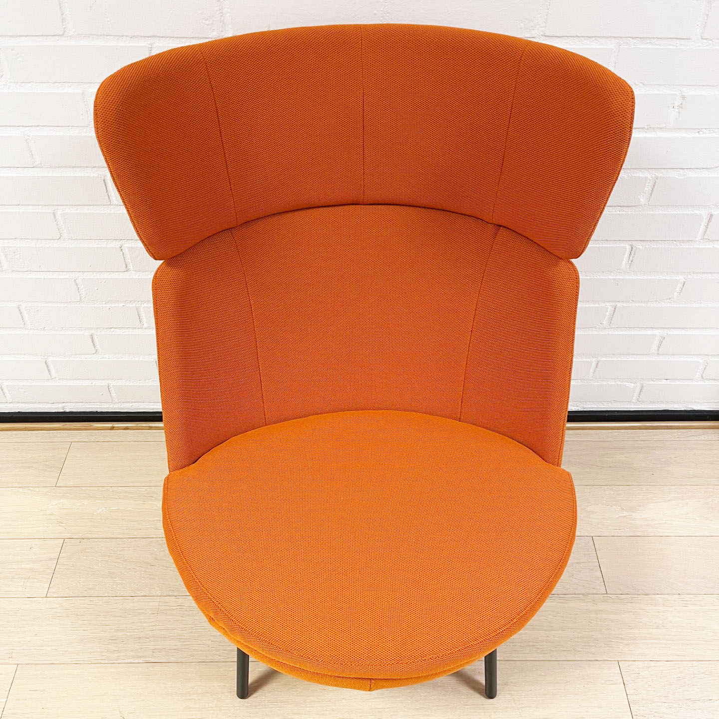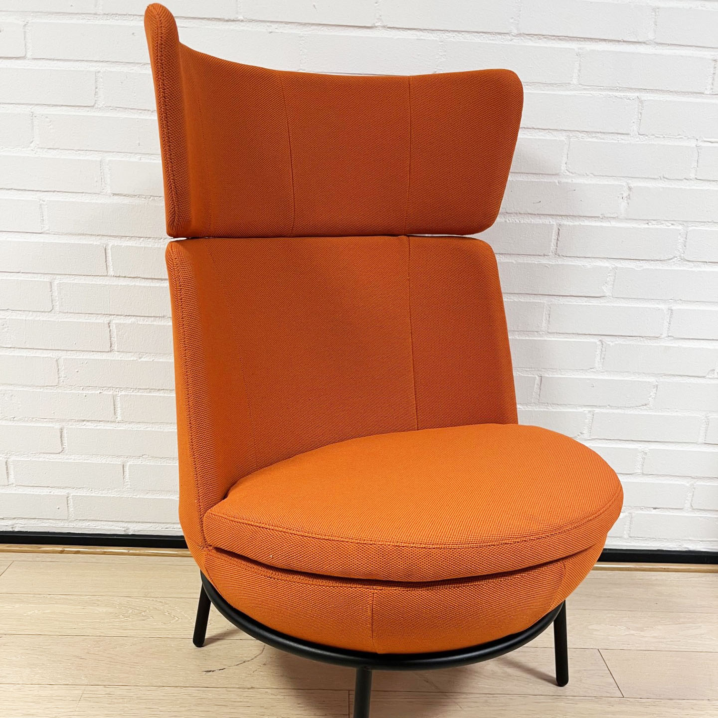 Sæde og ryg i stof (orange). 4-bensstel i metal (sort).