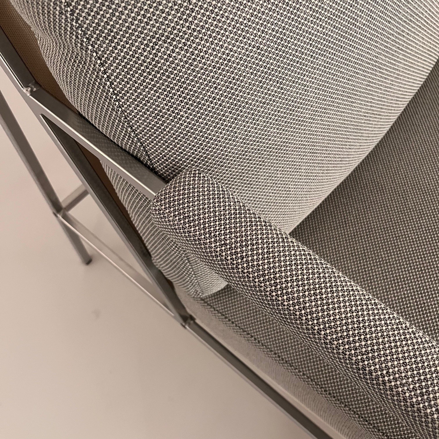 Sæde og ryg i stof (grå). 4-bensstel i metal (sølv).