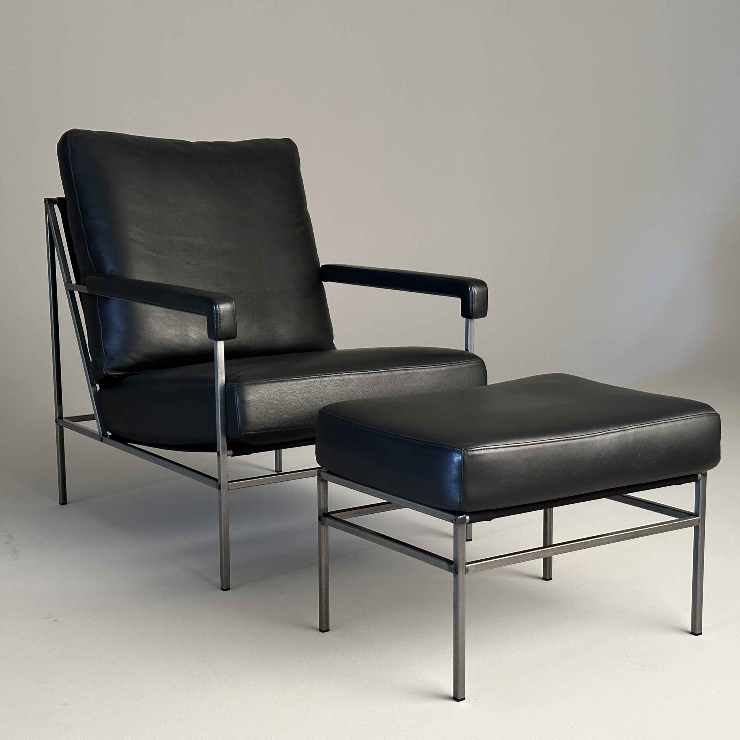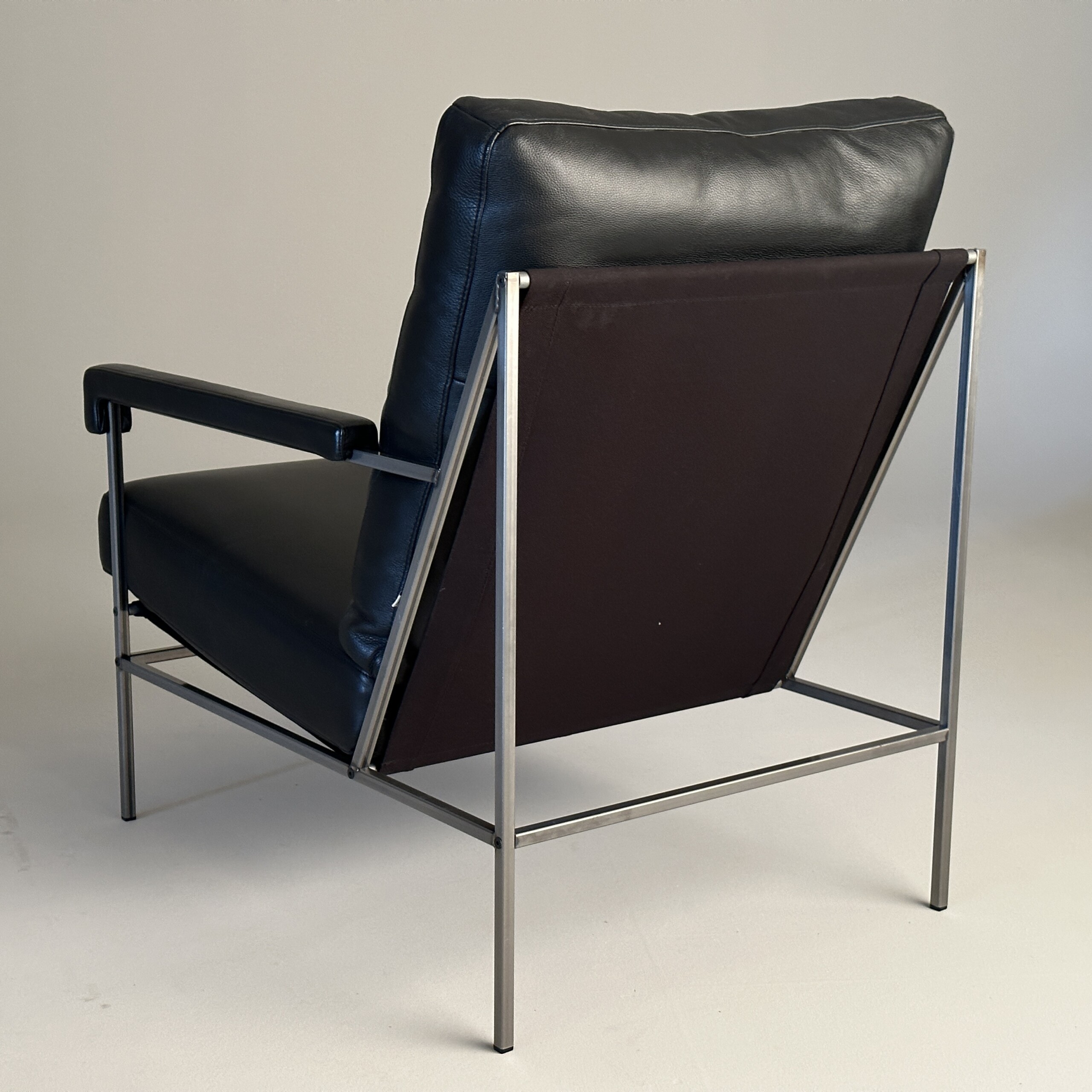 Sæde og ryg i læder (sort). 4-bensstel i metal (grå).