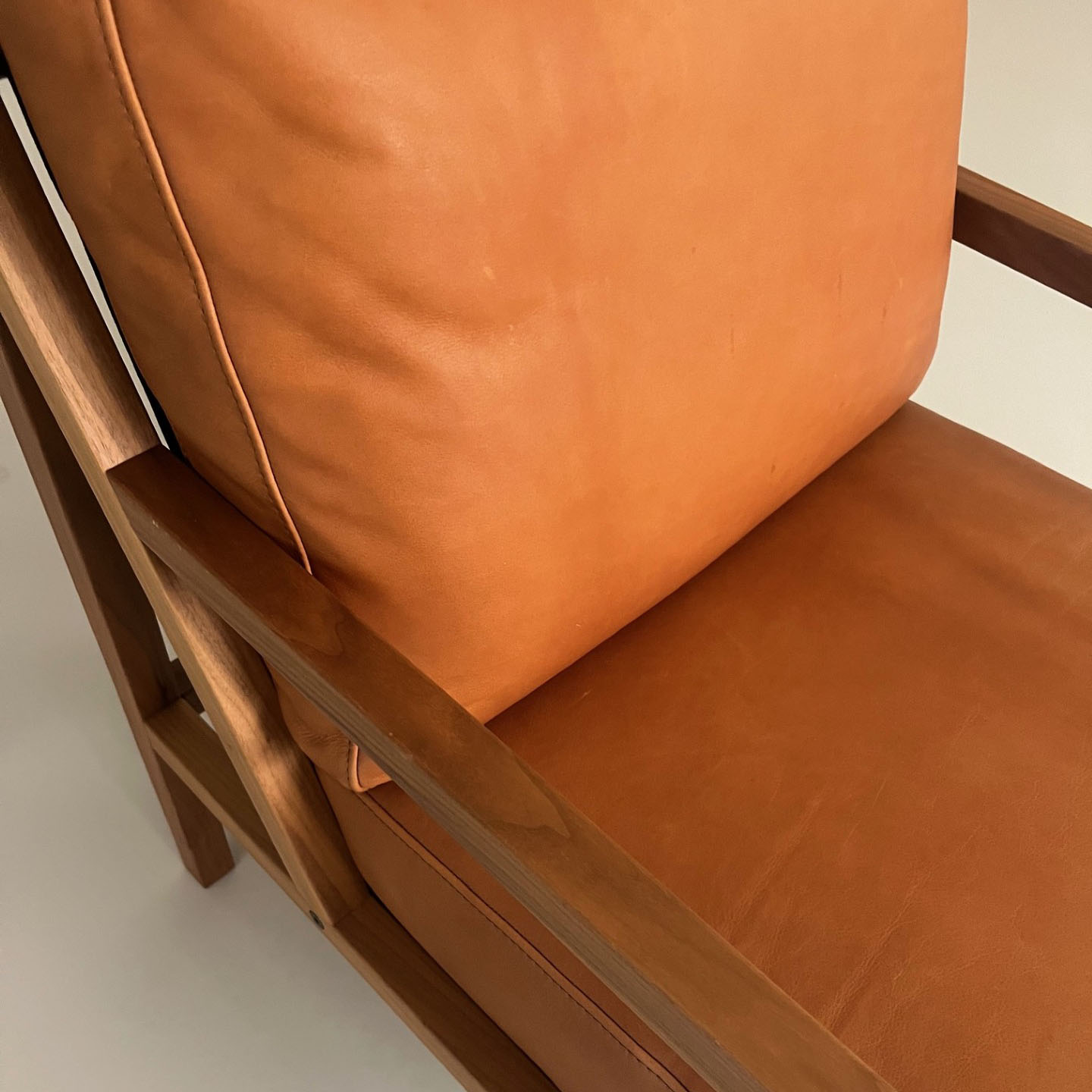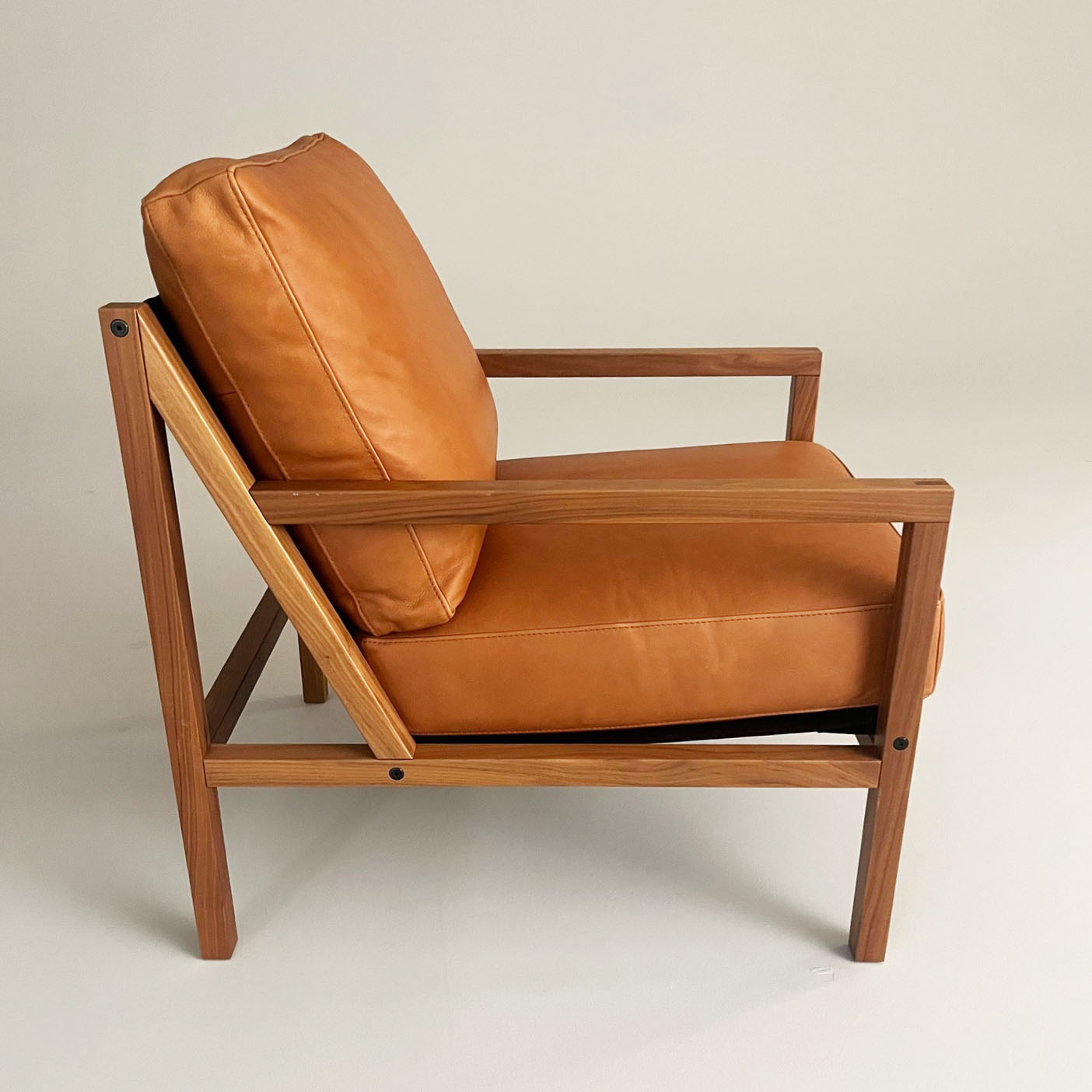Sæde og ryg i kunstlæder (brun). 4-bensstel i træ (valnød).