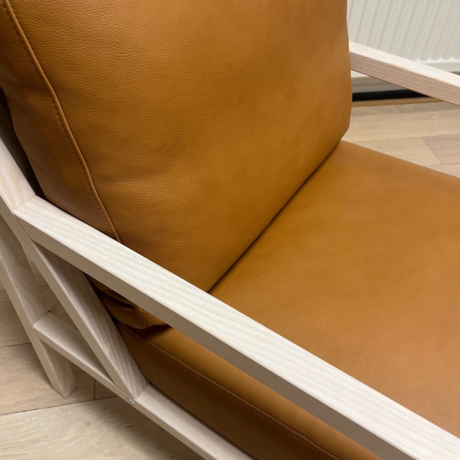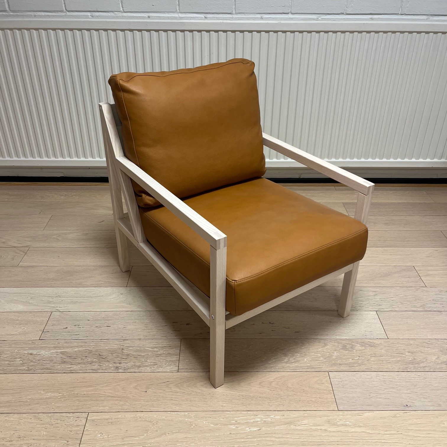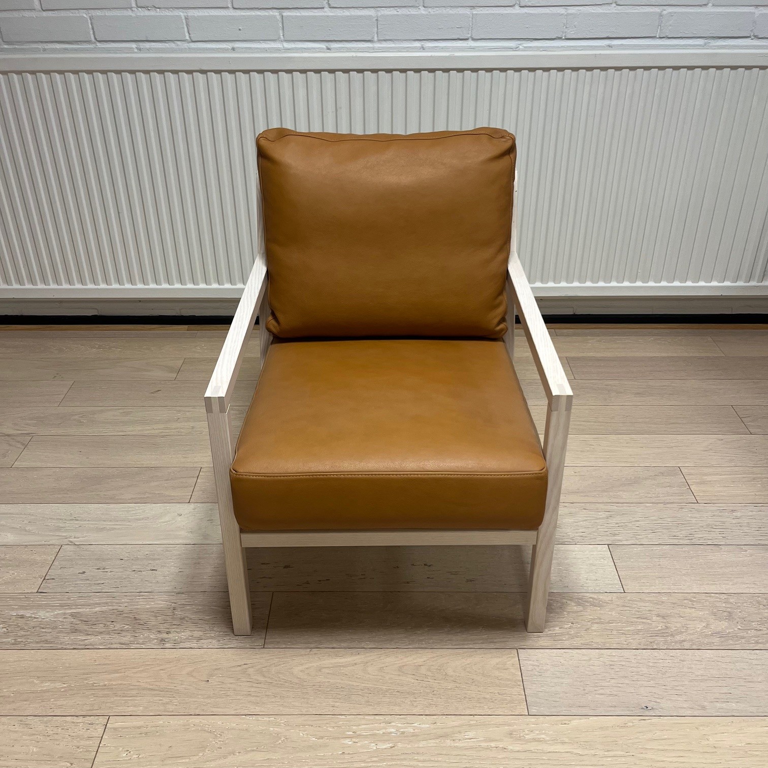 Sæde og ryg i læder (brun). 4-bensstel i træ (ask).