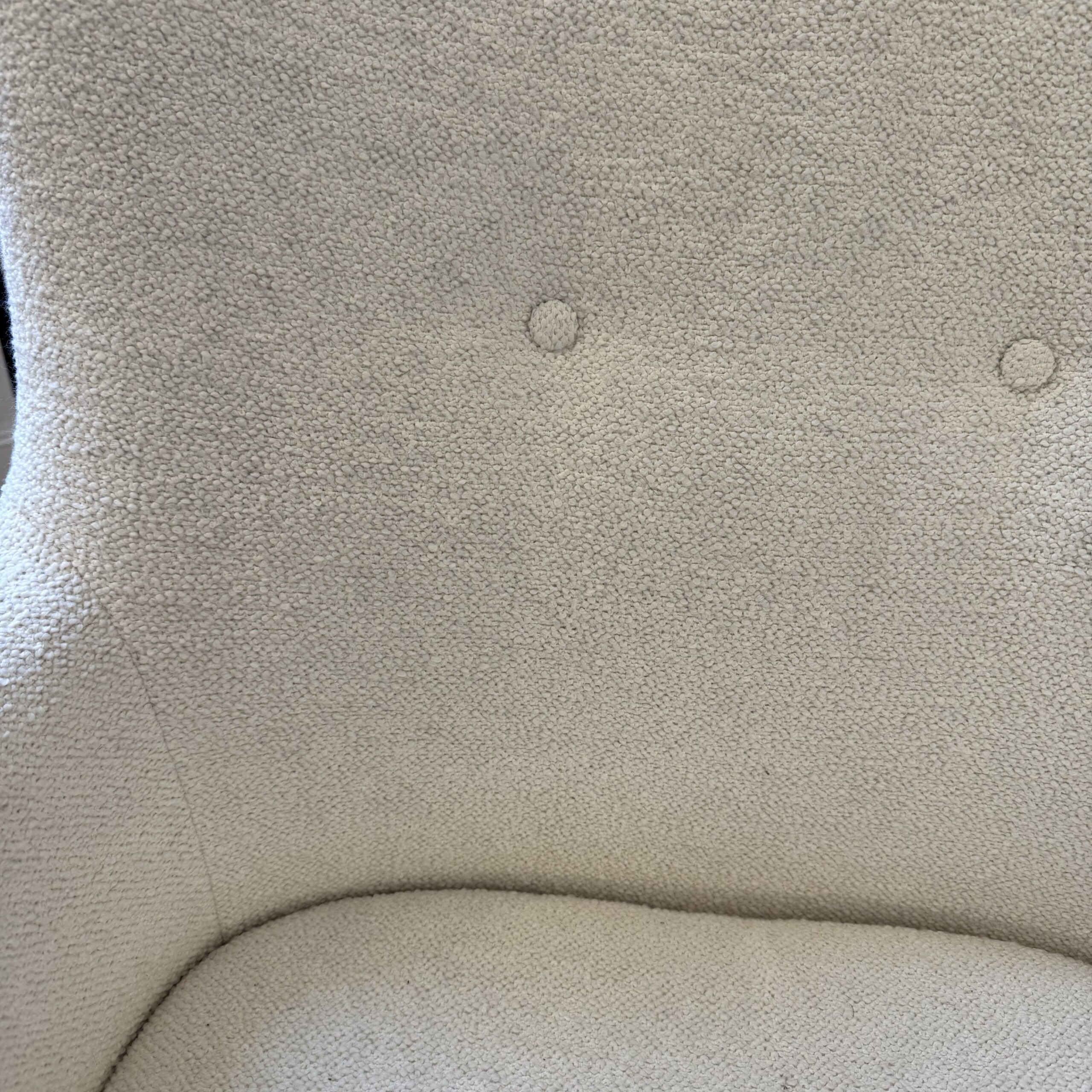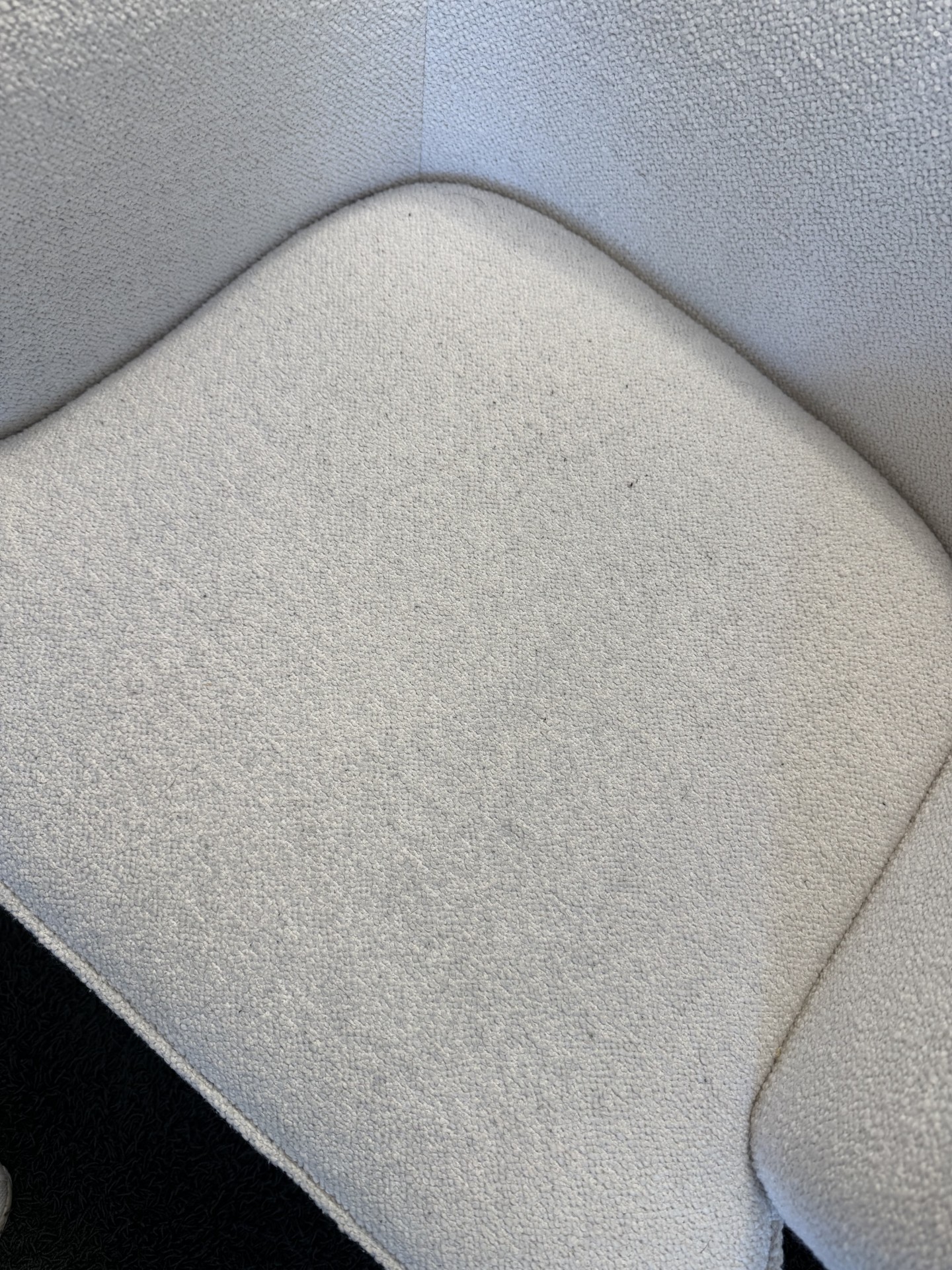 Sæde og ryg i stof (hvid). 4-bensstel i træ (sort).