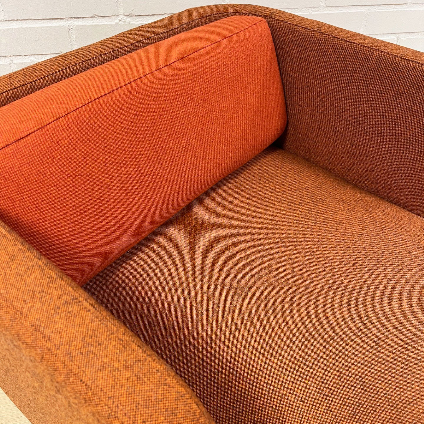 Sæde og ryg i stof (orange). 4-bensstel i træ (eg).