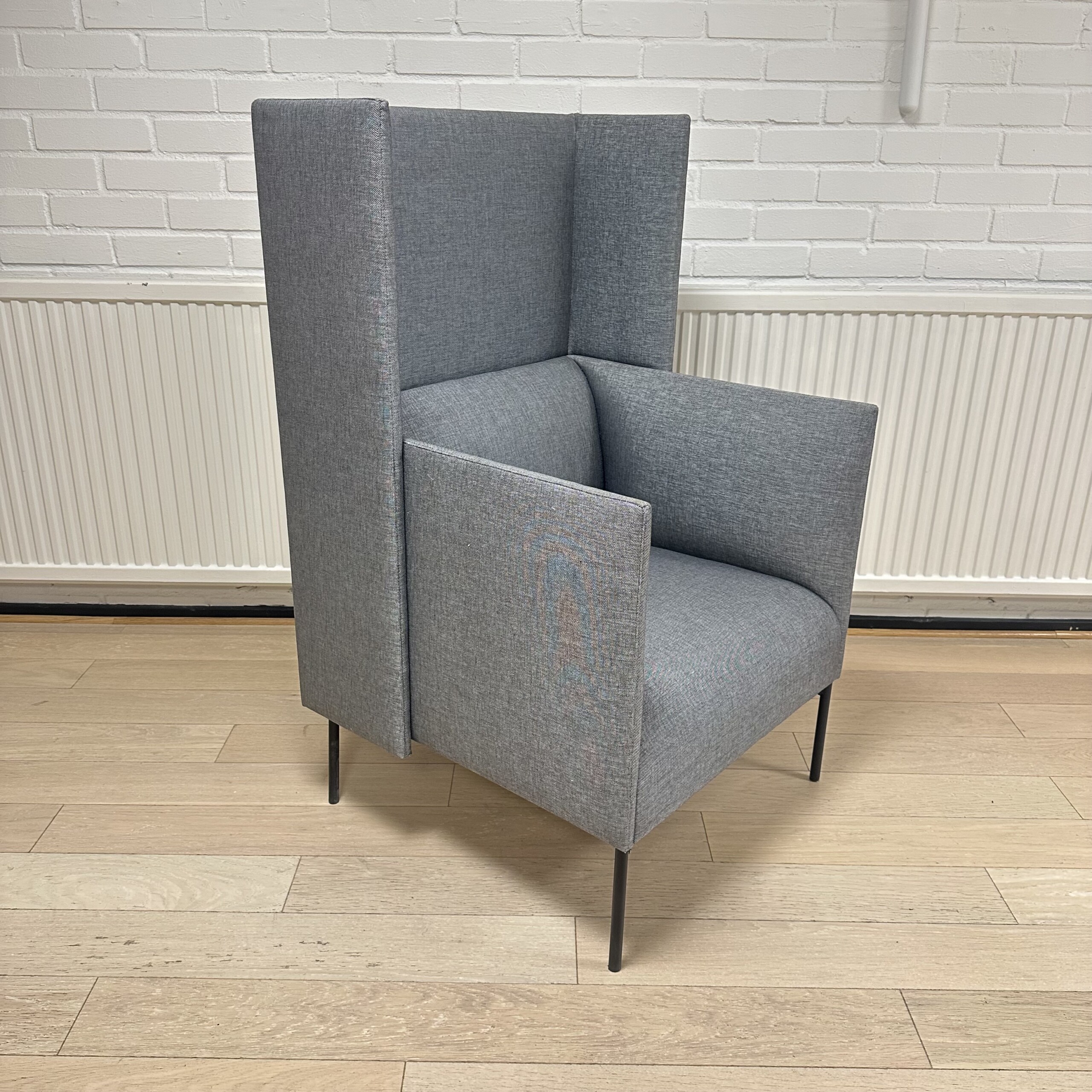 Sæde og ryg i stof (grå). 4-bensstel i metal (sort).