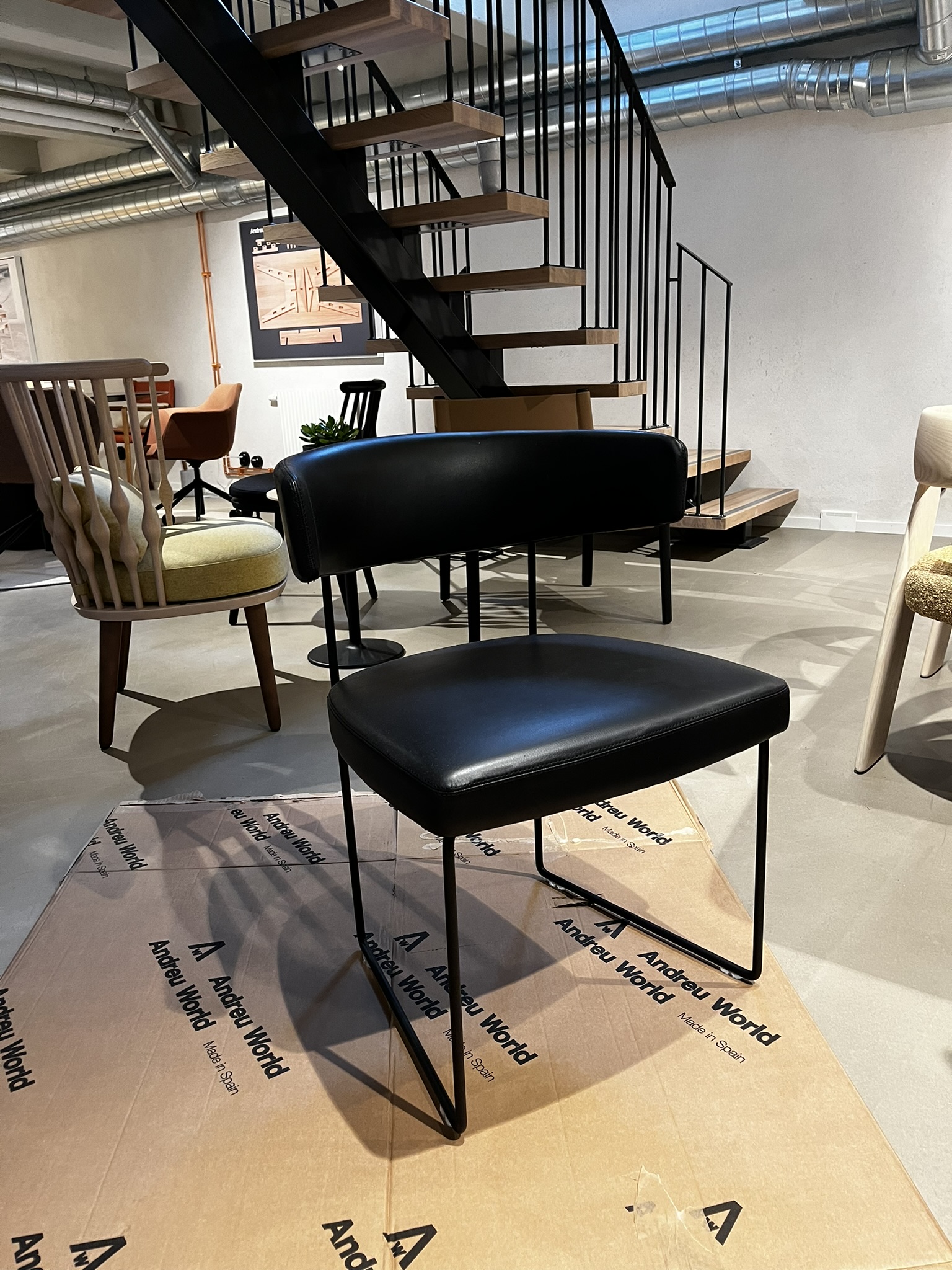 Sæde og ryg i læder (sort). Medestel i metal (sort).