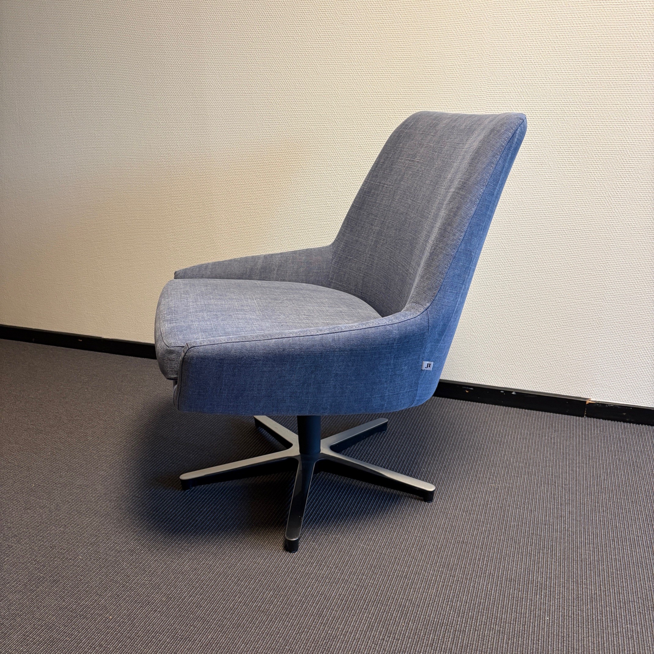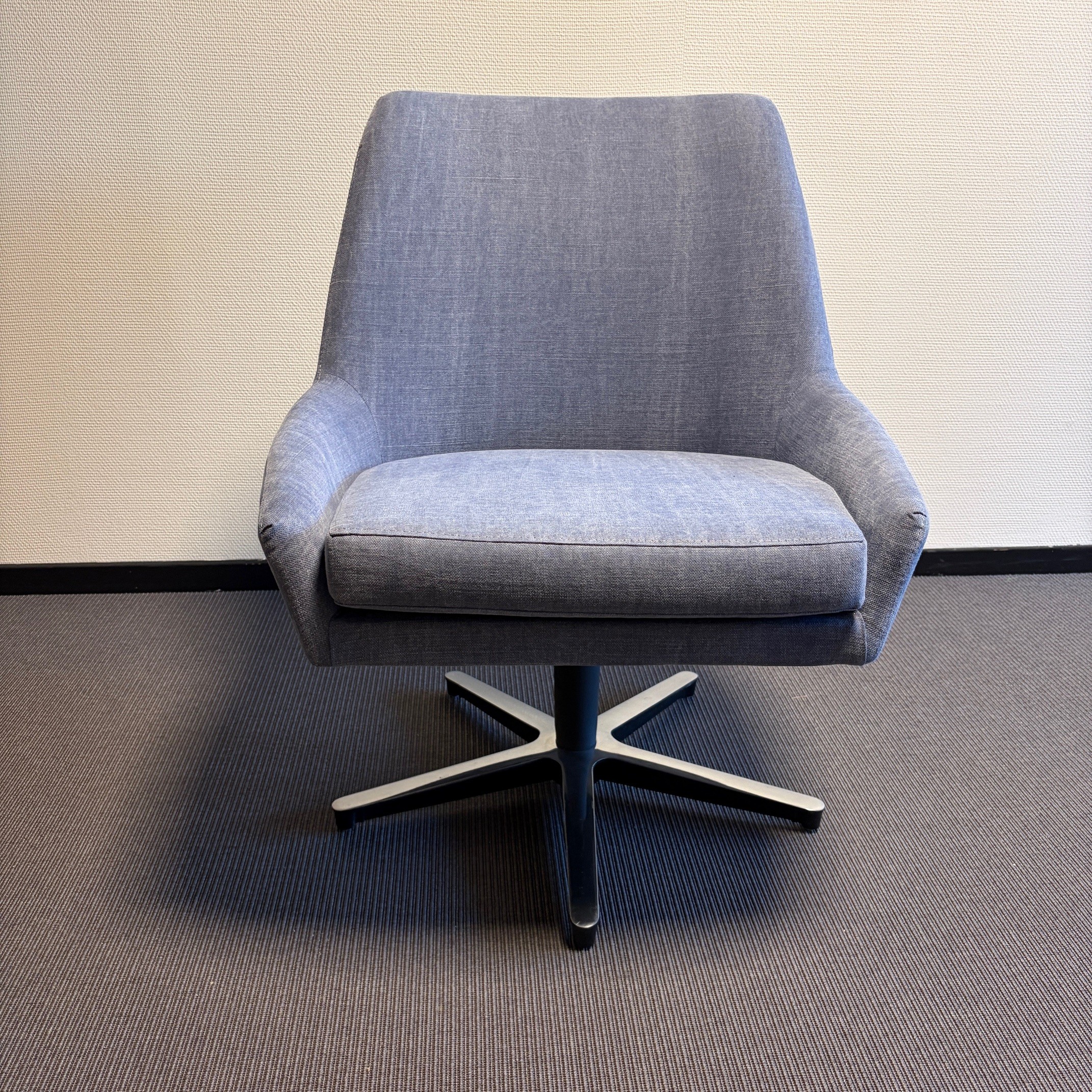 Sæde og ryg i stof (blå). Fodkryds i metal (sølv).